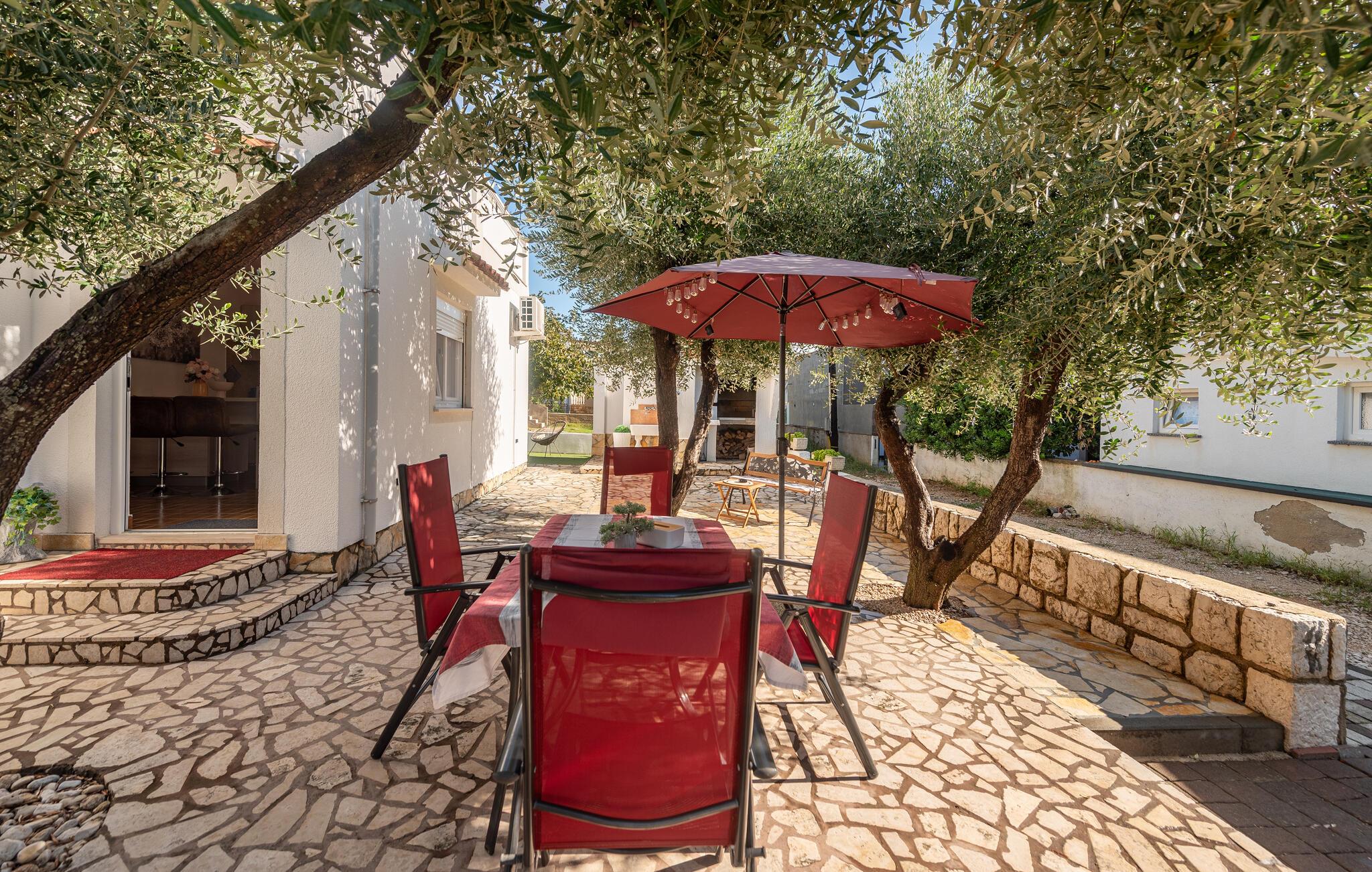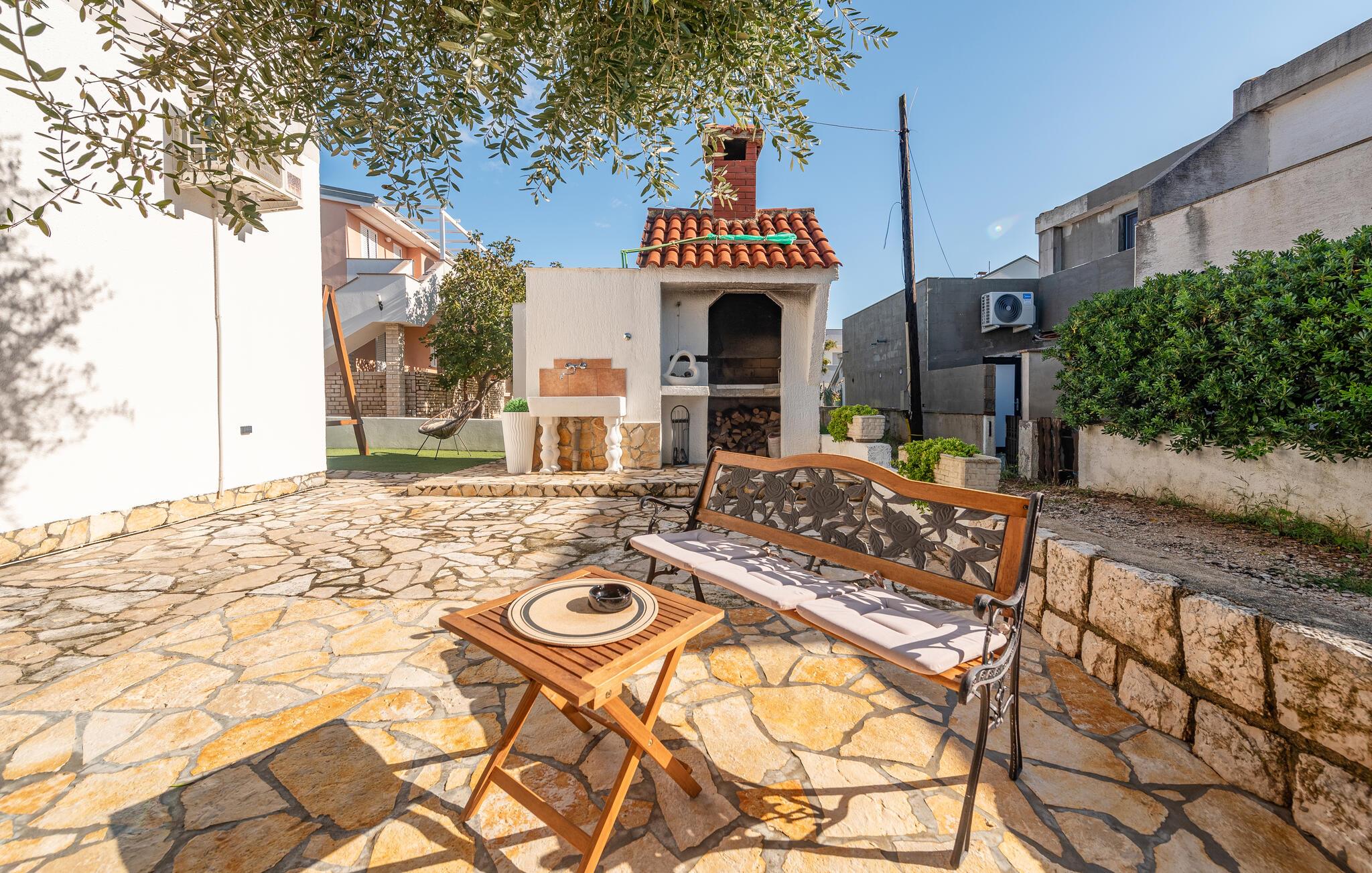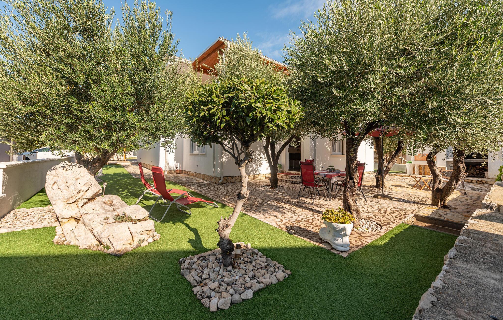 I den attraktive have kan I slappe af på liggestole, mens børnene nyder legefaciliteterne. Udendørsbruseren og grillområdet sikrer perfekte sommerdage. Kun få skridt væk ligger den dejlige stenstrand – ideel til rolige dage ved vandet.