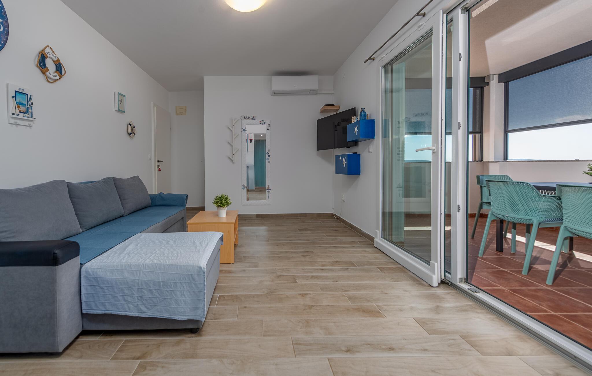 Denne moderne ferielejlighed byder jer velkommen med en venlig indretningsstil, der giver ideelle betingelser for en afslappende ferie. Nyd det åbne opholdsområde, hvor I kan lave mad sammen eller slappe af med en film på den komfortable sofa.