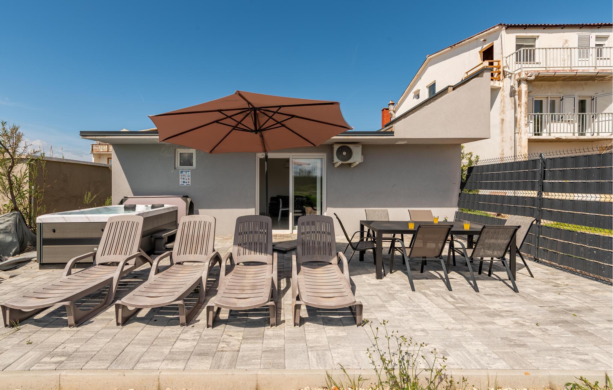Gå barfodet ud på jeres rummelige, åbne terrasse – det optimale sted til en afslappet morgenmad og mange soltimer på liggestolen. Fejr det vidunderlige klima med en dukkert i jeres spabad og hyg jer ved den fælles grill.