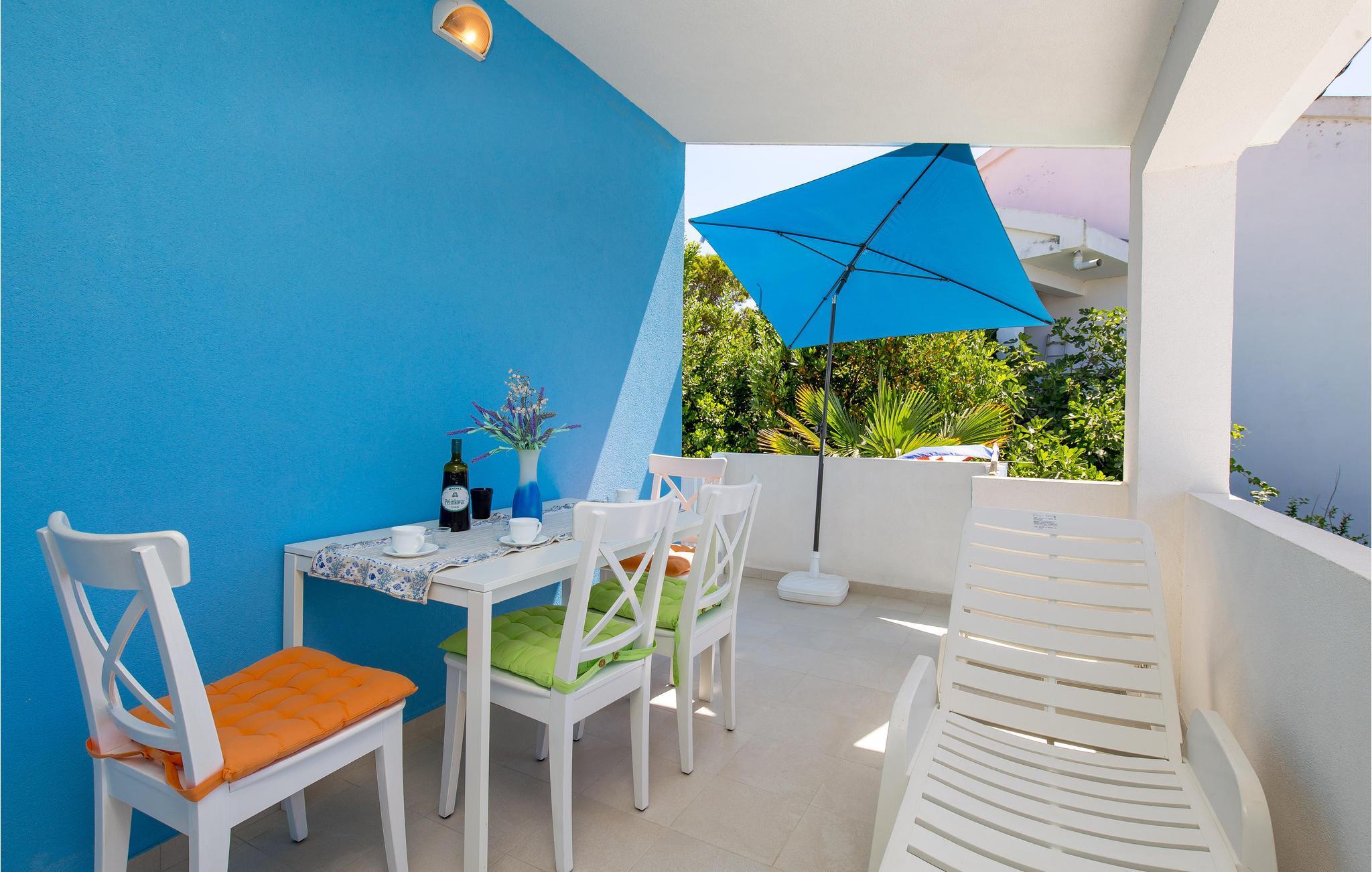 Lejligheden ligger på første sal og har to enkeltsenge i soveværelset samt to ekstra senge i køkken-alrummet, hvilket giver plads til fire personer, der kan tilbringe en dejlig ferie her sammen. Indretningen er både hyggelig og funktionel, så I kommer ikke til at mangle noget. Takket være klimaanlægget er der en behagelig temperatur selv på varme sommerdage.