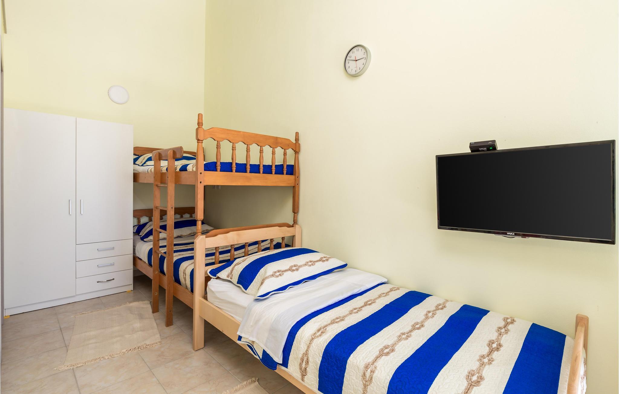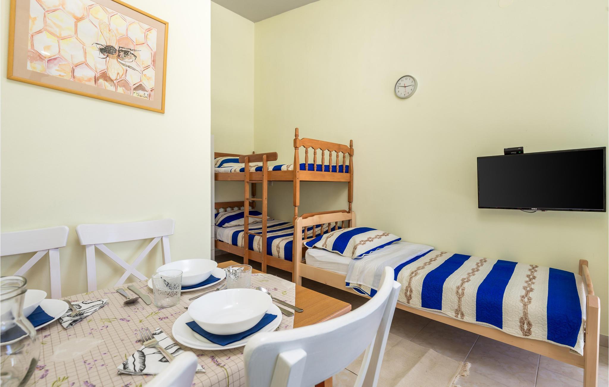 Lejligheden ligger på første sal og har to enkeltsenge i køkken-alrummet, hvilket giver plads til en dejlig ferie for to. Indretningen er både hyggelig og funktionel, så I kommer ikke til at mangle noget. Takket være klimaanlægget er der en behagelig temperatur selv på varme sommerdage.
