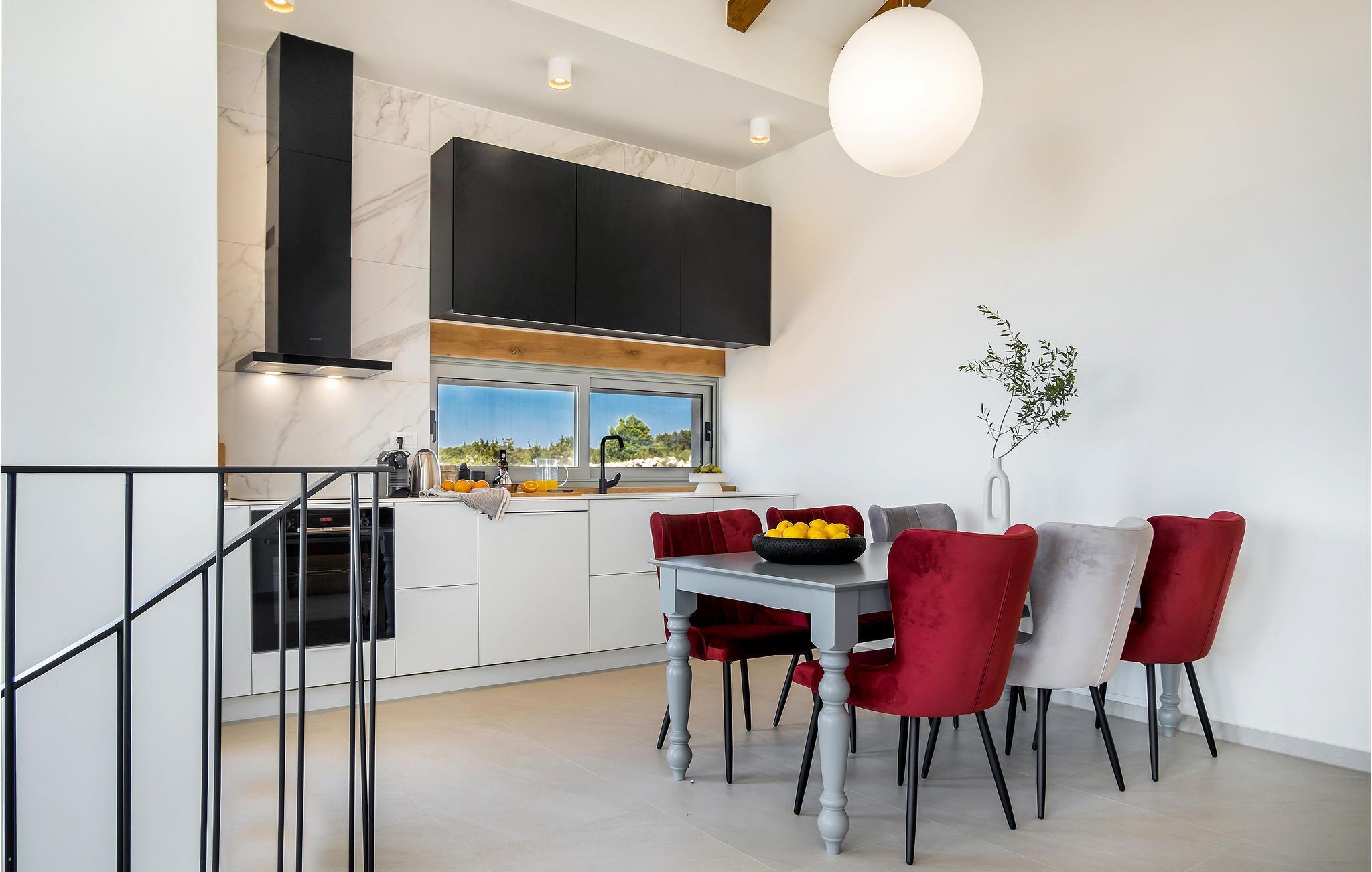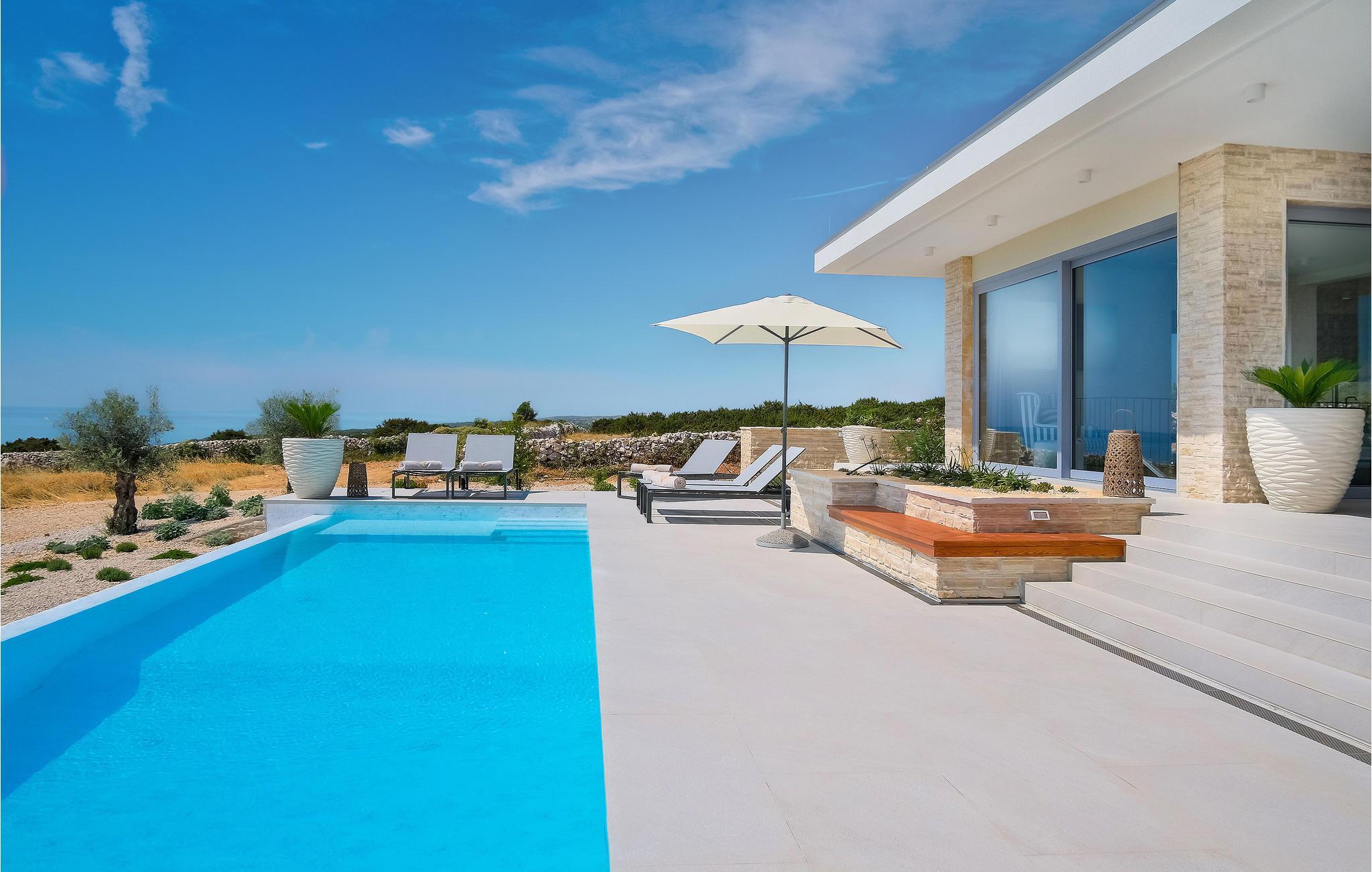 Dette store hus har en fantastisk beliggenhed på øen Pag. Indenfor kan I se frem til en velindrettet og indbydende bolig med gennemtænkte løsninger og materialer af høj kvalitet. Tilbered jeres ferieretter i det attraktive køkken, mens I kaster et blik på omgivelserne eller slapper af på sofaen med en god bog og den smukke udsigt. Hvis I får brug for at køle ned, er der kun få skridt til poolen. Aktivitetsrummet giver jer mulighed for at snuppe et spil billard eller læne jer tilbage med en drink i sofaen.