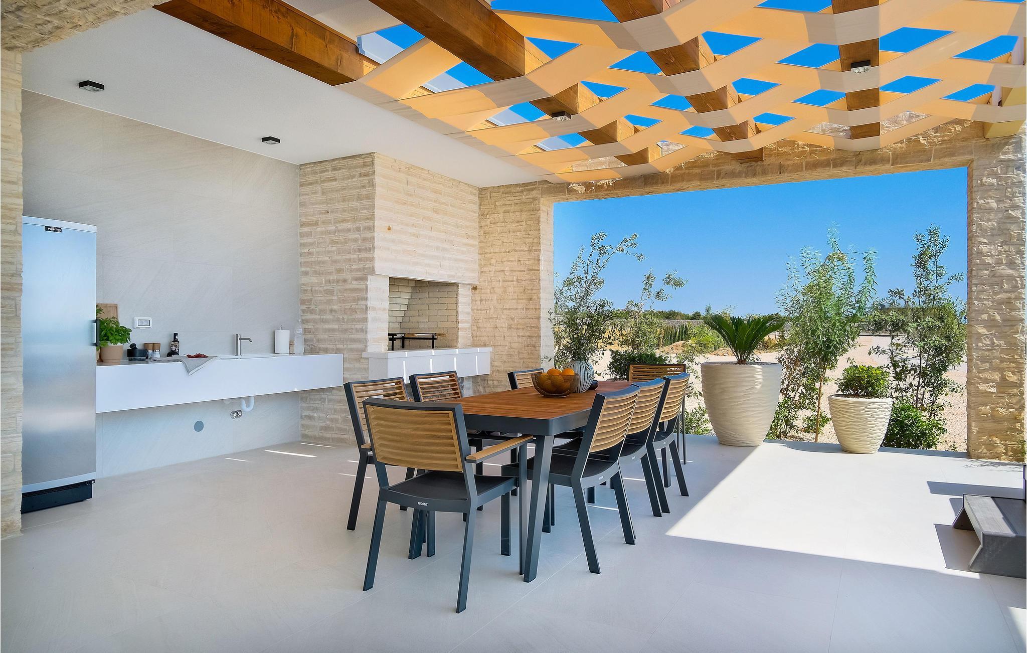 Huset tager sig flot ud både inde og ude. Svøm et par runder i poolen om morgenen og tilbring nogle afslappende timer i loungemøblerne eller på liggestolene under parasollen i løbet af dagen. I kan også glæde jer til det lækre udekøkken og jeres middage rundt om havebordet med havet som kulisse. Slut dagen af med en tur i spabad, inden I gør jer klar til en ny dag på farten.