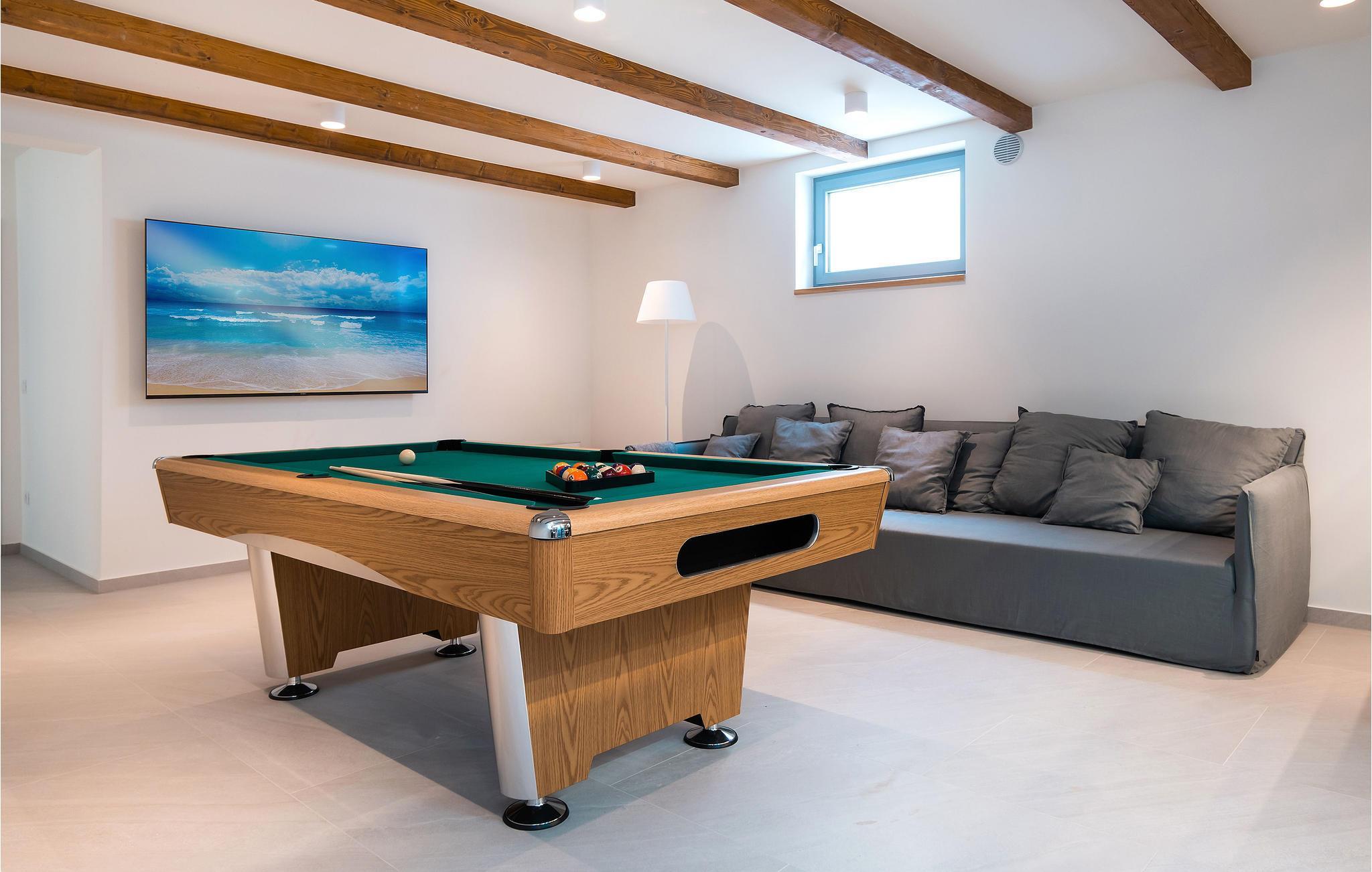 Dette store hus har en fantastisk beliggenhed på øen Pag. Indenfor kan I se frem til en velindrettet og indbydende bolig med gennemtænkte løsninger og materialer af høj kvalitet. Tilbered jeres ferieretter i det attraktive køkken, mens I kaster et blik på omgivelserne eller slapper af på sofaen med en god bog og den smukke udsigt. Hvis I får brug for at køle ned, er der kun få skridt til poolen. Aktivitetsrummet giver jer mulighed for at snuppe et spil billard eller læne jer tilbage med en drink i sofaen.