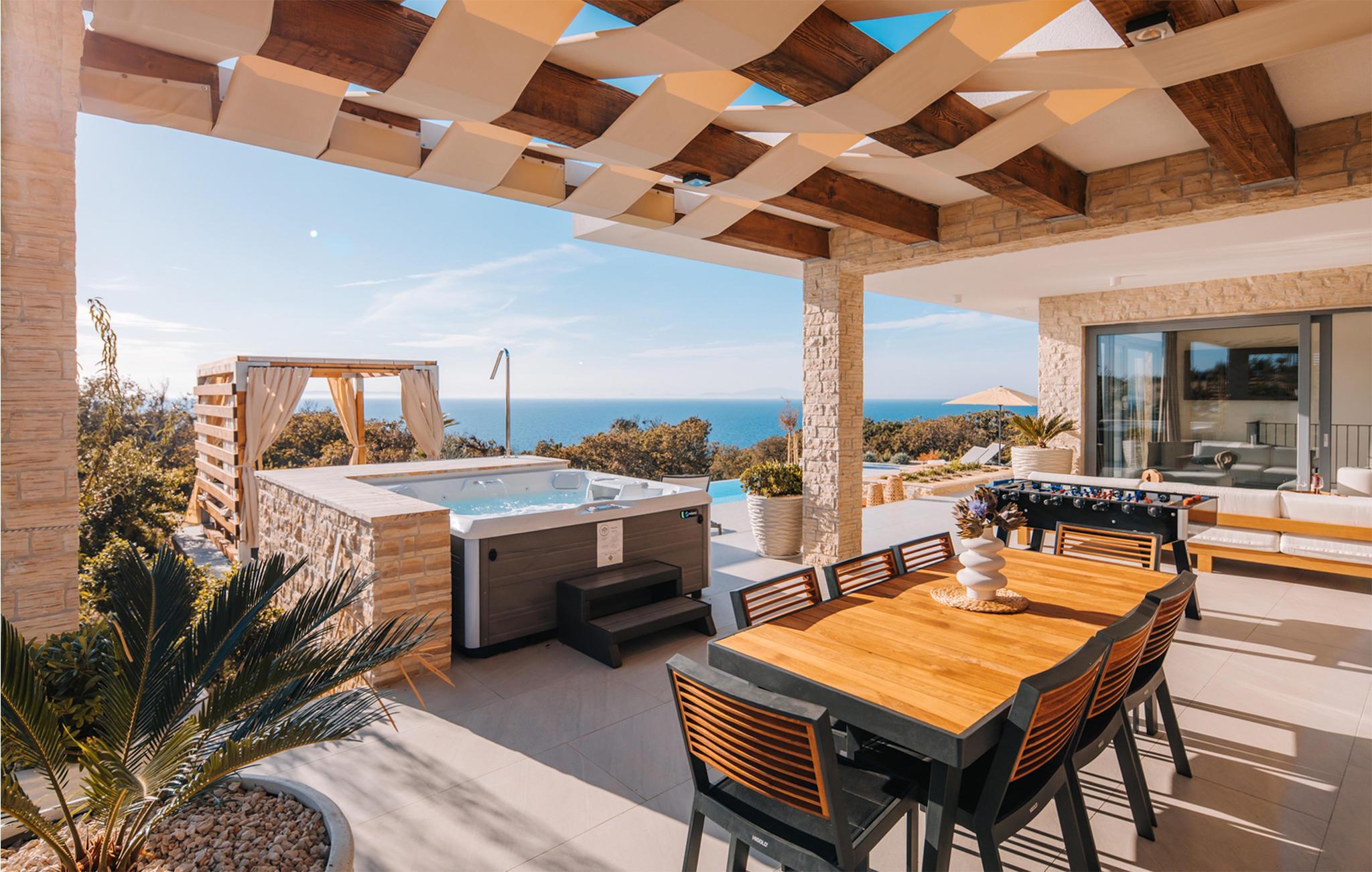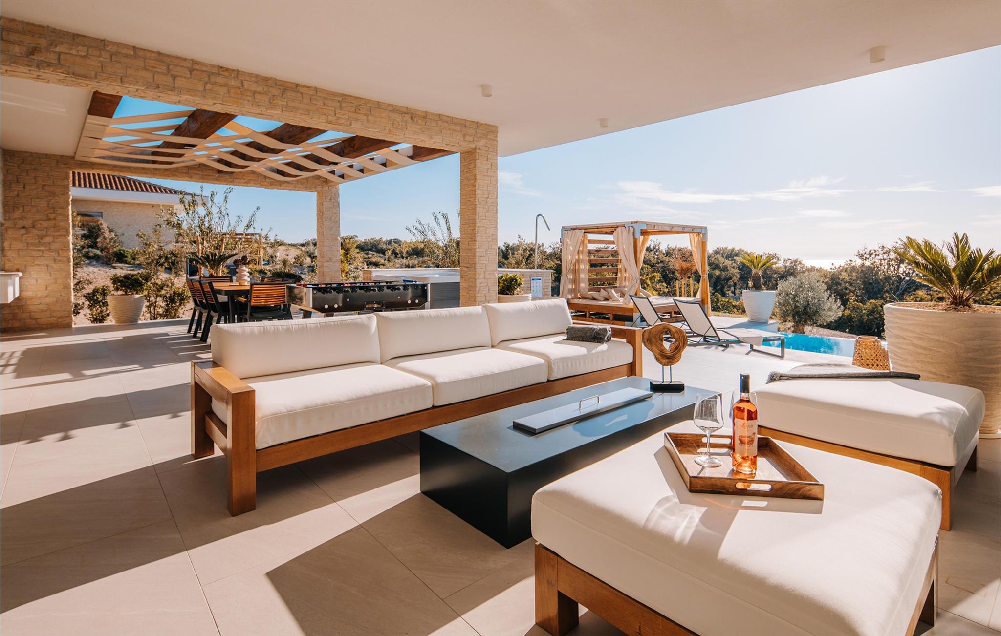 Ikke kun interiøret, men også det ydre gør et overbevisende indtryk. Svøm en omgang i poolen om morgenen og tilbring afslappende timer i loungemøblerne eller på liggestolene under parasollen om dagen. Udnyt det smukke udekøkken og tilbring mange glade timer i spisepladsen med havet som kulisse. Det udendørs spabad er det perfekte sted for en stemningsfuld afslutning på dagen.