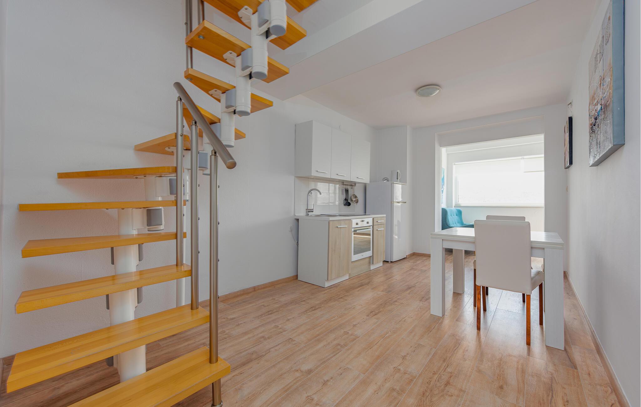 På første sal finder I den udendørs pool, med bekvemme liggestol og parasoller og en fantastisk udsigt over havet. Stueplan og første sal er forbundet med en udendørs trappe og laveste loftshøjde på øverste etage er 110 cm.