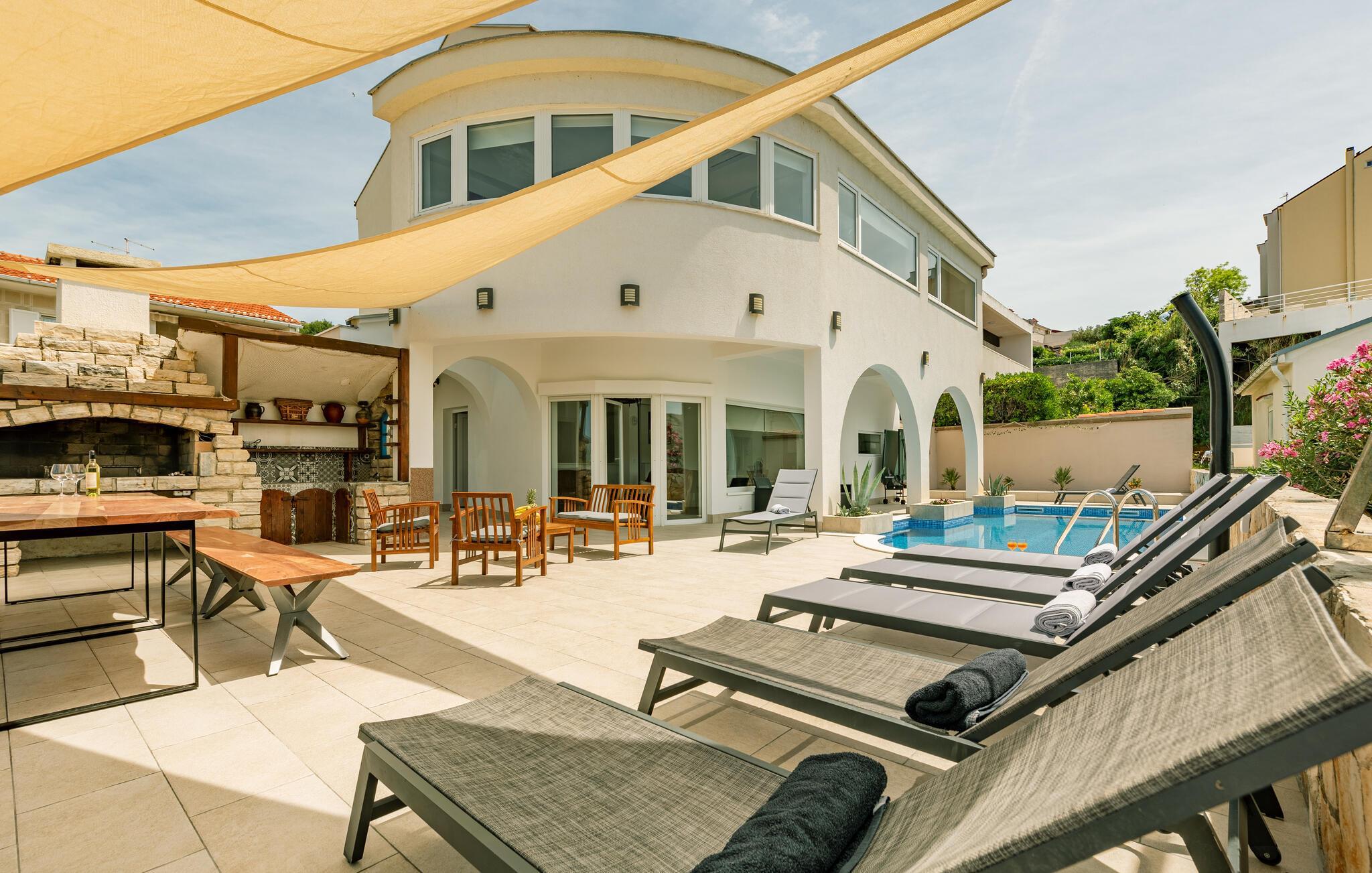Dette moderne indrettede feriehus med pool ligger lige i nærheden af stranden.