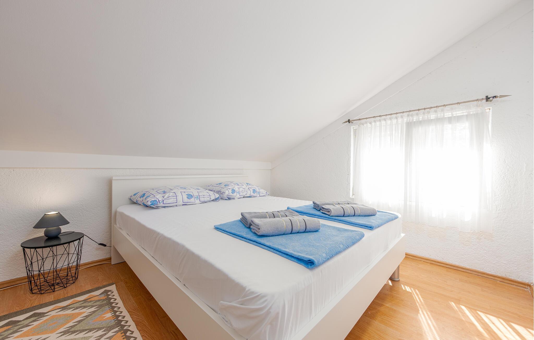 Denne praktisk indrettede ferielejlighed ligger på øverste etage i en privat ejendom og rummer køkken, badeværelse, to soveværelser og en lille terrasse med havudsigt. Haven er omgivet af mediterrane planter og som giver en dejlig atmosfære. Den lille landsby Potocnica er præget af fantastiske sandstrande og krystalklart havvand, her kan I holde en ferie, hvor I hurtigt glemmer alt om hverdagens trængsler. Der er heller ikke langt til byen Novalja, med mange butikker, restauranter etc. og med et underholdende natteliv, hvor I kan slutte morskaben når solen går op, med at bade fra den berømte Zrce strand. Laveste lofthøjde i siden er ca. 80 cm. I samme hus ligger CKP268.