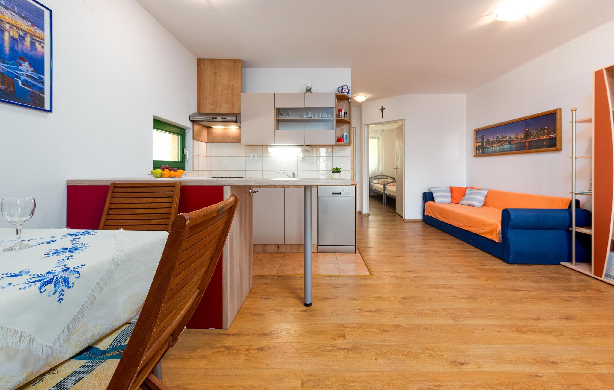 I den lille by Potocnica, på øen Pag, ligger dette hus med tre ferielejligheder. På første sal ligger den større lejlighed CKP391 med en pragtfuld overdækket terrasse, og på anden sal ligger CKP392 og CKP393. Gå en tur til den lille bugt, hvor der ligger en godt gemt strand. Øen Pag rummer mange facetter, ikke blot gastronomiske specialiteter, men også en interessant kultur og tradition. Pager kniplinger, der også kaldes ’Det hvide guld’, er med på UNESCOs liste for sin unikke kvalitet. Ved stranden Zrce kan I danse natten lang, til musikken fra DJs der kommer fra hele verden for at afspille elektronisk musik.