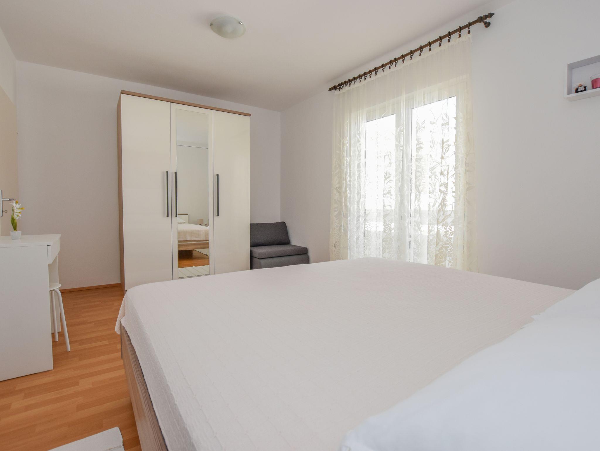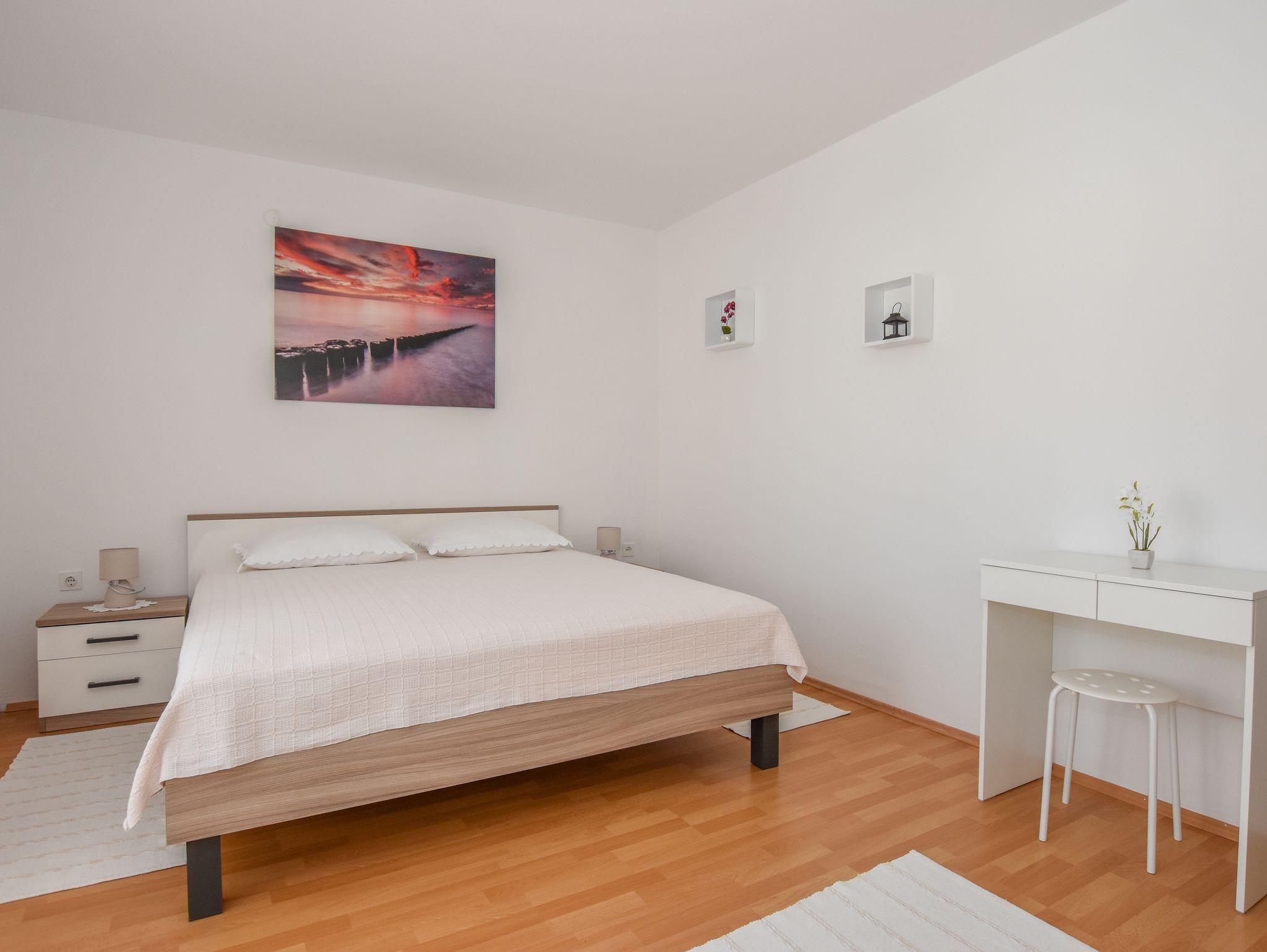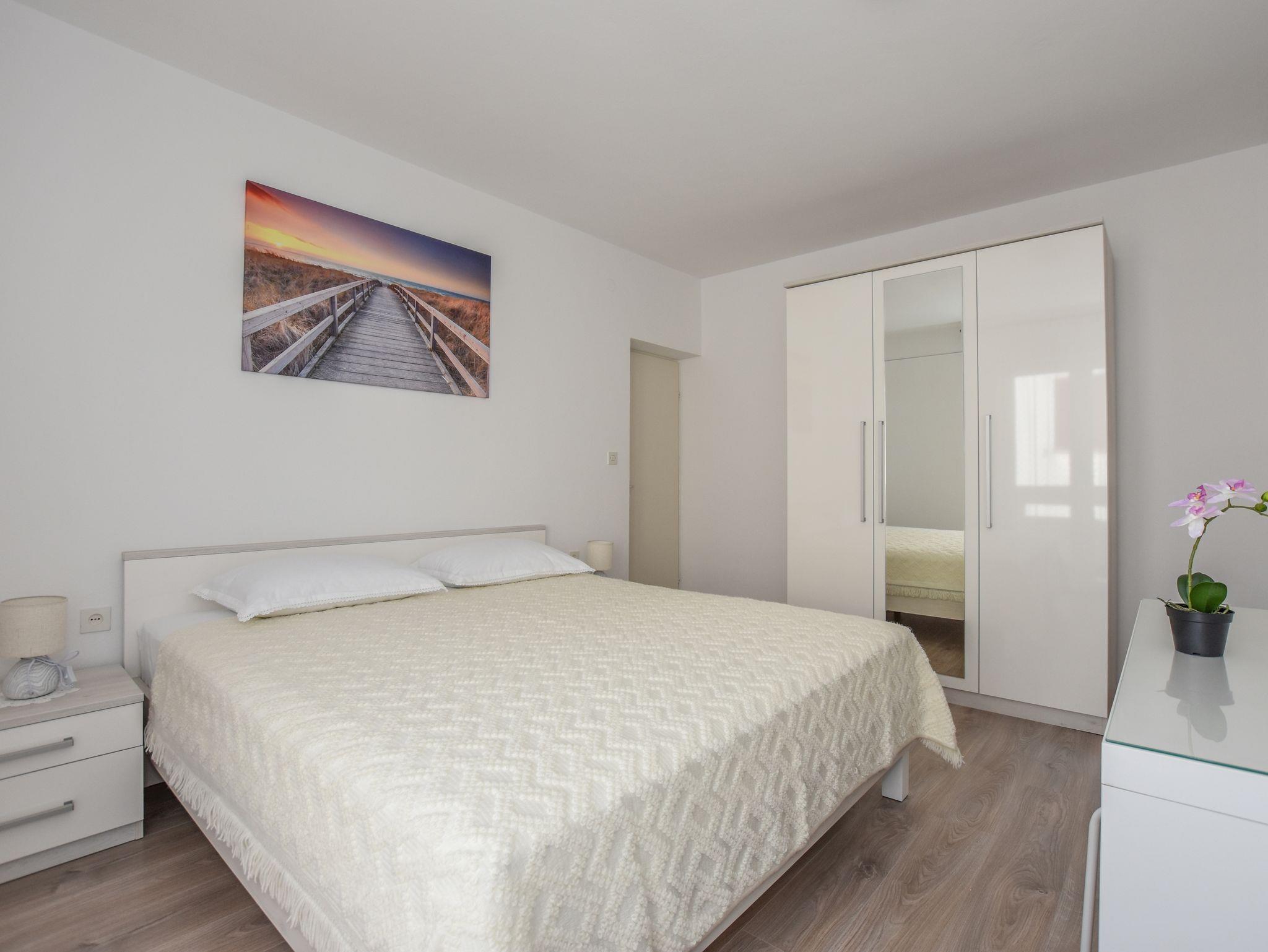Ferienwohnung bietet Platz für 5 Gäste. Die Betten sind in Schlafzimmern, die es 2 gibt, innerhalb einer Gesamtfläche von 58m2, angeordnet. Die Gäste haben eine eigene Terrasse zur Verfügung, auf der sie in warmen Sommernächten genießen können. Das Apartment bietet Meerblick. Es ist erlaubt, Speisen auf dem Gemeinschafts-Grill vorzubereiten. IM PREIS INBEGRIFFEN: Kurtaxe, Endreinigung, Klimatisierung, Parkplatz, Internet, Kinderbett, Föhn. VERBINDLICHE ZUSÄTZLICHE KOSTEN: Aufzahlung für Kurzaufenthalte (prozentualer Zuschlag pro Nächtigungsanzahl: 30% - 1, 20% - 2, 10% - 3). Die Verfügbarkeit zusätzlicher Dienstleistungen in Ihrem reservierten Termin und die Preise derselben (falls nicht aufgeführt) müssen im Voraus überprüft werden. Zusätzliche Dienstleistungen die in der Zahlungsaufforderung nicht aufgeführt sind werden direkt beim Vermieter bezahlt, angenommen der Gast nutzt auch diese.