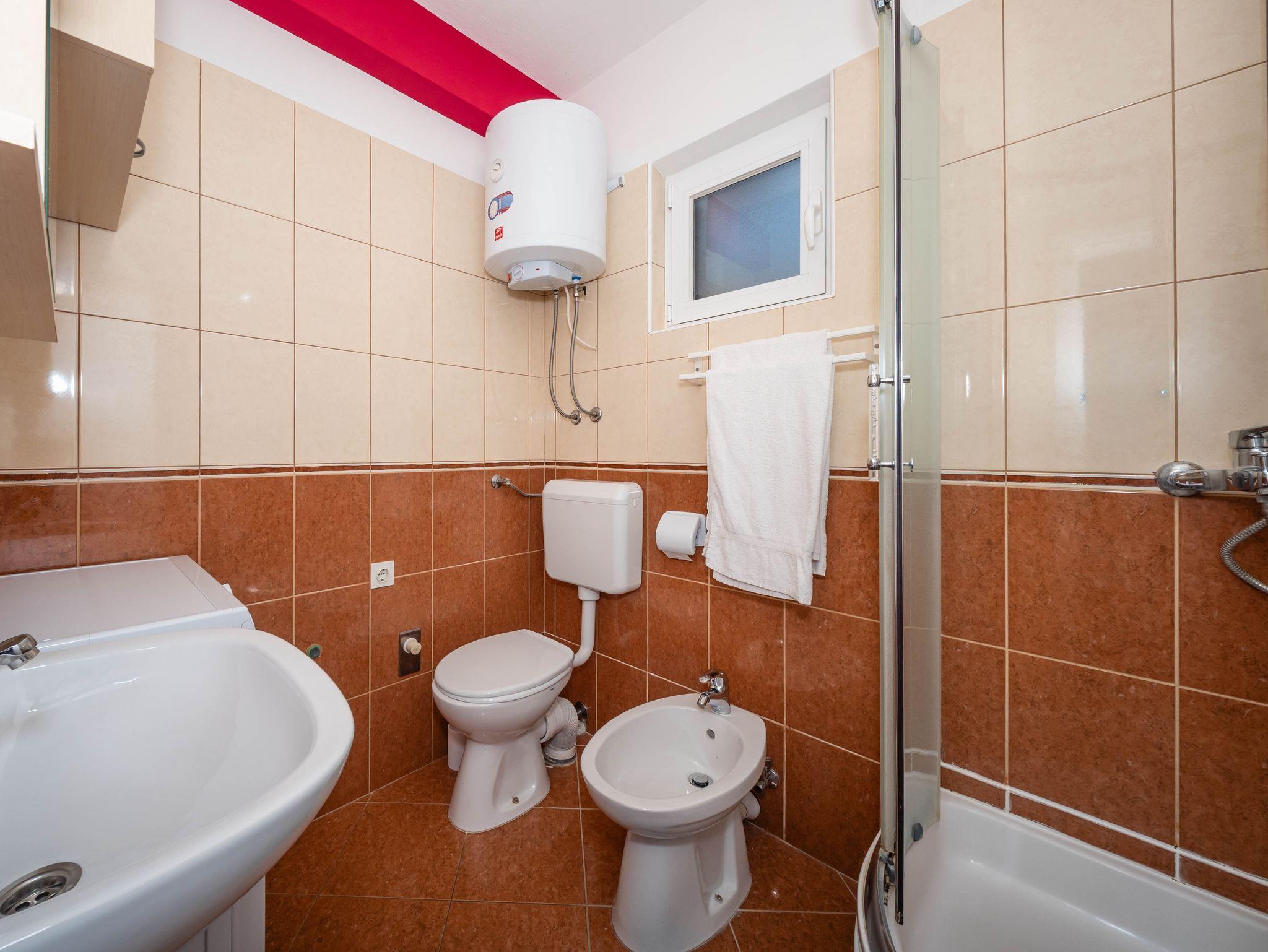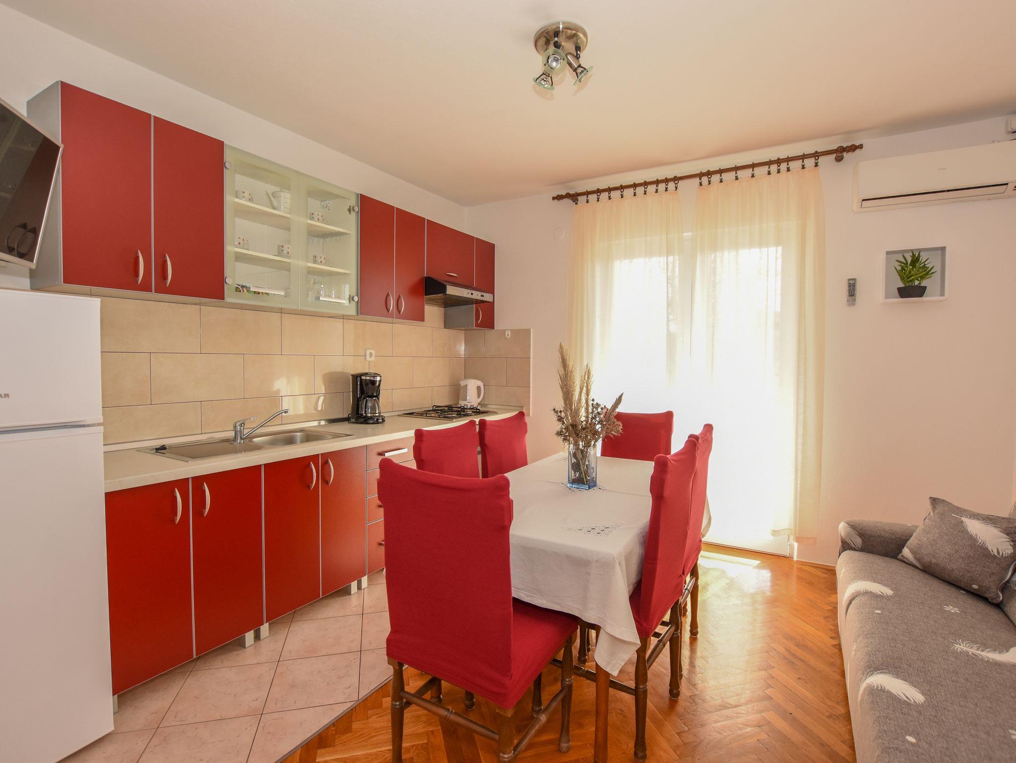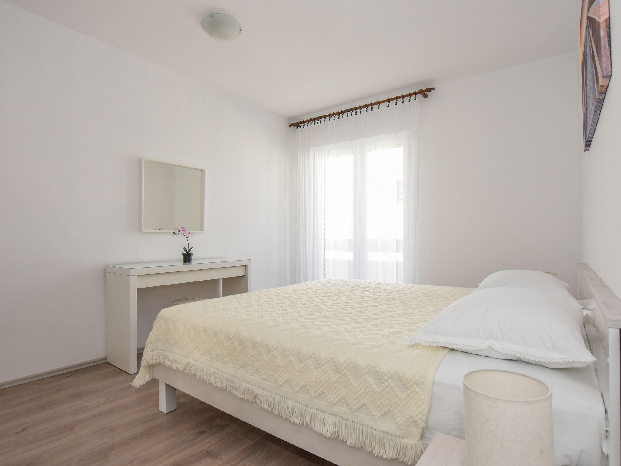 Ferienwohnung bietet Platz für 5 Gäste. Die Betten sind in Schlafzimmern, die es 2 gibt, innerhalb einer Gesamtfläche von 58m2, angeordnet. Die Gäste haben eine eigene Terrasse zur Verfügung, auf der sie in warmen Sommernächten genießen können. Das Apartment bietet Meerblick. Es ist erlaubt, Speisen auf dem Gemeinschafts-Grill vorzubereiten. IM PREIS INBEGRIFFEN: Kurtaxe, Endreinigung, Klimatisierung, Parkplatz, Internet, Kinderbett, Föhn. VERBINDLICHE ZUSÄTZLICHE KOSTEN: Aufzahlung für Kurzaufenthalte (prozentualer Zuschlag pro Nächtigungsanzahl: 30% - 1, 20% - 2, 10% - 3). Die Verfügbarkeit zusätzlicher Dienstleistungen in Ihrem reservierten Termin und die Preise derselben (falls nicht aufgeführt) müssen im Voraus überprüft werden. Zusätzliche Dienstleistungen die in der Zahlungsaufforderung nicht aufgeführt sind werden direkt beim Vermieter bezahlt, angenommen der Gast nutzt auch diese.
