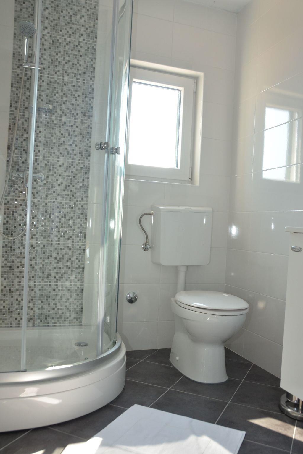 The house newly built in 2016 has two floors and provides a total living space of 80m² for five people. The ground floor measures 43m² and consists of a modern shower room and a living room with an integrated kitchen. The kitchen adjoining the dining room is equipped with an oven, an induction hob, a dishwasher and a fridge. The sitting corner next to the dining table has a sofa bed for one person and a flatscreen TV. Internal stairs lead to the upper floor with the two bedrooms and a further modern shower room. One bedroom is furnished with a cupboard, a dresser and a double bed 180cm wide and also has a balcony. The second bedroom has a double bed 180cm wide, a cupboard and a dresser. There is one air conditioning unit in the house. Free wireless Internet access is available.