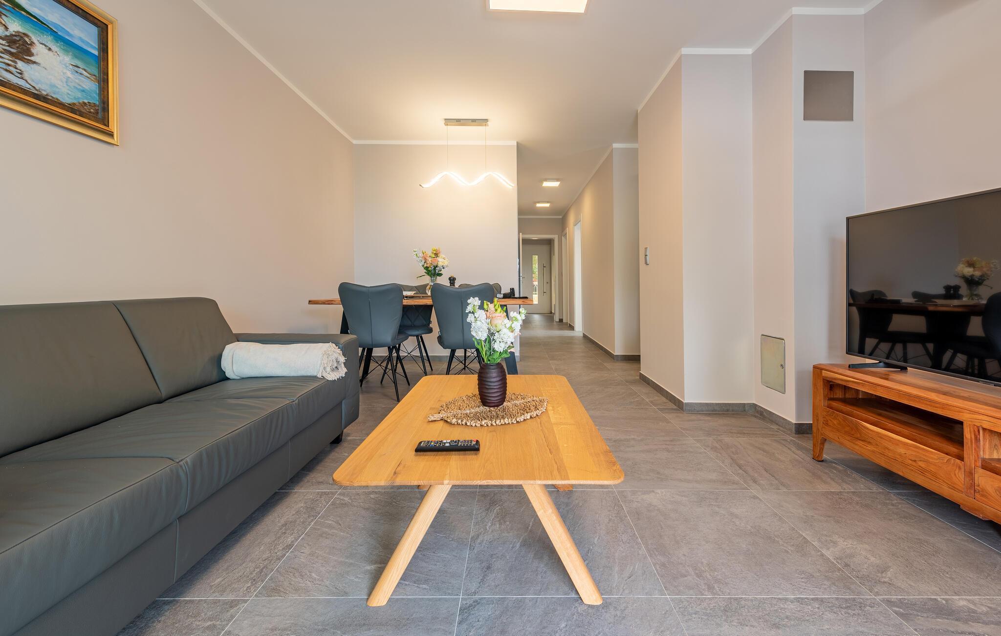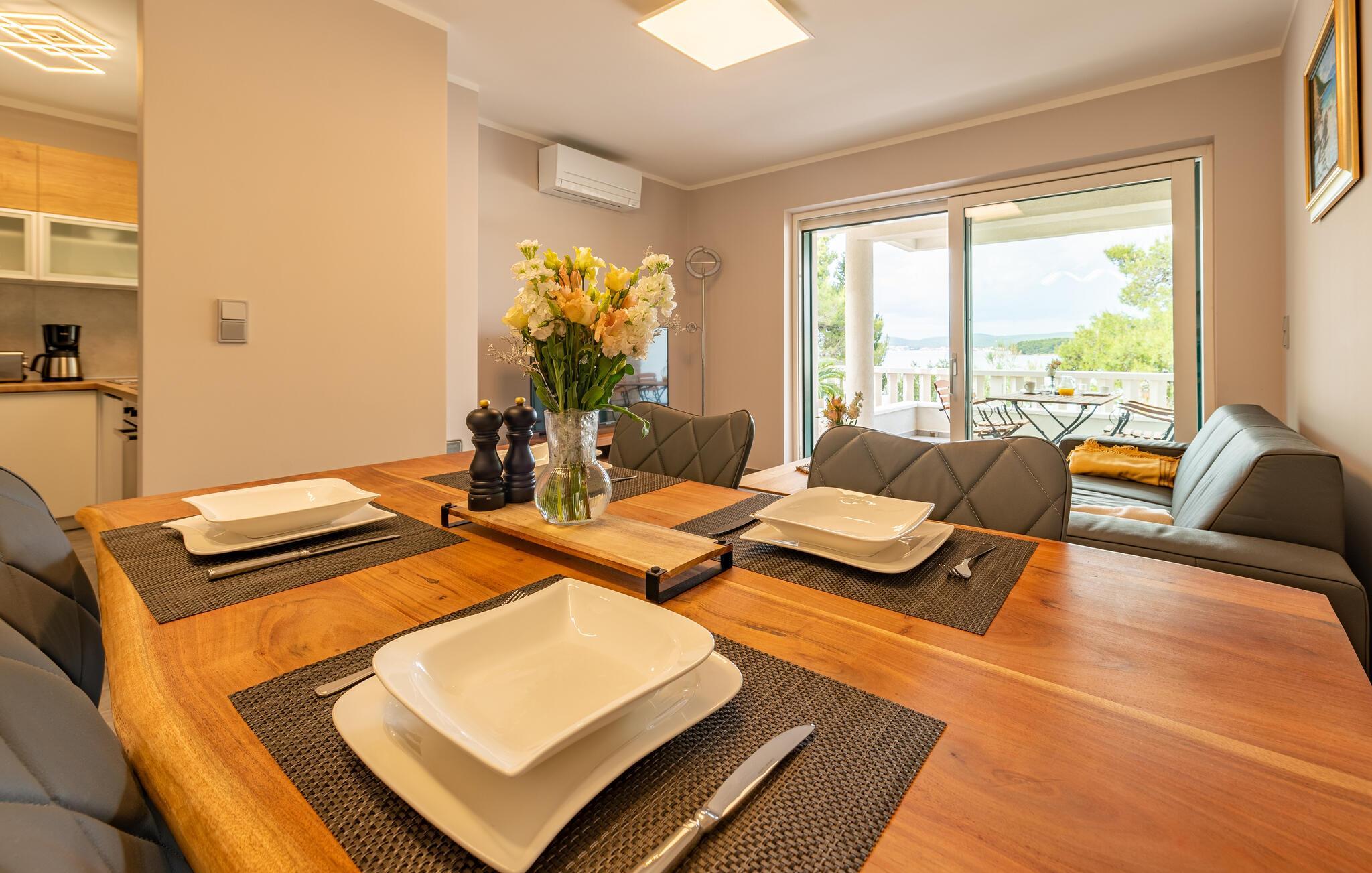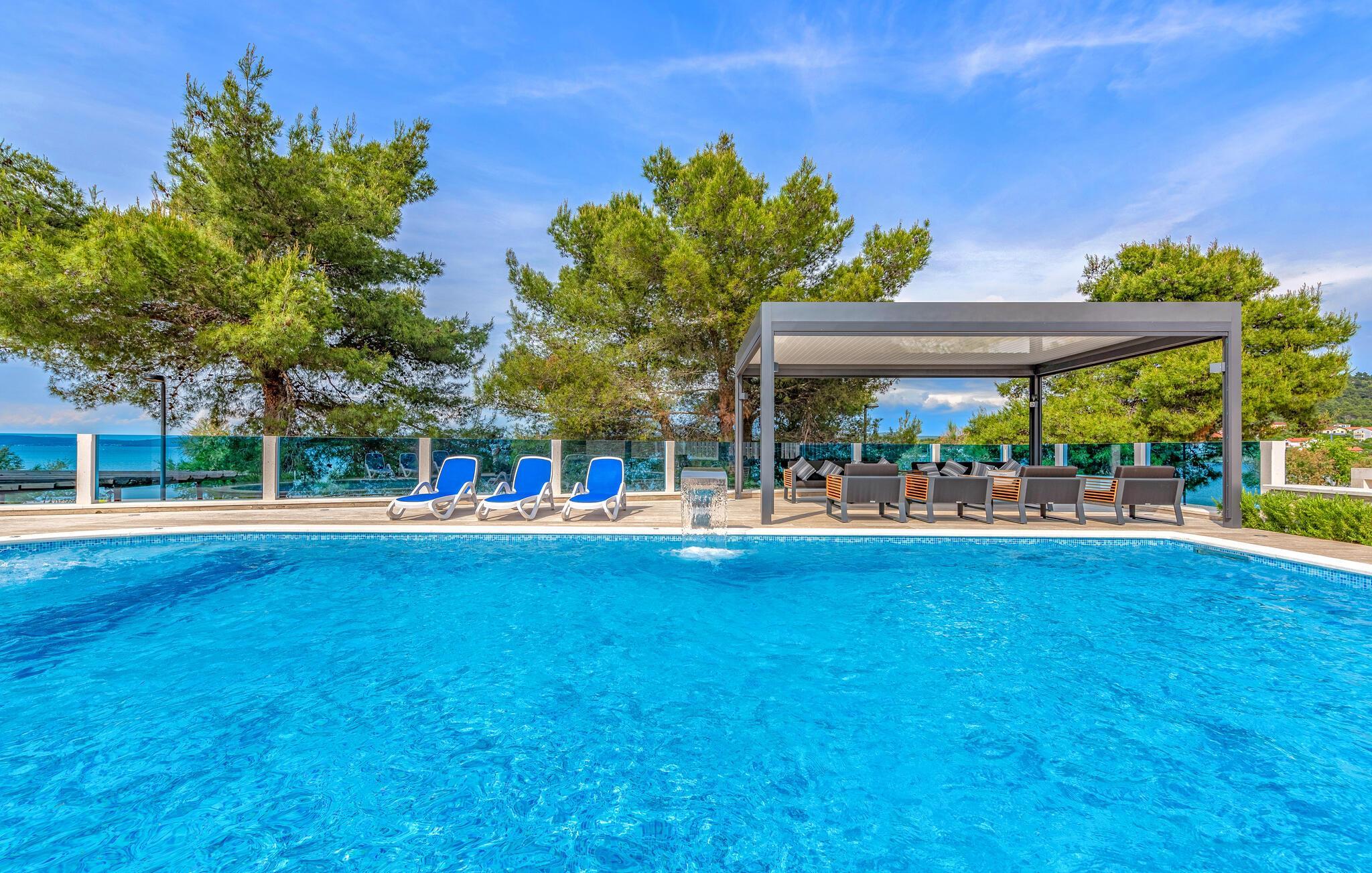 Glæd jer til et komfortabelt ophold i denne moderne lejlighed med adgang til fælles pool i første række til vandet.