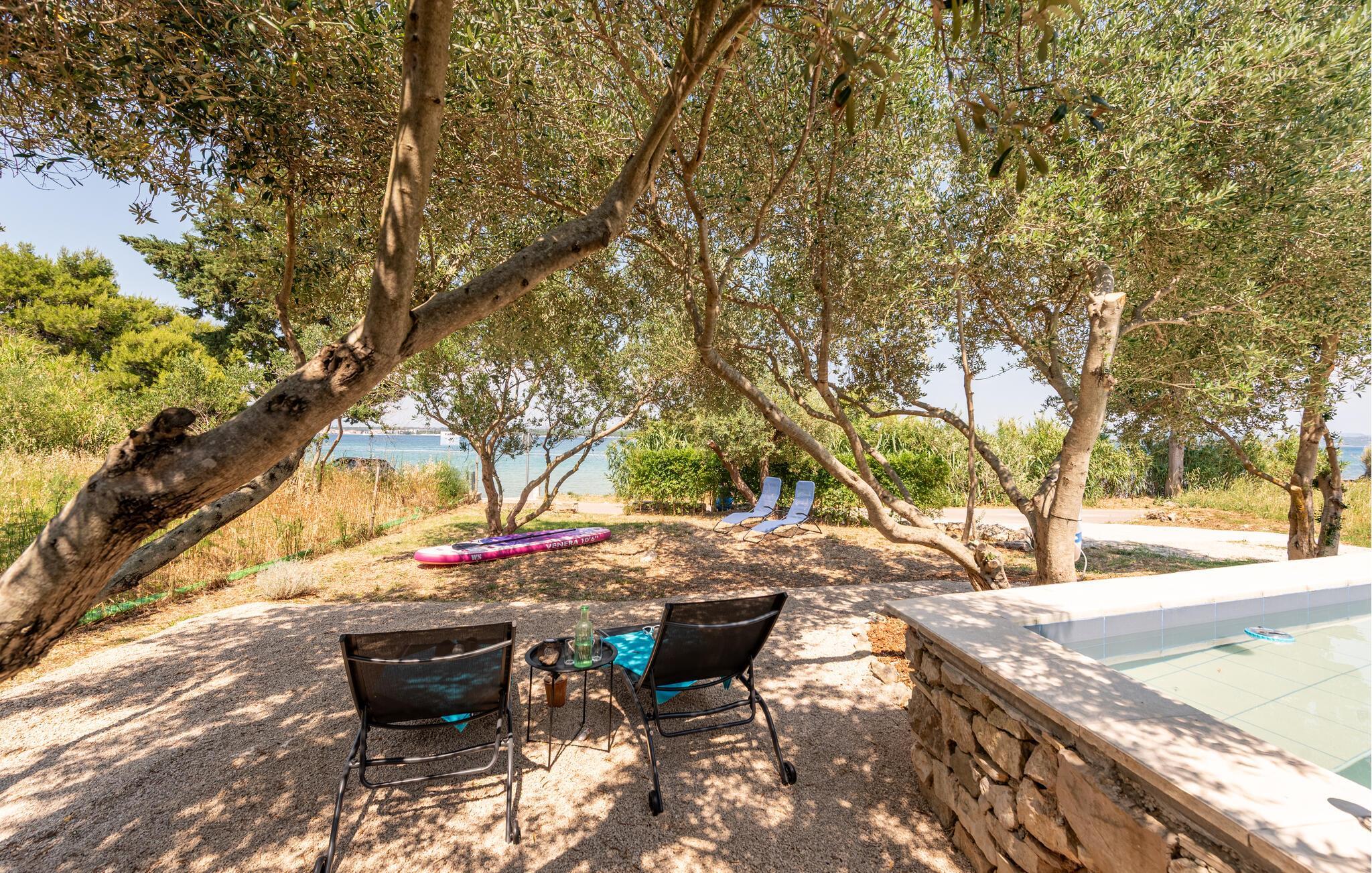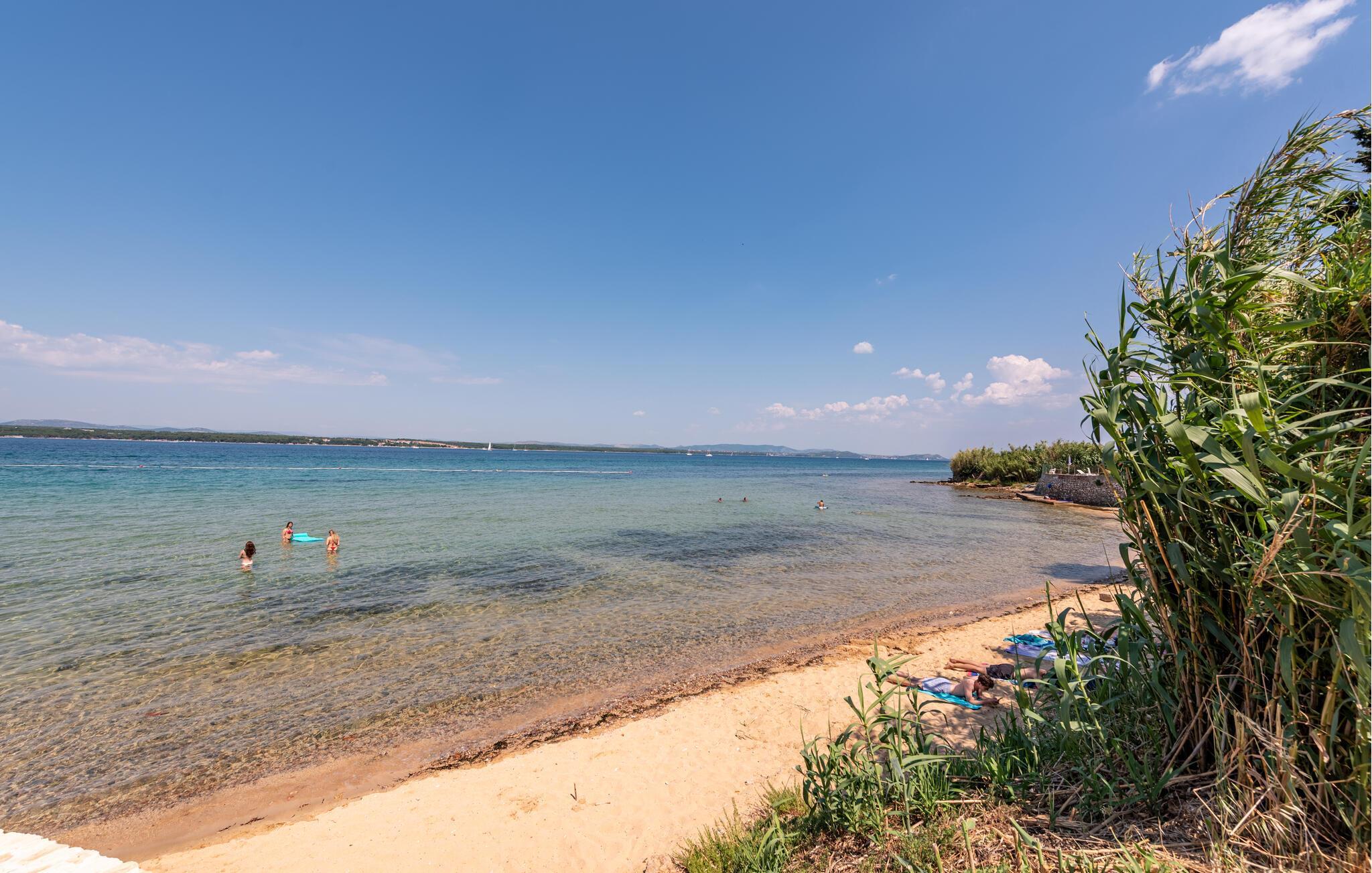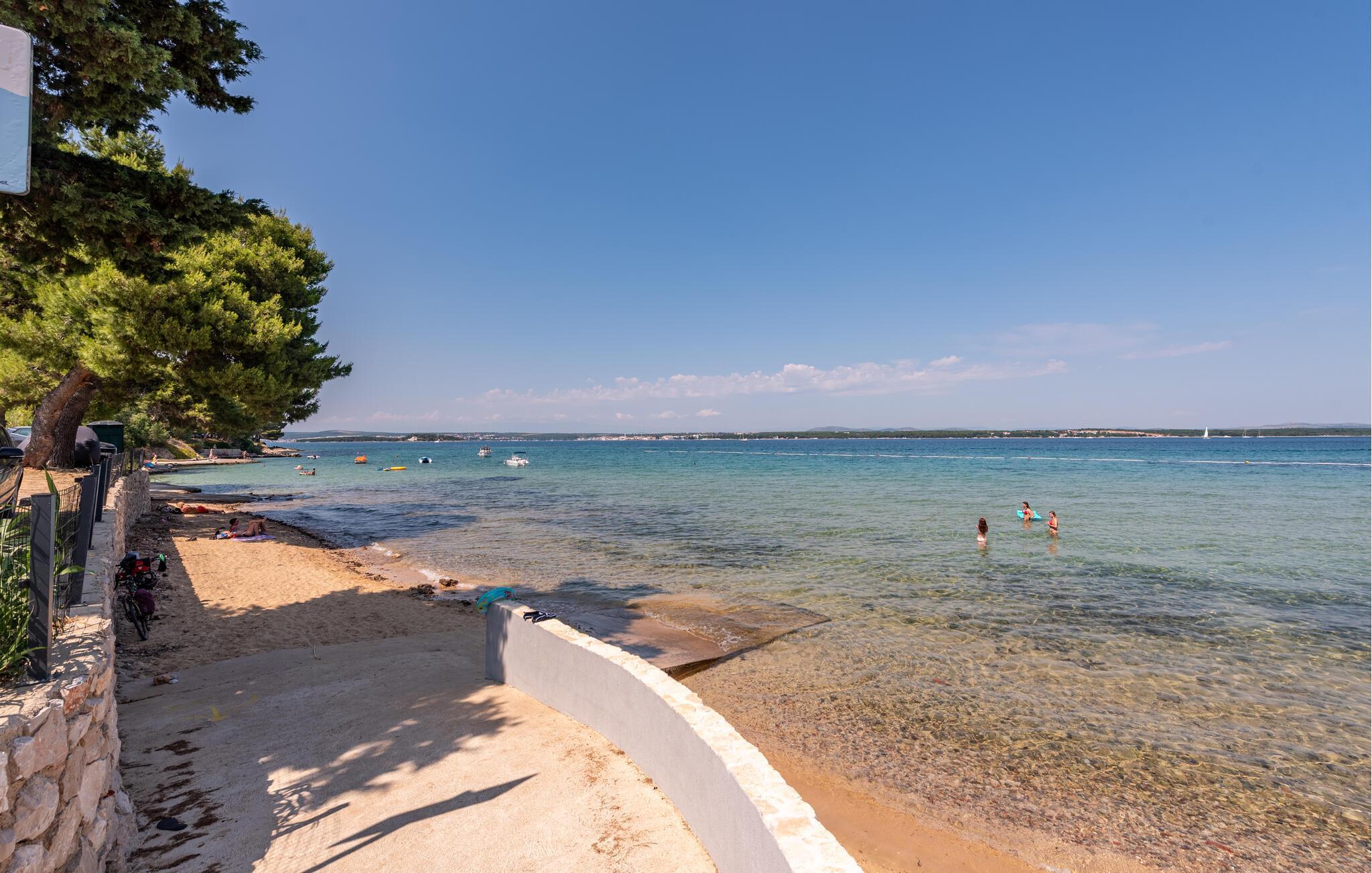 Oplev uforglemmelige dage i dette komfortable feriehus med pool på stranden. Dette lille, charmerende tilflugtssted byder jer velkommen til en sensationel beliggenhed direkte på sandstranden og tilbyder et idyllisk tilflugtssted for en afslappende og aktiv ferie med familien eller vennerne. Fremtryl middelhavsretter i det moderne køkken, nyd en afslappende siesta, og slap af om aftenen på den behagelige sofa med en god film. I de dejlige sommermåneder kan I praktisk talt flytte jeres liv udenfor. Den idylliske ejendom, der er oversået med afsidesliggende skyggefulde steder, inkluderer et stort udendørskøkken og en elegant, lille pool. Brug jeres surfbræt og glid hen over det krystalklare vand lige uden for døren, eller udforsk det omkringliggende område på en cykeltur. Forkæl jer selv med en forfriskende drink i strandbaren, tag en bådtur til Kornati Nationalpark, eller besøg den historiske by Zadar med sit havorgel og den hellige sol. Fordyb jer i middelhavskulturen ved at besøge de lokale markeder, eller nyd friskfanget fisk på en af tavernaerne med havudsigt.