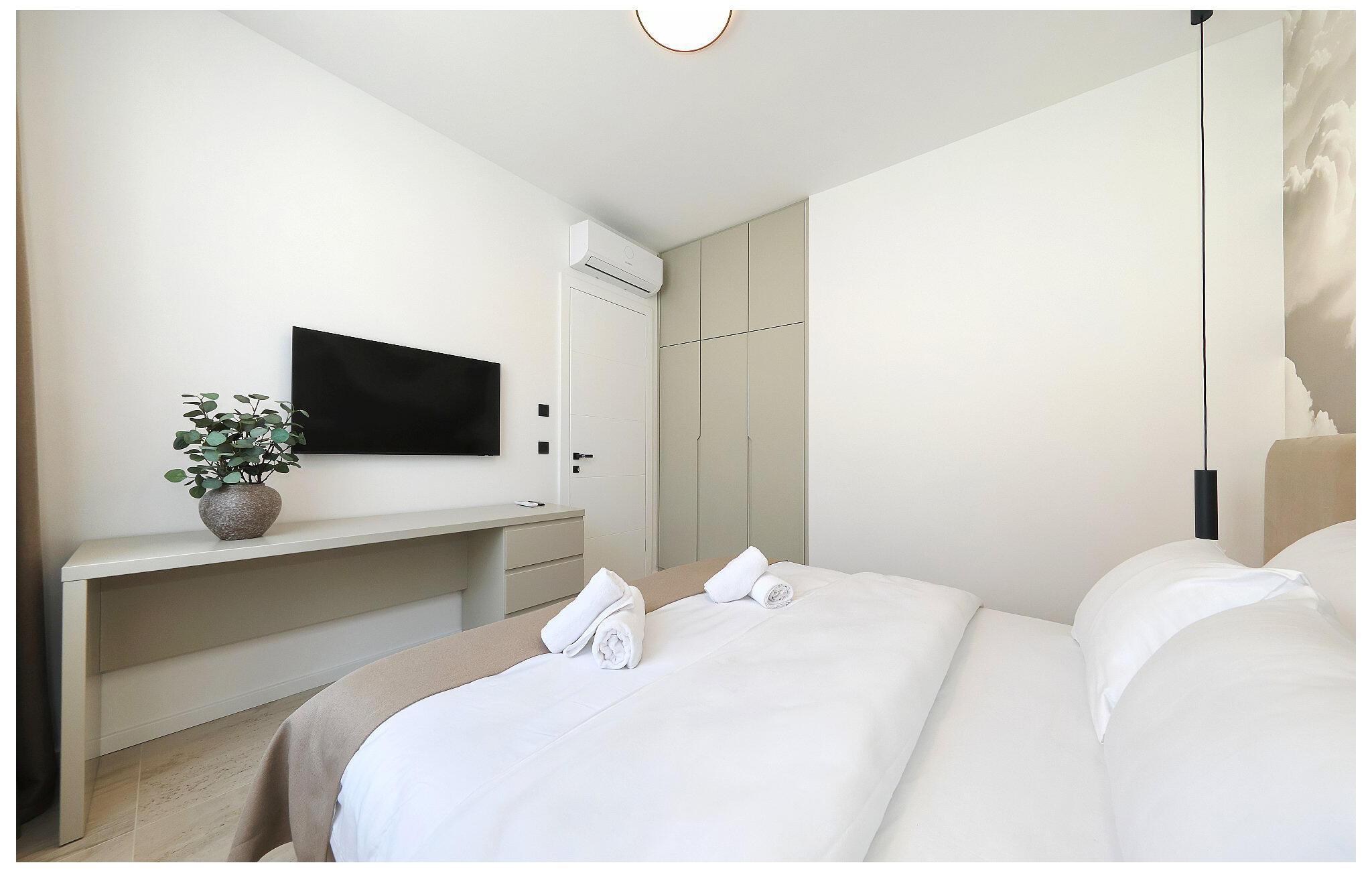 På Pašman, hvor sollyset blidt glider over havet og timerne går langsommere, byder dette stilfulde feriehus jer velkommen. Et sted til at trække vejret, finde ro og føle jer godt tilpas. Lyse, åbne rum med tidløst design og varme naturmaterialer skaber en afslappet atmosfære. Læn jer tilbage i den komfortable sofa, eller tilbered lækre retter sammen i det moderne køkken – måske ledsaget af jeres yndlingsmusik og duften af friske ingredienser.