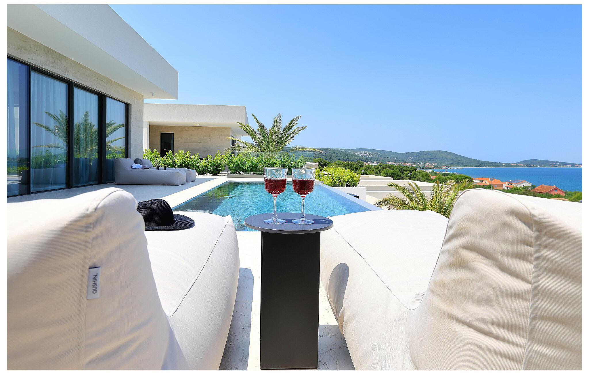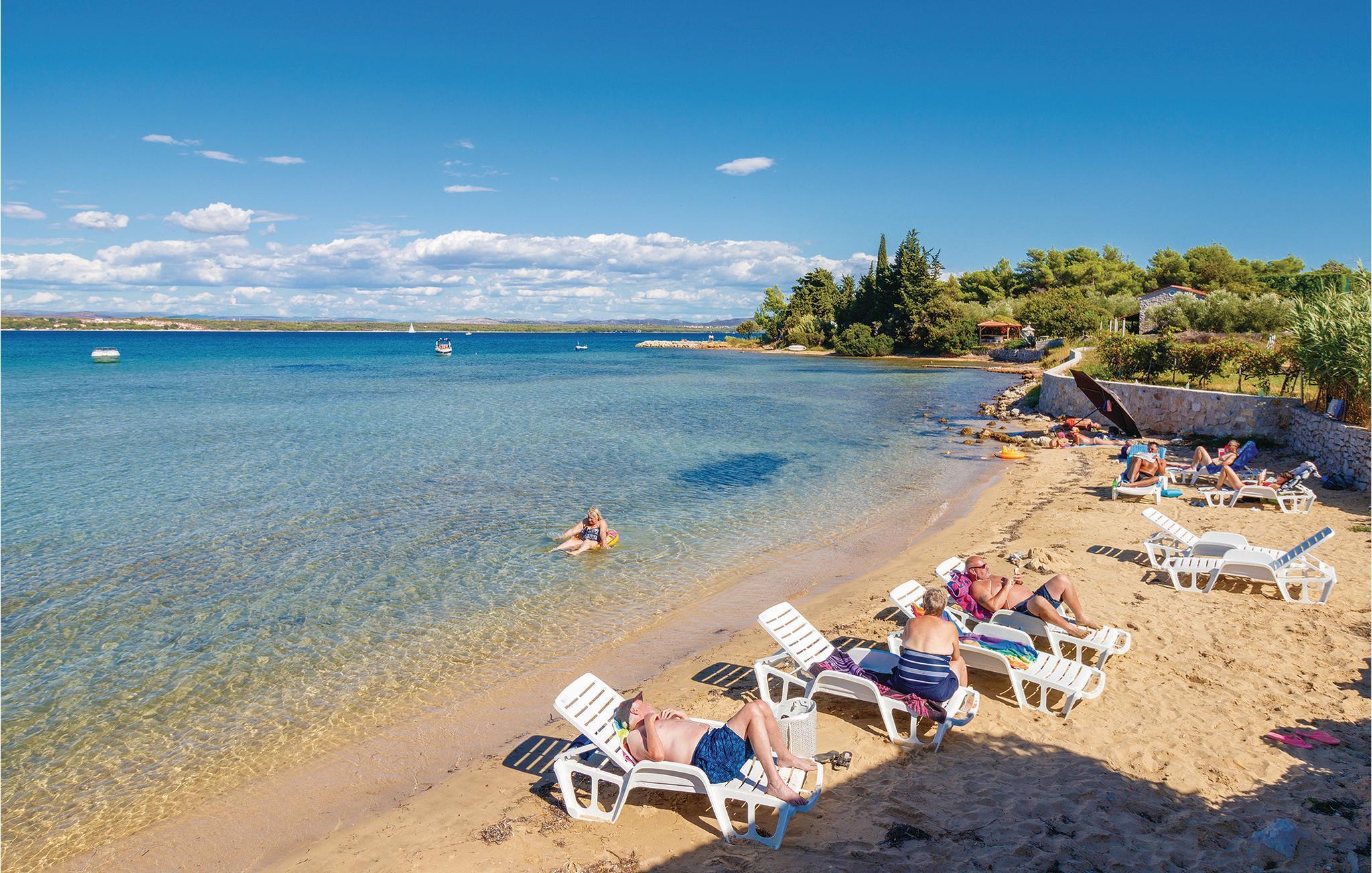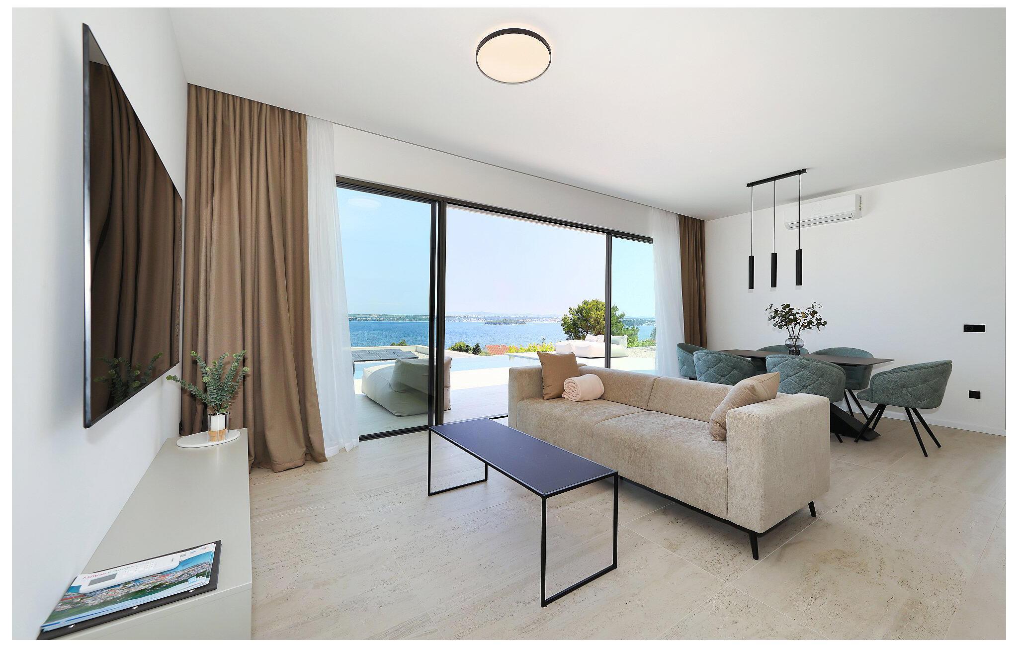 Tilbring en afslappende ferie i dette stilfulde feriehus med pool og panoramaudsigt, idyllisk beliggende på en malerisk ø. Forkæl jer selv med en afslappende pause fra hverdagen i et hus, der kombinerer moderne komfort med en hjemlig atmosfære. Det store panoramavindue i opholdsstuen lukker masser af lys ind og tilbyder en harmonisk udsigt over de grønne områder, ideelt til afslapning. Hyg jer sammen på den dejlige sofa, lyt til jeres yndlingsmusik eller en spændende podcast, se en film, eller lav planer for jeres næste udflugt. Start dagen med en frisk kop kaffe på terrassen og nyd den storslåede udsigt over det glitrende hav. Svøm et par baner i den opvarmede pool og slap derefter af på liggestolene. Om aftenen er en fælles grillfest under åben himmel en dejlig afslutning på dagen. Den fine sandstrand ligger kun en kort afstand væk - ideel til svømning, solbadning og leg ved vandet. Udforsk Cokovac-bakken på en kort vandretur og nyd panoramaudsigten over Dalmatien. Slentr gennem Tkons charmerende havn og nyd frisk fisk i en af de hyggelige taverner. Eller tag en bådtur til skjulte bugter eller den nærliggende ø Žut i Kornati Nationalpark.