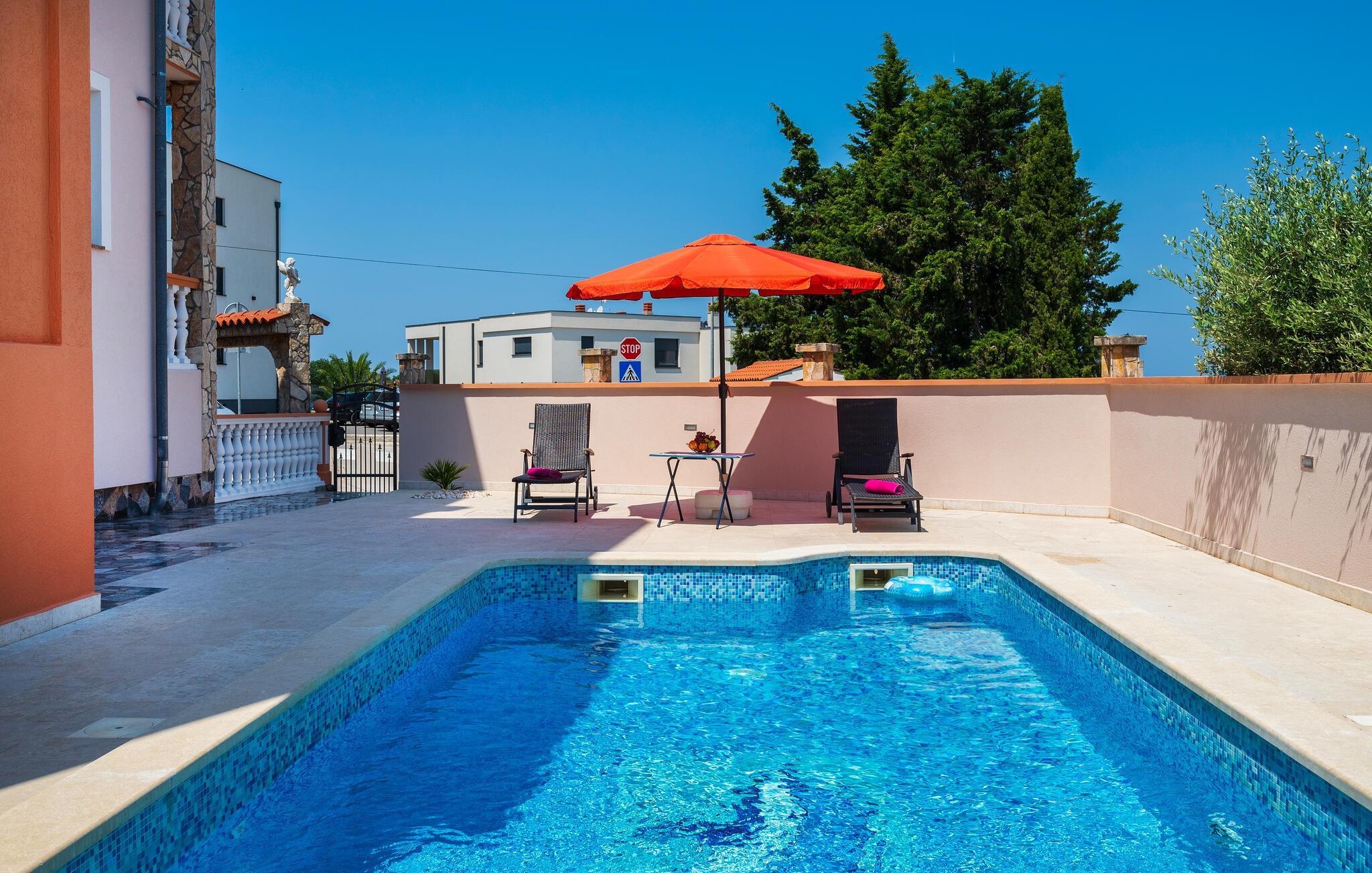 Denne lejlighed giver jer en komfortabel base, som er funktionelt og smagfuldt indrettet. Her har I alt, hvad I skal bruge til nogle fantastiske dage i Kroatien. I har også adgang til en overdækket altan, hvor I kan spise morgenmad og sidde i solen, mens I nyder udsigten til havet og Brijuni-øerne. Der er en ekstra terrasse, som er åben og deles med gæsterne i lejlighed CIP632, -33, -34 og 35. Her finder I også en udendørspool, en grill samt gynger og en vippe til børnene.