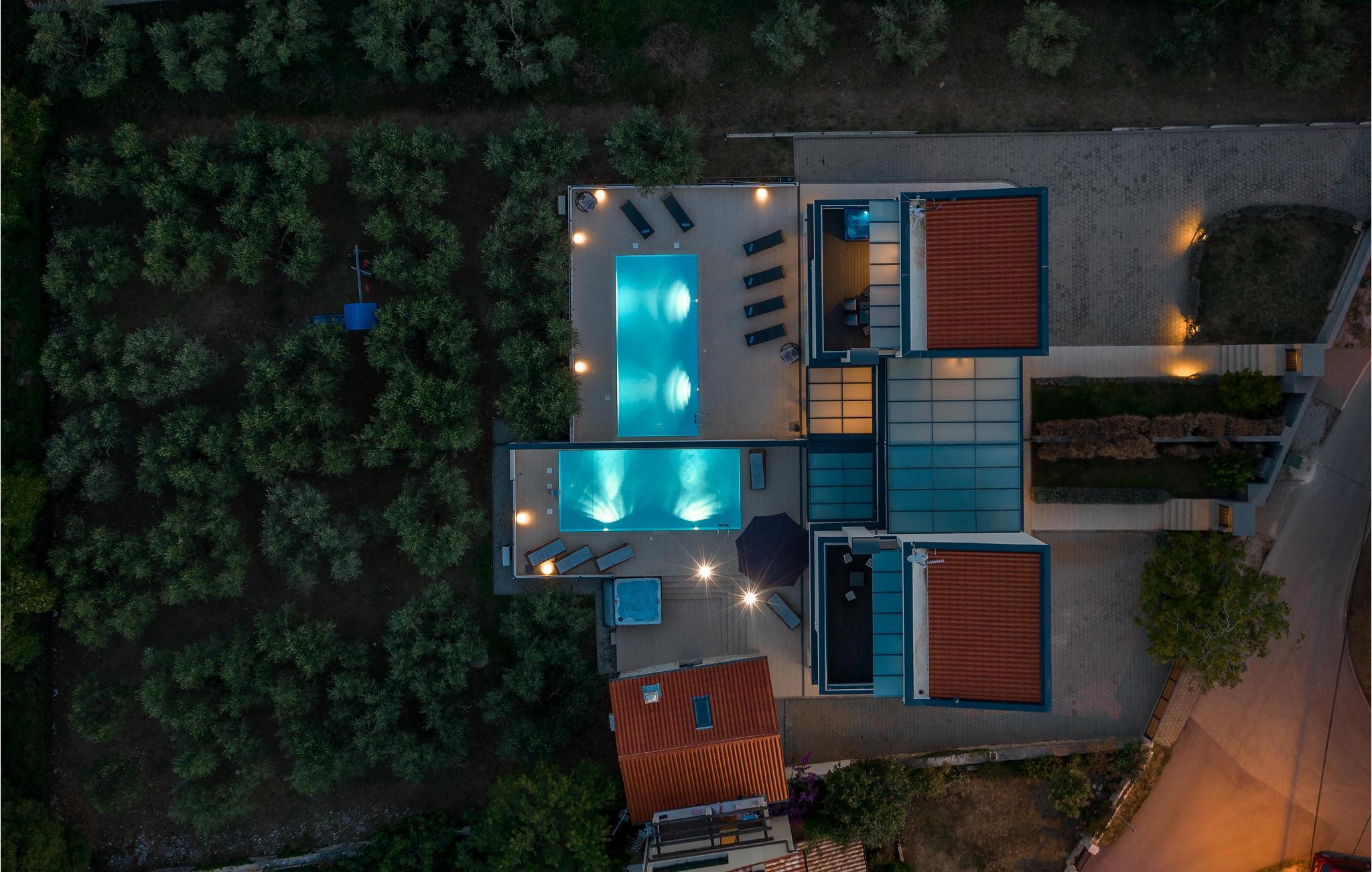 Det indre af huset er fordelt på tre etager og er moderne møbleret. Fitnessudstyr, sauna og jacuzzi beliggende på den øverste terrasse med udsigt over havet. På en 1000m2 indhegnet gård er der en swimmingpool med opvarmet vand, forskellige faciliteter til børn og en smuk olivenlund.