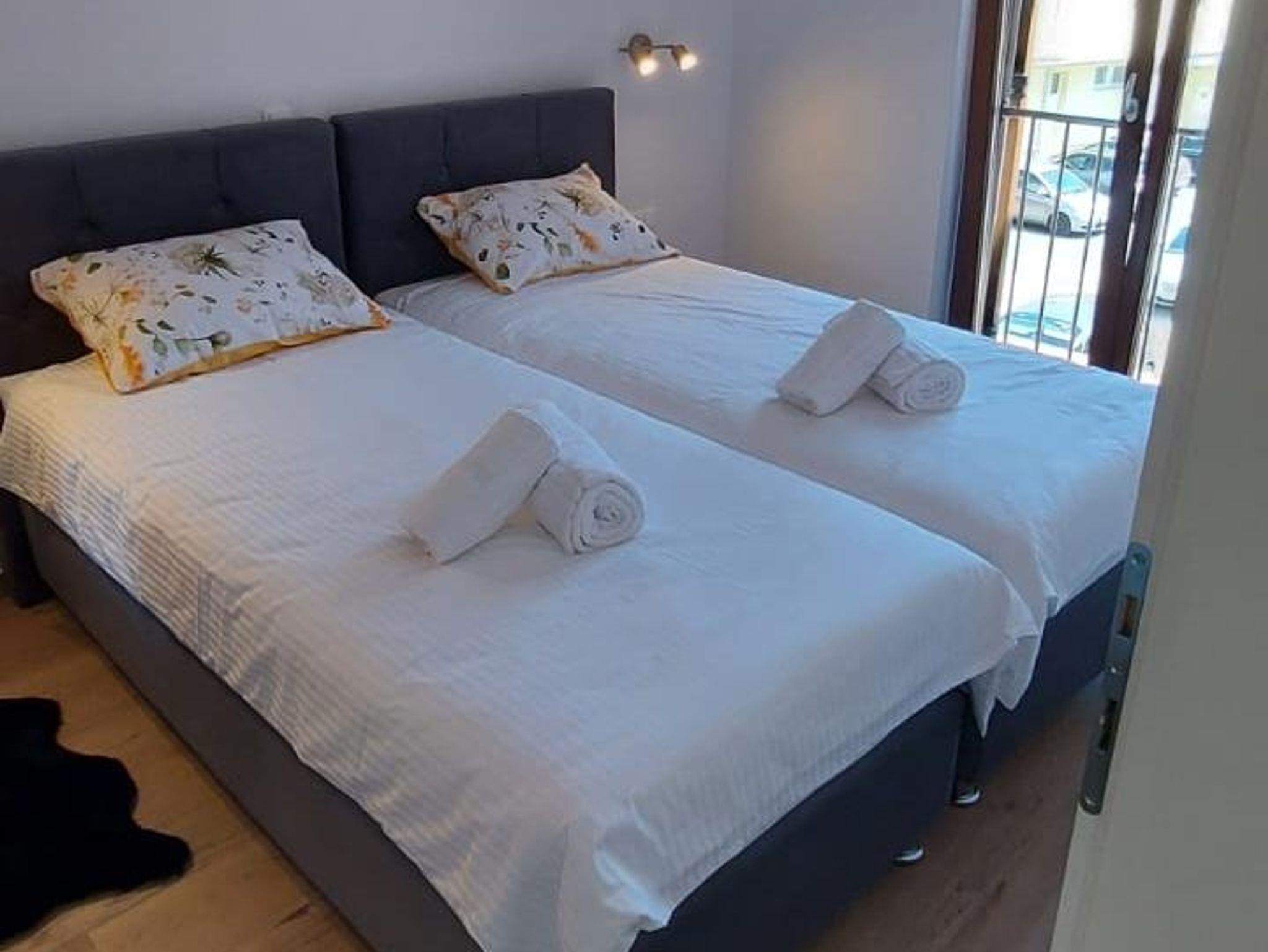 Ferienwohnung bietet Platz für 6 Gäste. Die Betten sind in Schlafzimmern, die es 2 gibt, und in Wohnzimmer, innerhalb einer Gesamtfläche von 67m2, angeordnet. Es ist erlaubt, Speisen auf dem Gemeinschafts-Grill vorzubereiten. Die reservierte Unterkunftseinheit hat keinen Balkon und keine Terrasse. IM PREIS INBEGRIFFEN: Kurtaxe, Endreinigung, Klimatisierung, Parkplatz, Internet, Kinderbett, Bügeleisen, Bügelbrett, Föhn. VERBINDLICHE ZUSÄTZLICHE KOSTEN: Aufzahlung für Kurzaufenthalte (prozentualer Zuschlag pro Nächtigungsanzahl: 30% - 1, 20% - 2, 10% - 3). UNVERBINDLICHE ZUSÄTZLICHE KOSTEN: Zusatzbett (30,00 € pro Nacht). Die Verfügbarkeit zusätzlicher Dienstleistungen in Ihrem reservierten Termin und die Preise derselben (falls nicht aufgeführt) müssen im Voraus überprüft werden. Zusätzliche Dienstleistungen die in der Zahlungsaufforderung nicht aufgeführt sind werden direkt beim Vermieter bezahlt, angenommen der Gast nutzt auch diese.