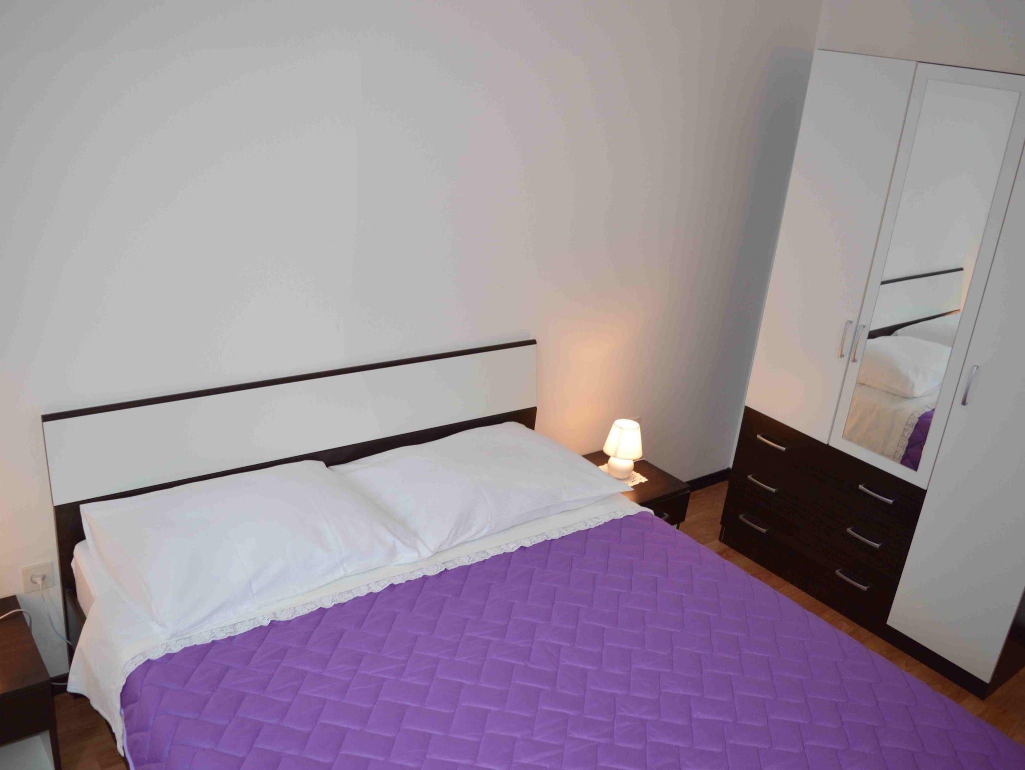 Ferienwohnung bietet Platz für 4 Gäste. Die Betten sind in Schlafzimmern, die es 2 gibt, innerhalb einer Gesamtfläche von 53m2, angeordnet. Die Gäste haben eine eigene Terrasse zur Verfügung, auf der sie in warmen Sommernächten genießen können. Es ist erlaubt, Speisen auf dem Gemeinschafts-Grill vorzubereiten. In der Unterkunftseinheit besteht die Möglichkeit des Mitbringens von Haustieren gegen Aufpreis. IM PREIS INBEGRIFFEN: Kurtaxe, Endreinigung, Klimatisierung, Zentralheizung, Parkplatz, Internet, Kinderbett, Bügeleisen, Bügelbrett, Föhn, tragbarer Grill. VERBINDLICHE ZUSÄTZLICHE KOSTEN: Aufzahlung für Kurzaufenthalte (prozentualer Zuschlag pro Nächtigungsanzahl: 30% - 1, 20% - 2, 10% - 3). UNVERBINDLICHE ZUSÄTZLICHE KOSTEN: Haustiere (8,00 € pro Nacht). Die Verfügbarkeit zusätzlicher Dienstleistungen in Ihrem reservierten Termin und die Preise derselben (falls nicht aufgeführt) müssen im Voraus überprüft werden. Zusätzliche Dienstleistungen die in der Zahlungsaufforderung nicht aufgeführt sind werden direkt beim Vermieter bezahlt, angenommen der Gast nutzt auch diese.