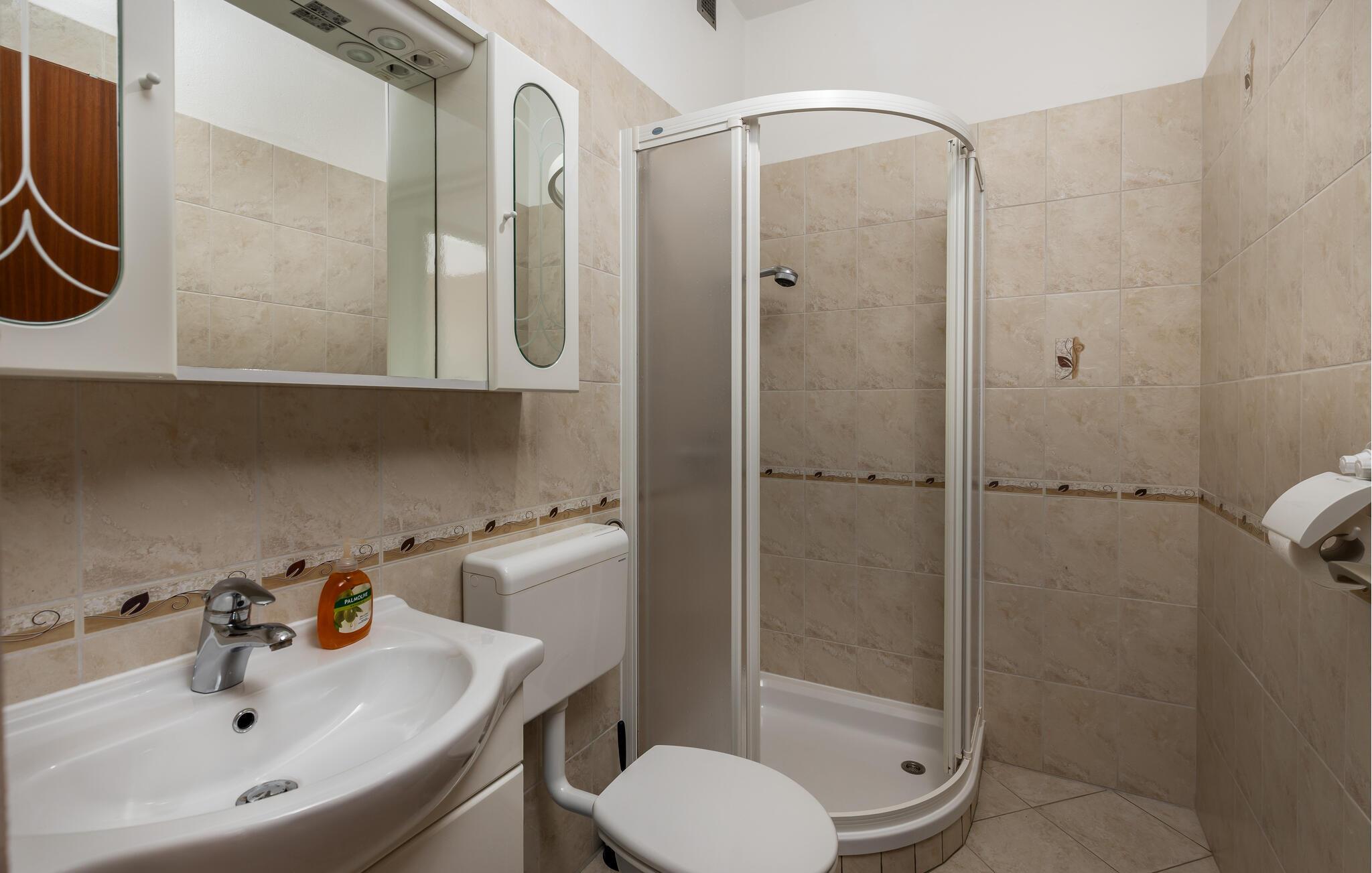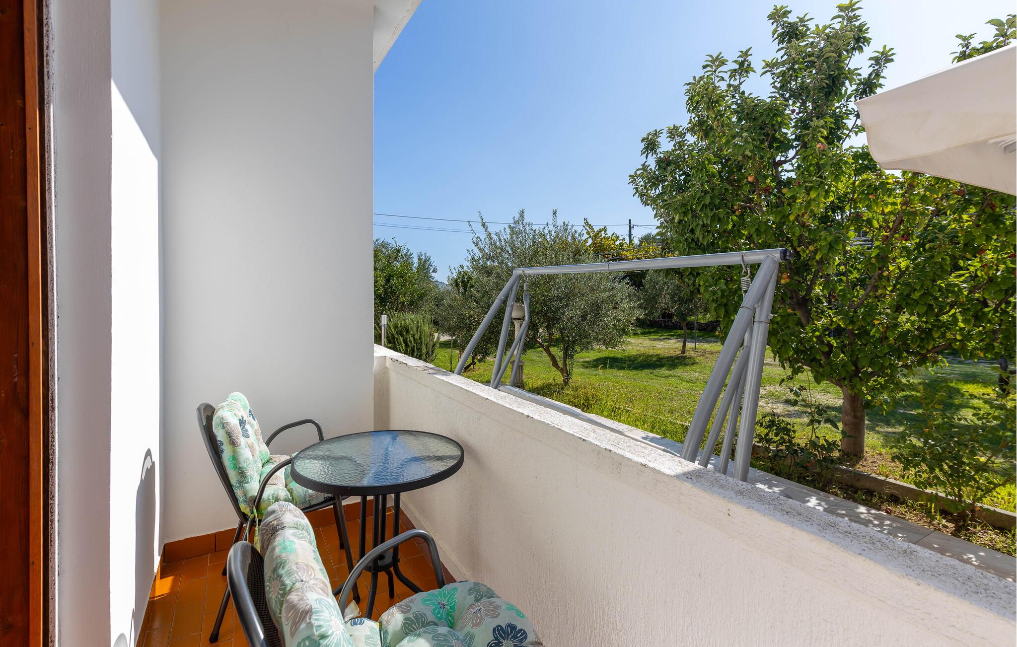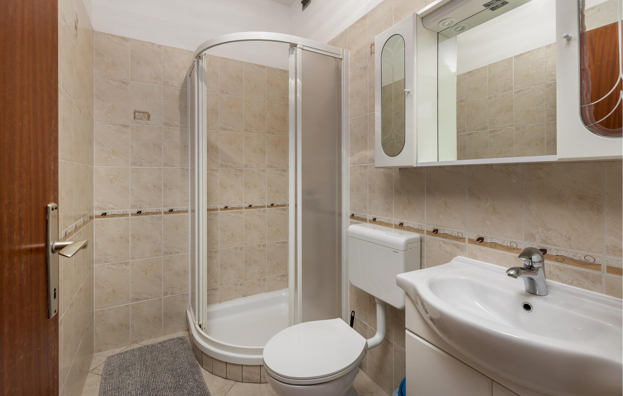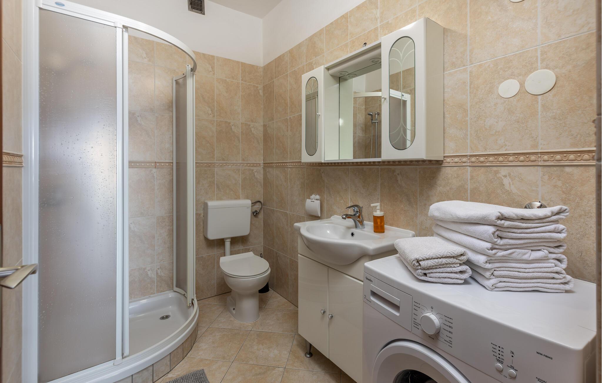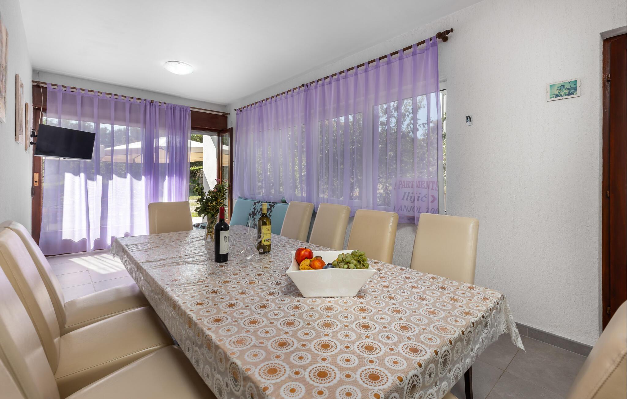 Denne lejlighed, langt fra Rabs travlhed, er en skøn oase til en afslappende ferie. En lys stue med sofa, et stort spisebord og et praktisk køkken skaber en atmosfære, hvor I hurtigt vil føle jer hjemme. Tilbring jeres dag her, som I ønsker – uanset om I nyder en afslappet kop kaffe, snakker med familien eller vennerne eller laver mad sammen.