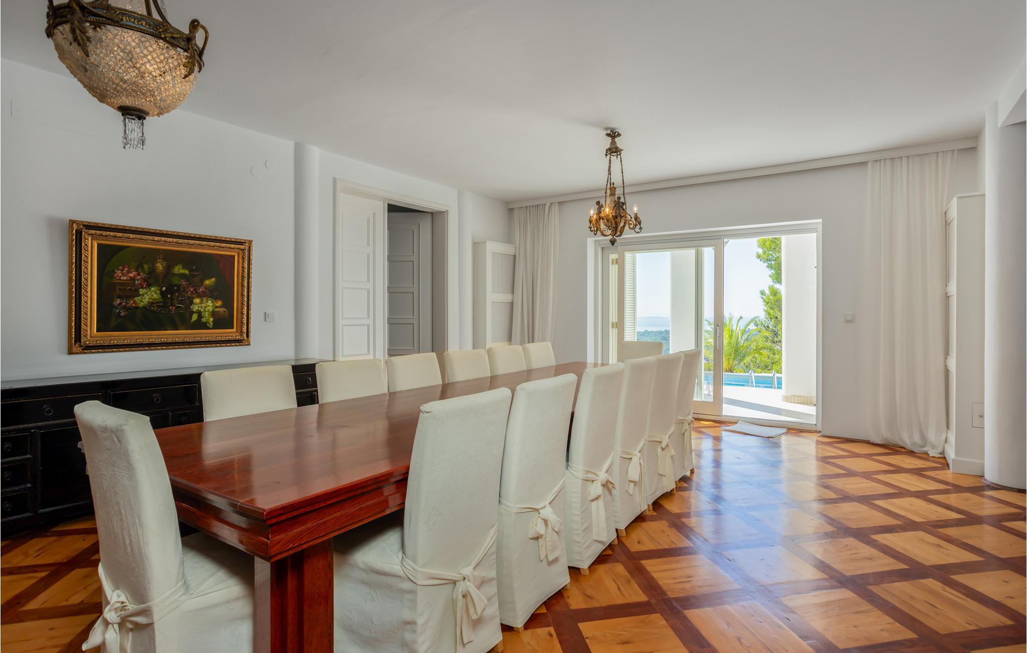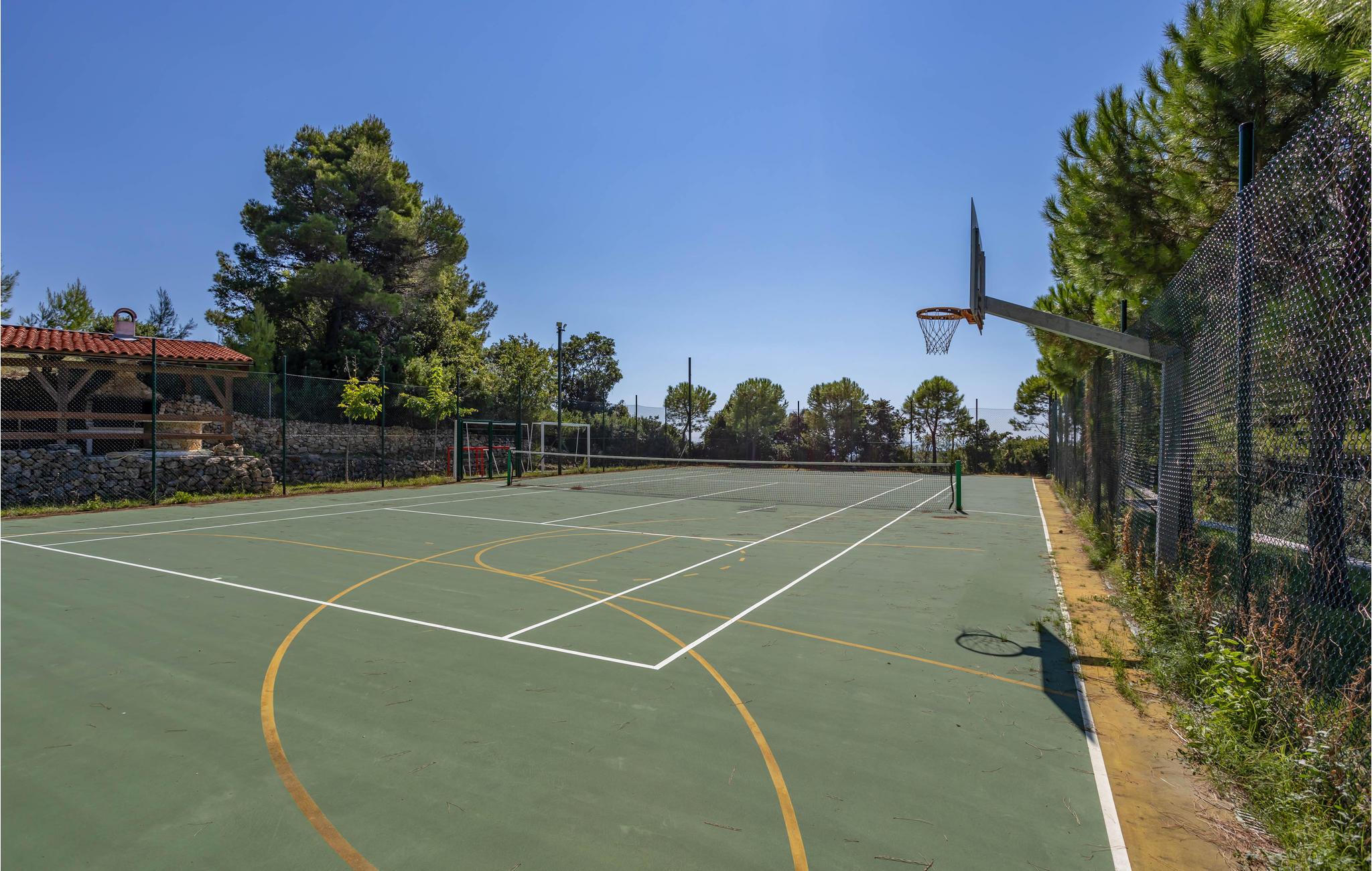 Husets attraktive udeareal giver de bedste muligheder for at tilbringe hyggelige stunder udendørs. Nyd solen og den betagende havudsigt på forskellige terrasser, og mens I svømmer i poolen, som I ønsker det. Træn jer selv på jeres egen multifunktionelle bane ved at spille tennis, fodbold eller basketball. På grund af højdeforskellene kan I nå dele af den store have med en lille svævebane. Tilbered lækre retter på grillen og afslut dagen i det fri.