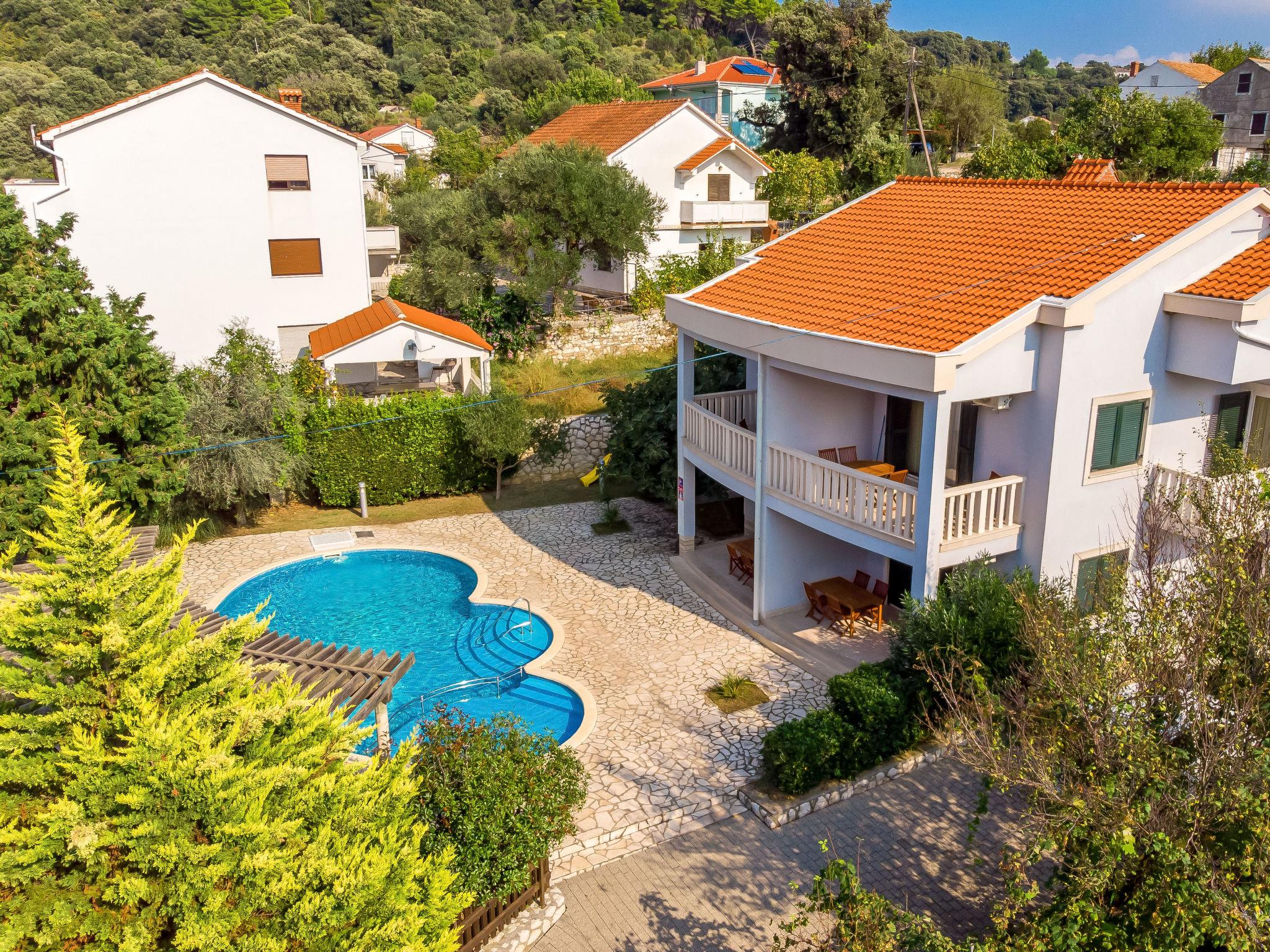Kampor 6 km from Rab: Child friendly apartment block. In a quiet, sunny position, 40 m from the sea, 40 m from the beach. For shared use: property (fenced), well-kept garden with lawn, swimming pool kidney-shaped heated (12 x 6 m, depth 120 - 160 cm, seasonal availability: 13.May. - 30.Sep.) with internal staircase. Children's pool, outdoor shower, arbour, garden furniture, barbecue. In the house: internet access. Parking. Shop, restaurant 150 m, bus stop 2.4 km, concrete beach 40 m. Please note: the photograph shows a typical example. Additional accommodations can be booked. Property ref. HR3703.620 is situated on the same property. The apartment house "Tomislav" is situated on the same grounds (2700 m2) with the apartment house "Mare", with swimming pool for shared use with counterflow. One part of the pool is a paddling pool, depth 30 - 60 cm. Deck chairs at disposal. Concrete beach with sand sea bottom, slightly sloping, very suitable for children 40 m from the house.