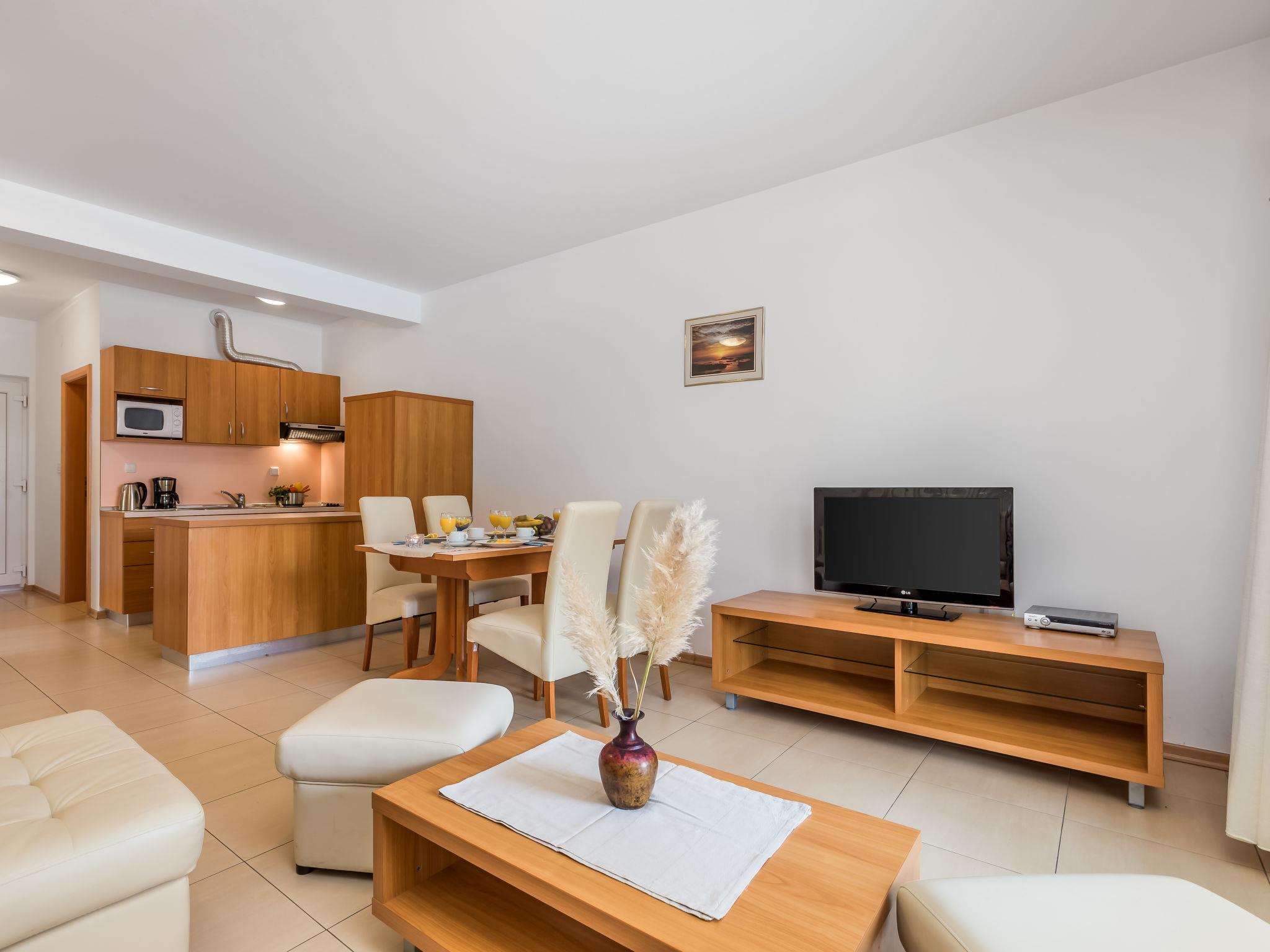 "Tomislav 4", 2-room apartment 48 m2 on 1st floor. Modern and cosy furnishings: living/dining room 30 m2 with 1 double sofabed (145 cm, length 195 cm), satellite TV and air conditioning. Exit to the terrace. 1 room with 1 double bed (160 cm, length 200 cm). Exit to the terrace. Open kitchen (4 hot plates, microwave, freezer). Shower/WC. Terrace 10 m2, roofed. Terrace furniture. View of the swimming pool. Facilities: safe. Internet (WiFi, free). Parking.