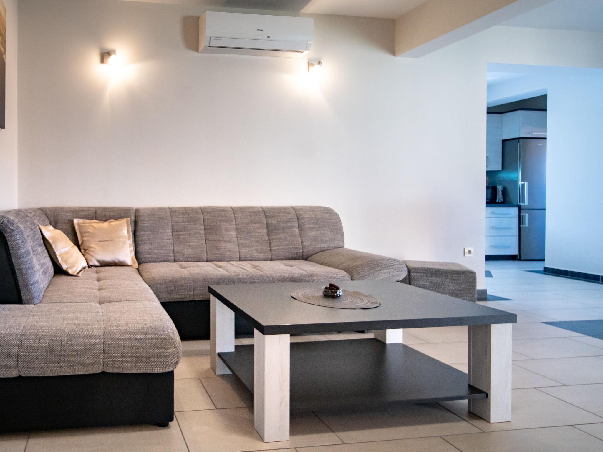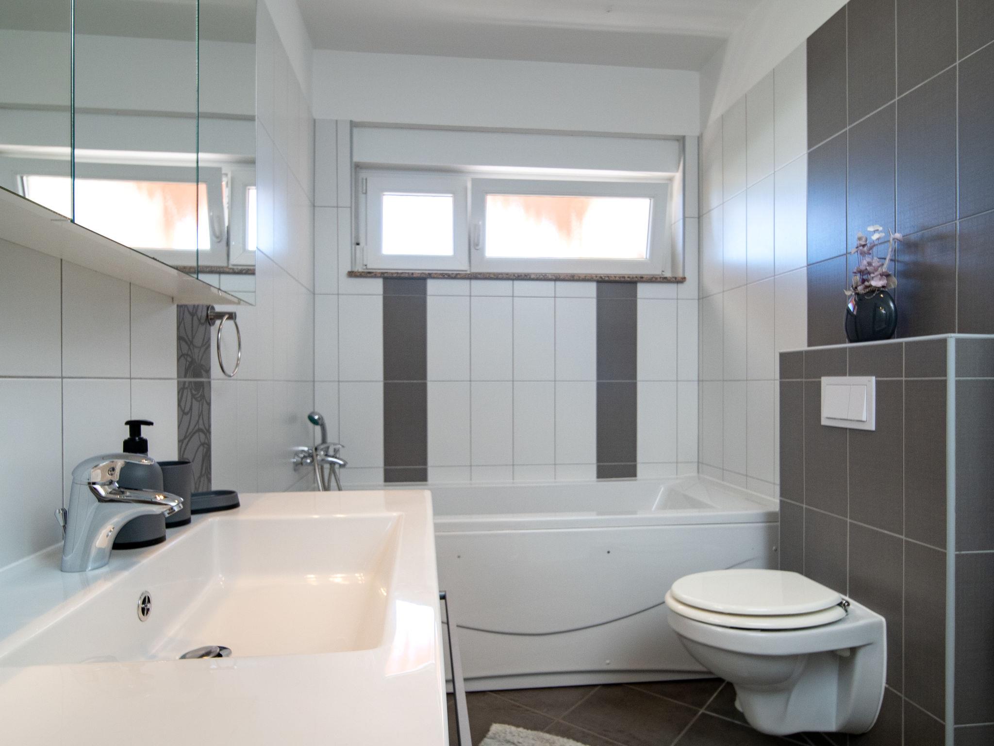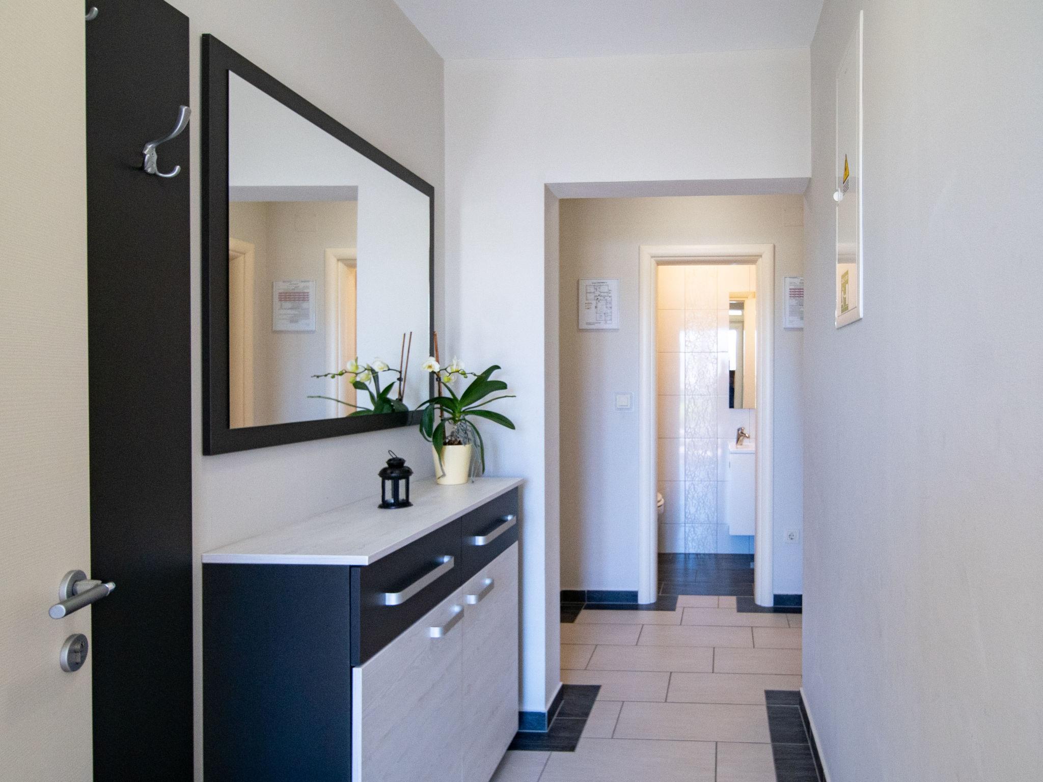 4-room apartment 125 m2, on the upper ground floor. Entrance hall with air conditioning. Living/dining room with satellite TV and air conditioning. Exit to the terrace. 1 room with 1 double bed (2 x 90 cm, length 200 cm). Exit to the terrace. 1 room with 1 double bed (2 x 90 cm, length 200 cm). 1 room with 1 double bed (2 x 90 cm, length 200 cm), shower/WC. Open kitchen (2 hot plates, oven, dishwasher, 2 gas rings, toaster, kettle, microwave, freezer, electric coffee machine). Bath/WC, sep. WC. No heating option. Terrace 16 m2, roofed terrace 10 m2. Terrace furniture. Facilities: safe, hair dryer. Internet (WiFi, free). Please note: non-smoking house. Maximum 1 pet/ dog allowed.