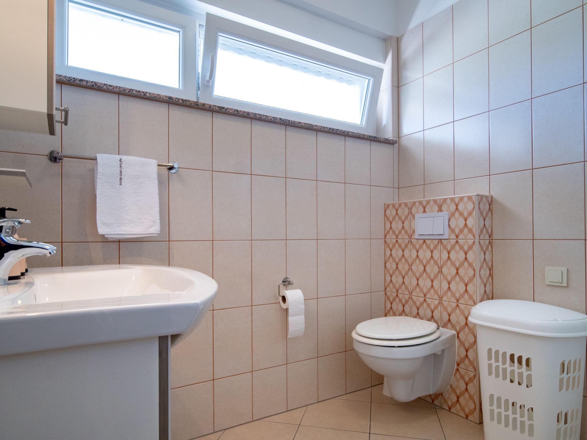 3-room apartment 70 m2 on 1st floor. Living/dining room with satellite TV. Exit to the terrace. 1 room with 1 double bed (2 x 90 cm, length 200 cm). Exit to the terrace. 1 room with 1 double bed (2 x 90 cm, length 200 cm), shower/WC. Open kitchen (2 hot plates, oven, dishwasher, 2 gas rings, toaster, kettle, microwave, freezer, electric coffee machine) with air conditioning. Shower/WC. No heating option. Terrace 16 m2, roofed terrace 8 m2, roofed. Terrace furniture. Facilities: safe, hair dryer. Internet (WiFi, free). Please note: non-smoking house. Maximum 1 pet/ dog allowed.