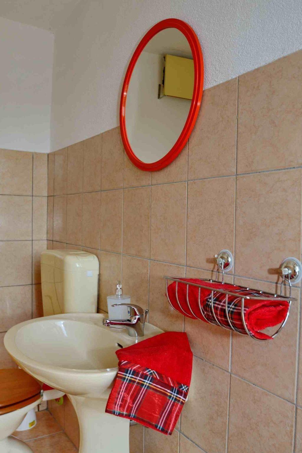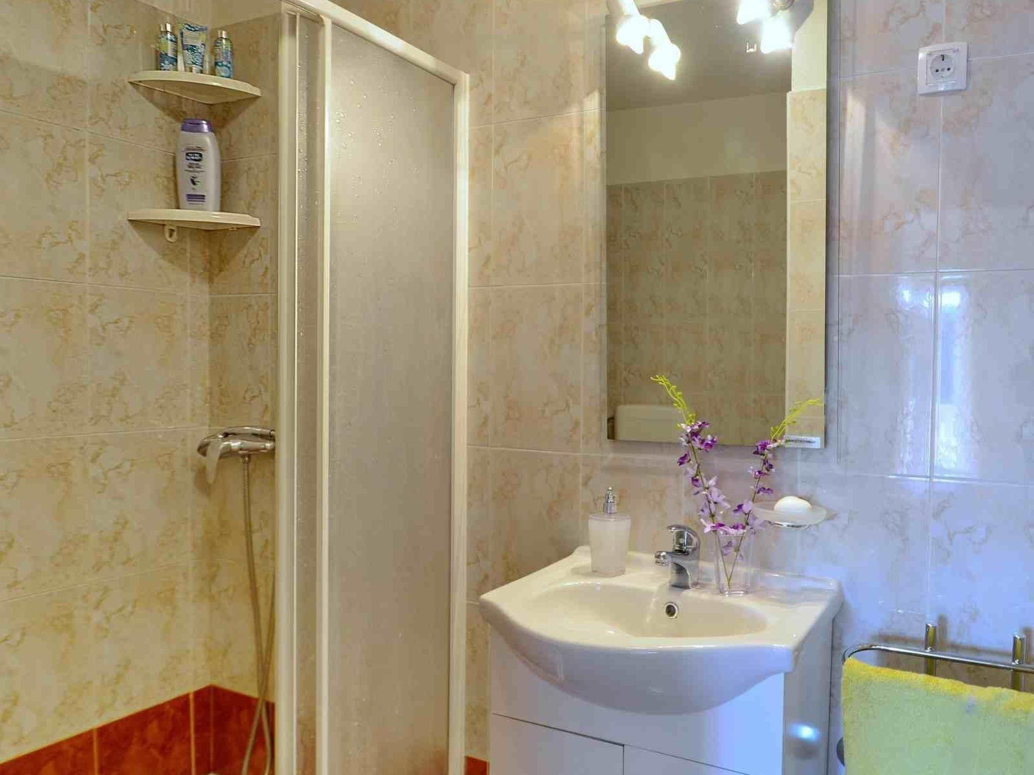 The house is divided into a ground floor and first floor. On the ground floor there is a bedroom with a double bed, a bathroom with a shower and a kitchen with a dining area. The kitchen is equipped with all conveniences, including gas and electric cooker, oven and microwave, toaster, kettle and American coffee maker, as well as dishwasher, refrigerator and freezer and a large dining table for eight people. Directly connected is the living room with sofa, radio and satellite TV. The first floor consists of three bedrooms with double beds. Two of the rooms have a balcony. There is also a bathroom with shower and a utility room with washing machine, ironing board and hoover. The entire house is air-conditioned. Free Wi-Fi is also available.