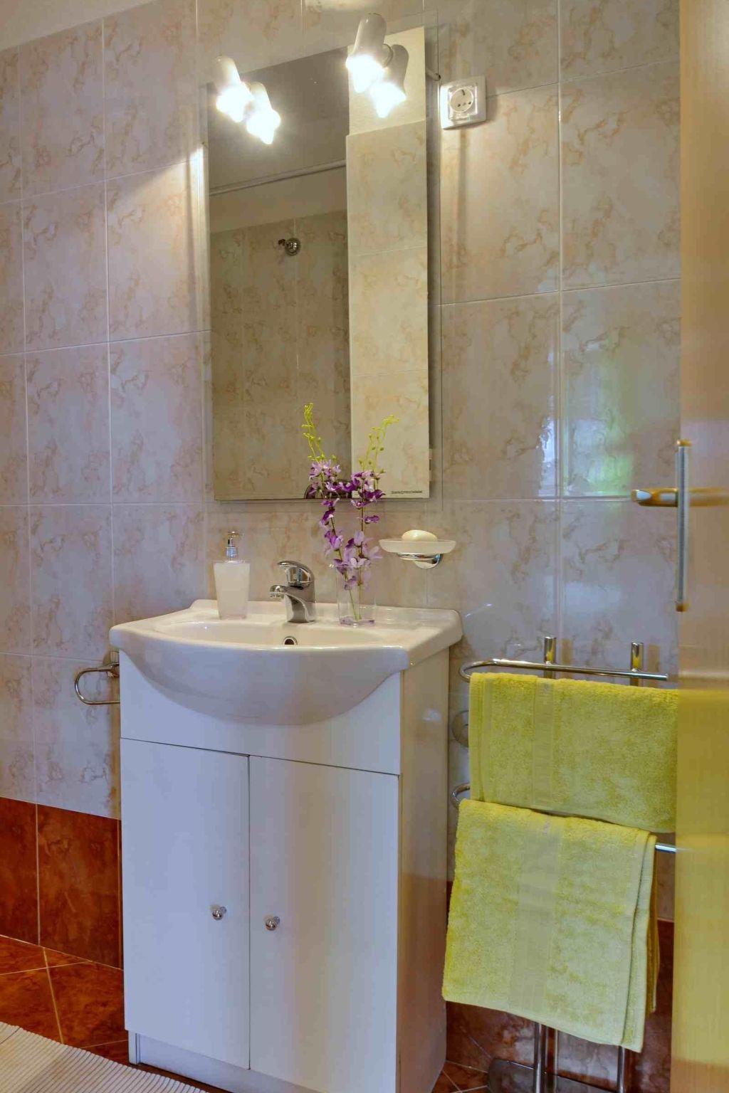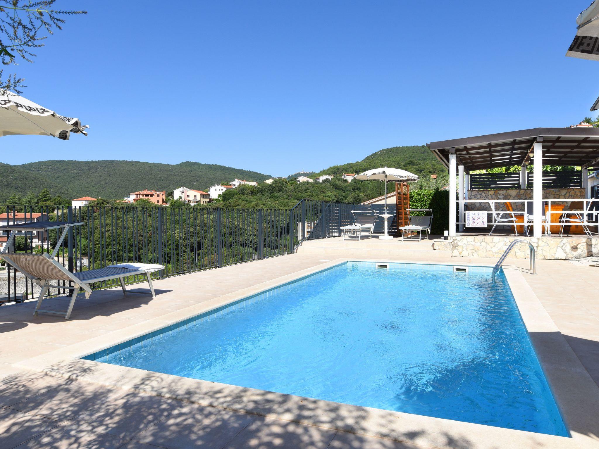 From the ground floor there is access to the large terrace. The outdoor area has much to offer: a gazebo, swimming pool and outdoor kitchen. It is equipped with a grill, wood or charcoal, a small refrigerator and a sink. There is also an additional outdoor bathroom. The area around the pool is equipped with a solar-powered outdoor shower, parasols and sun loungers. Next to it is a large gazebo with a table and benches, from which you can admire the entire surrounding area, the sea and the town of Labin, and where you can relax at any time of day.
