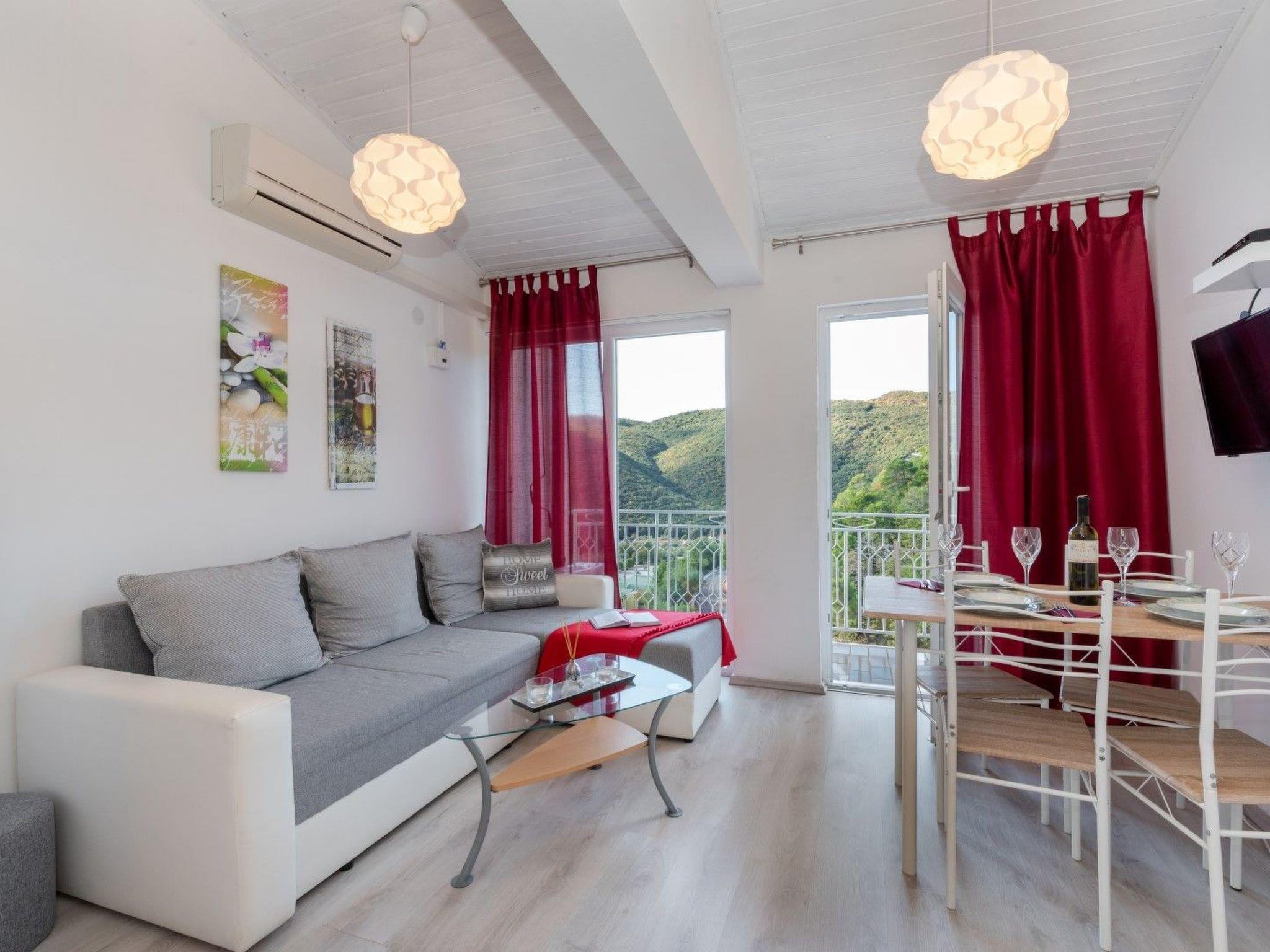 This holiday apartment provides 45m² of living space and is suitable for four people. It has a living room-kitchen with a table and four chairs. The kitchen unit is equipped with a stove, fridge and coffee machine. Opposite the table there is the flatscreen TV with satellite channels. The two bedrooms each have a double bed (140 x 200cm). The modern bathroom has a shower, WC and washbasin with a cupboard underneath. The air-conditioning is payable by consumption by the chip card.