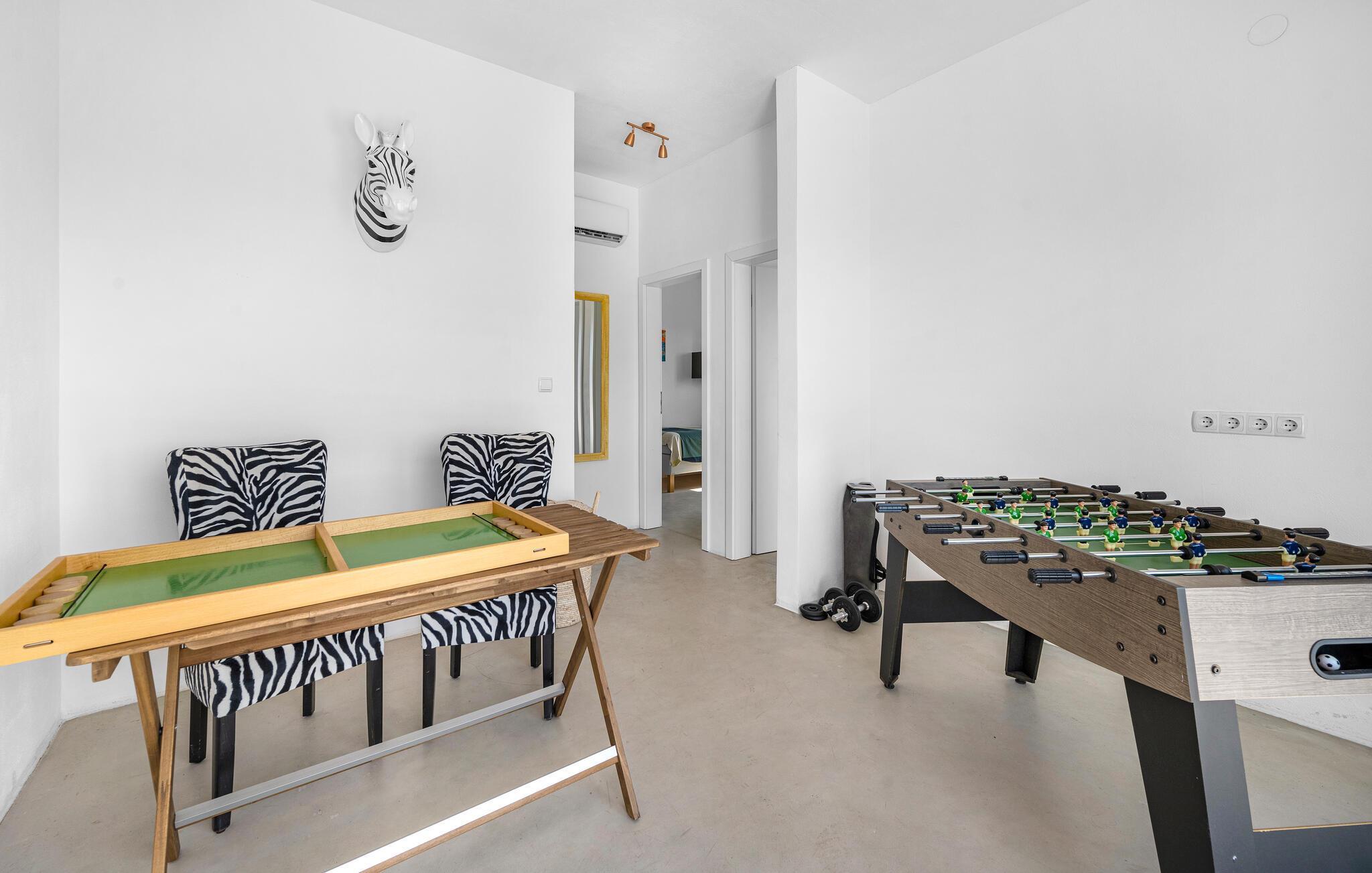 Til underholdning tilbyder feriehuset et spillerum, blandt andet med bordfodbold, hvilket er ideelt til hyggelige aftener med hele familien. Og udnyt jeres pool, hvor både børn og voksne kan svømme og plaske efter lyst. Eller træk jer tilbage til balkonen på første sal og nyd den vidunderlige udsigt over landskabet og helt ned til havet.