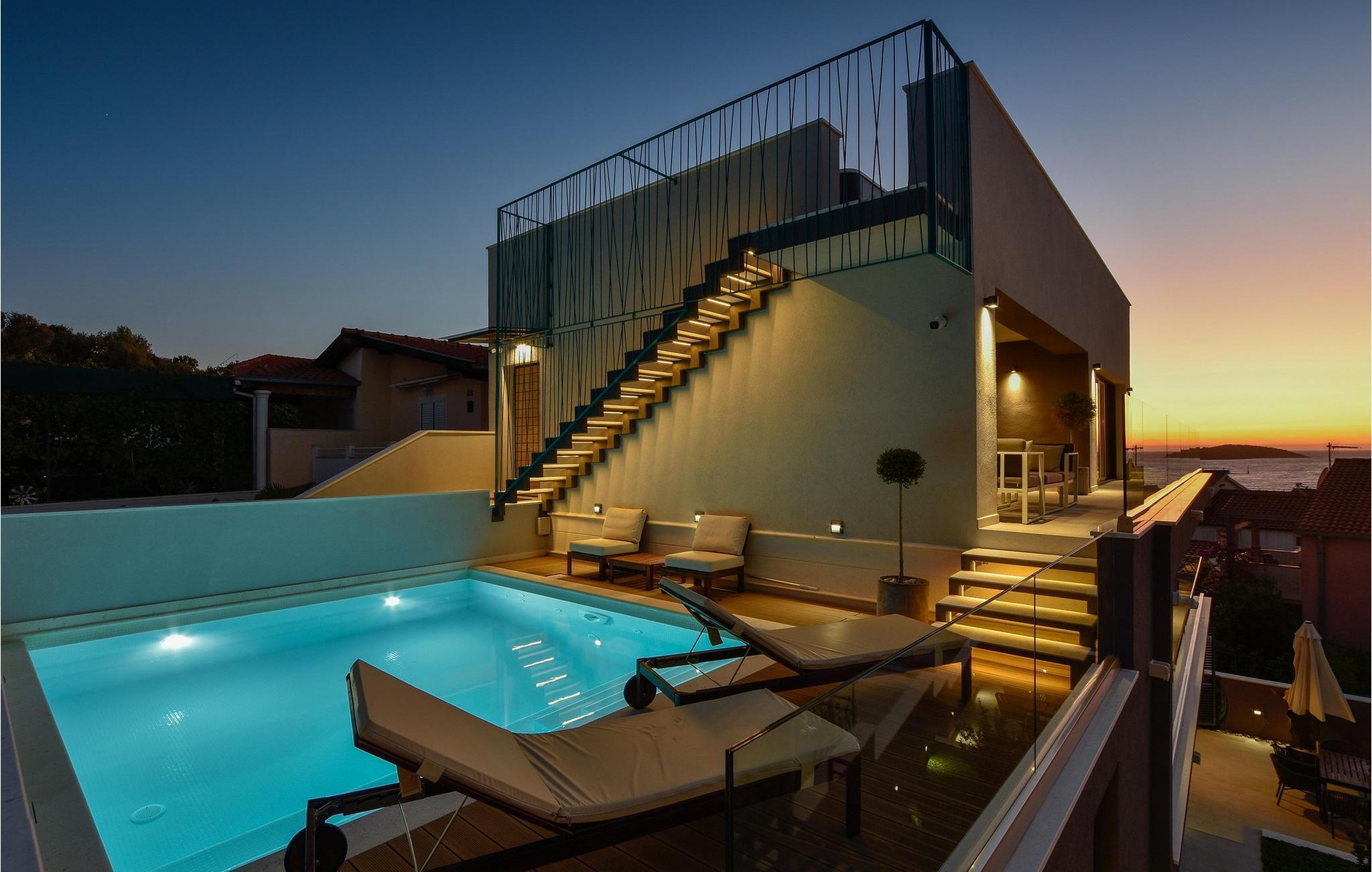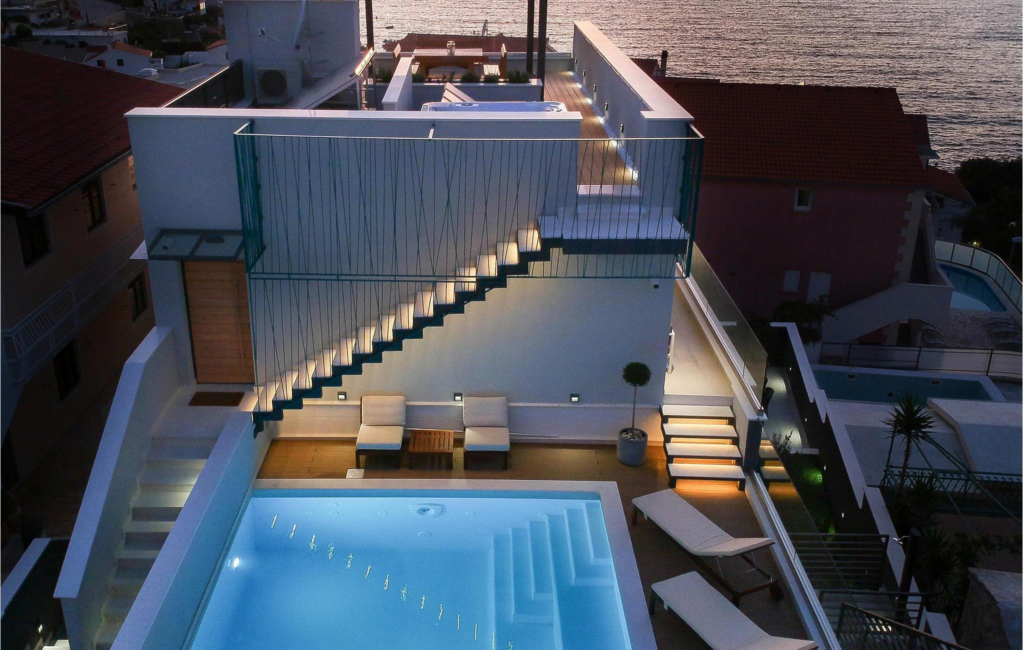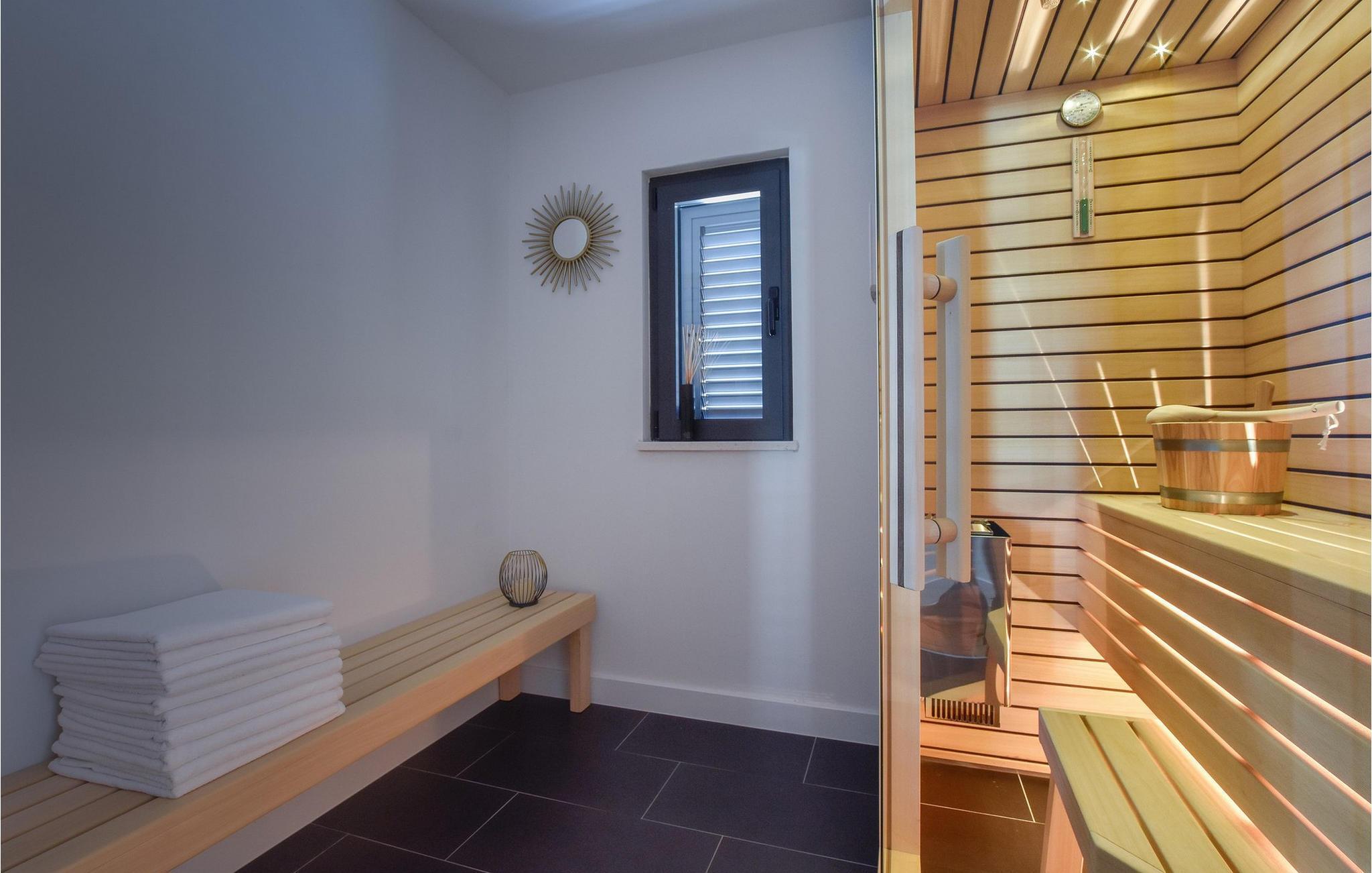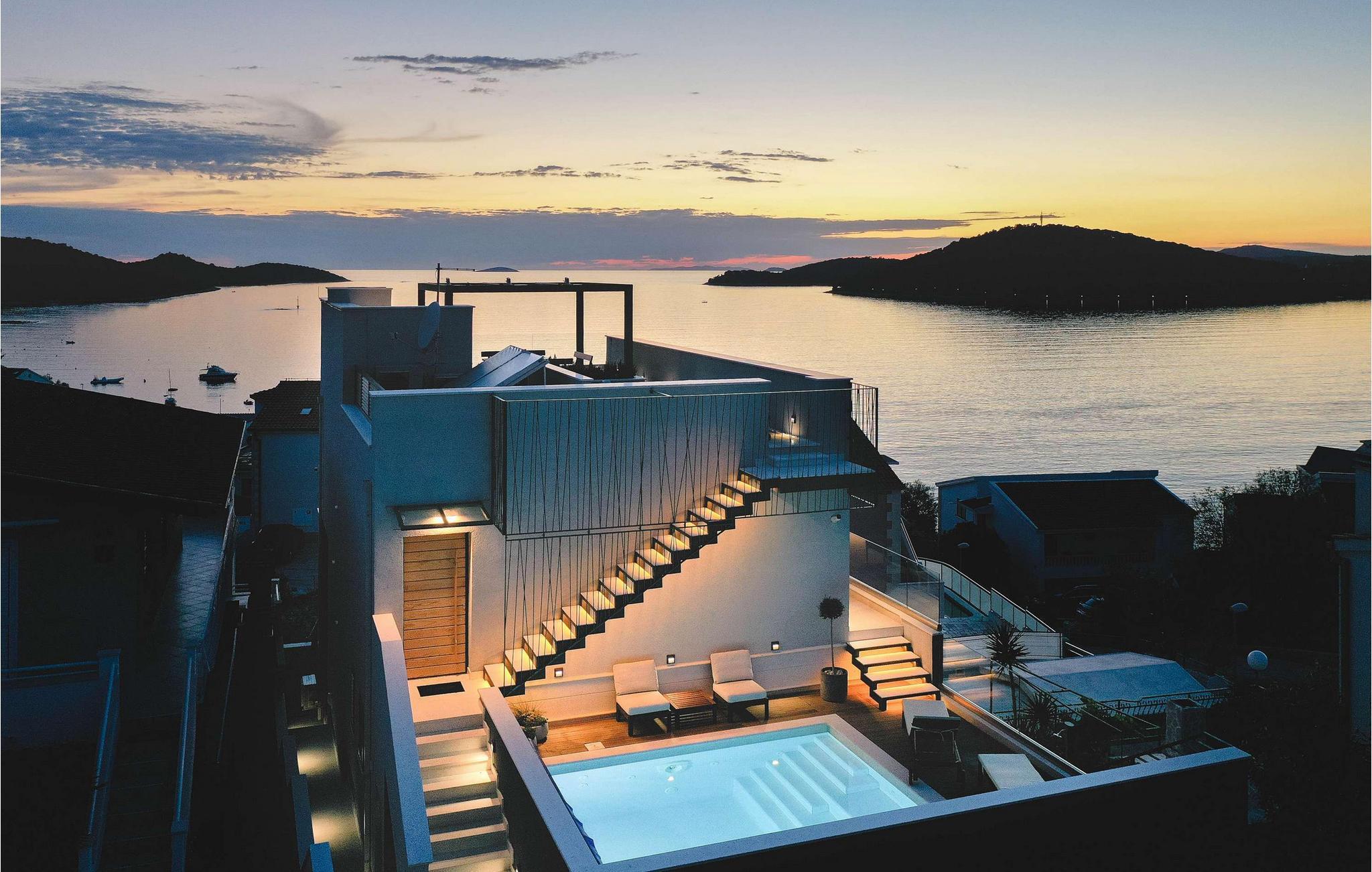 Lad jer fortrylle af denne drømmeagtige villa, der er noget særligt med en betagende udsigt over Adriaterhavet og øerne foran kysten. Velkommen til Villa Tempera i Ražanj. Den moderne arkitektur med rene linjer og stilfuldt interiør skaber en luksuriøs, men afslappet atmosfære. Udforsk de mange etager. Det fuldt udstyrede køkken med tilhørende spiseplads tilbyder rigelig plads til hyggelige aftener, mens den luftige stue lægger op til hyggestunder. Udfordr jer selv med et spil billard eller dart i aktivitetsrummet eller slap af i saunaen på den komfortable soveværelsesetage. Et særligt højdepunkt er den rummelige tagterrasse med spabad - perfekt til at nyde solnedgangen over havet. I haven finder I en opvarmet pool omgivet af liggestole samt et grillområde til jeres kulinariske lækkerier. Omgivelserne omkring Ražanj byder på talrige muligheder for afslapning og udforskning. Kun få meter væk finder I maleriske klippestrande med små stenstrande, der lægger op til at svømme og slappe af. Selve byen er omgivet af duftende fyrreskove, ideel til gåture og cykelture. For en varieret dagstur tilbyder de historiske byer Šibenik, Split og Primošten imponerende seværdigheder og førsteklasses restauranter. Vandsportsentusiaster og aktive feriegæster vil også finde masser at nyde i regionen, uanset om det er sejlads, dykning eller udforskning af kysten med båd. Bemærk venligst: Ejendommen accepterer ikke polterabender eller ungdomsgrupper under 30 år. Bookinger fra sådanne grupper vil blive afvist, selv ved ankomst eller under opholdet, uden refusion.
