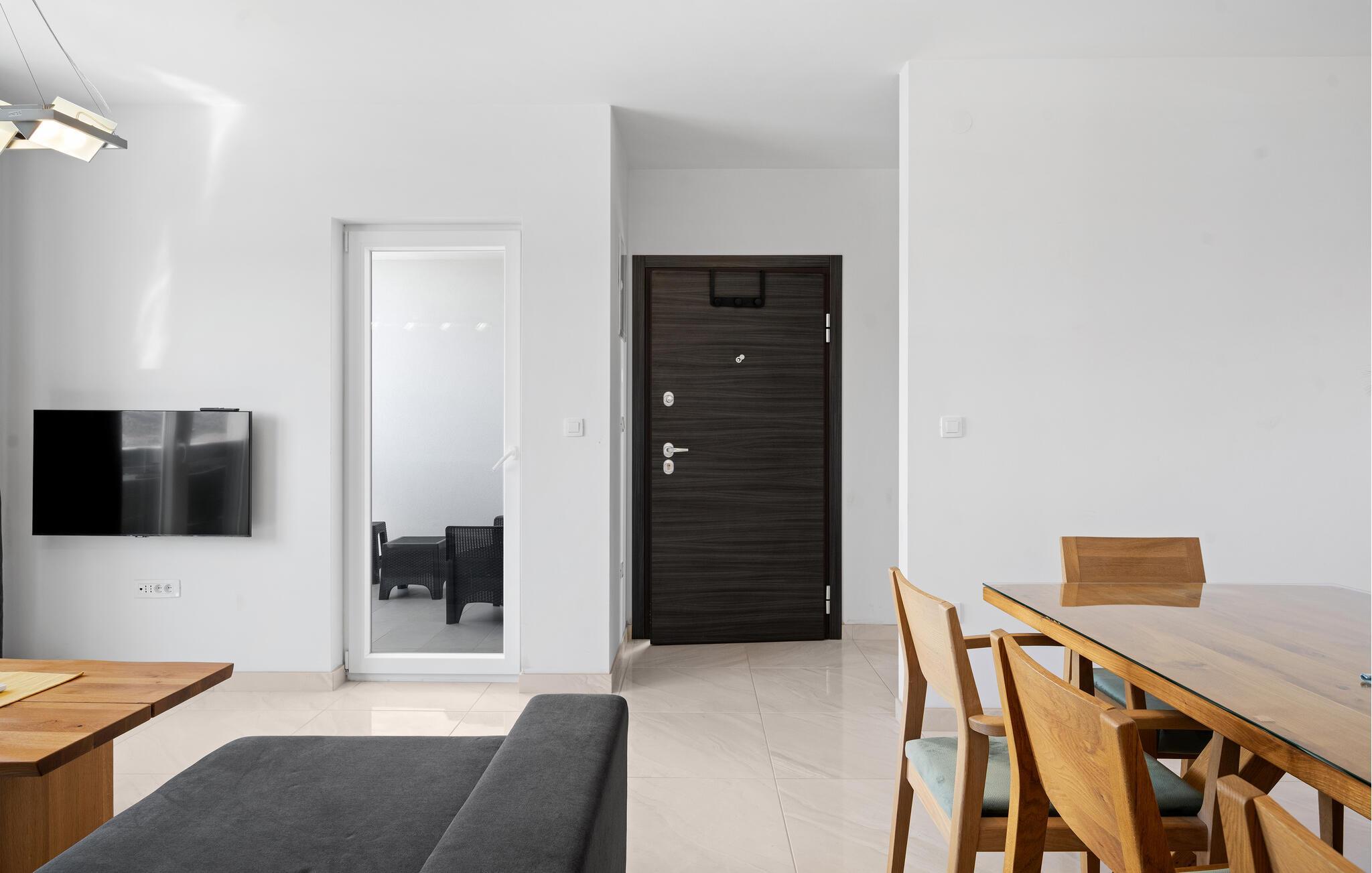 De lyse rum med store vinduer skaber en åben, rolig atmosfære, hvor I nemt kan slappe af. Elegant design, omhyggeligt udvalgte møbler og nærheden til havet gør denne lejlighed til en skøn oase, hvor I kan nyde ferien fuldt ud – uanset om det er med musik, en film eller en aften sammen i køkkenet.