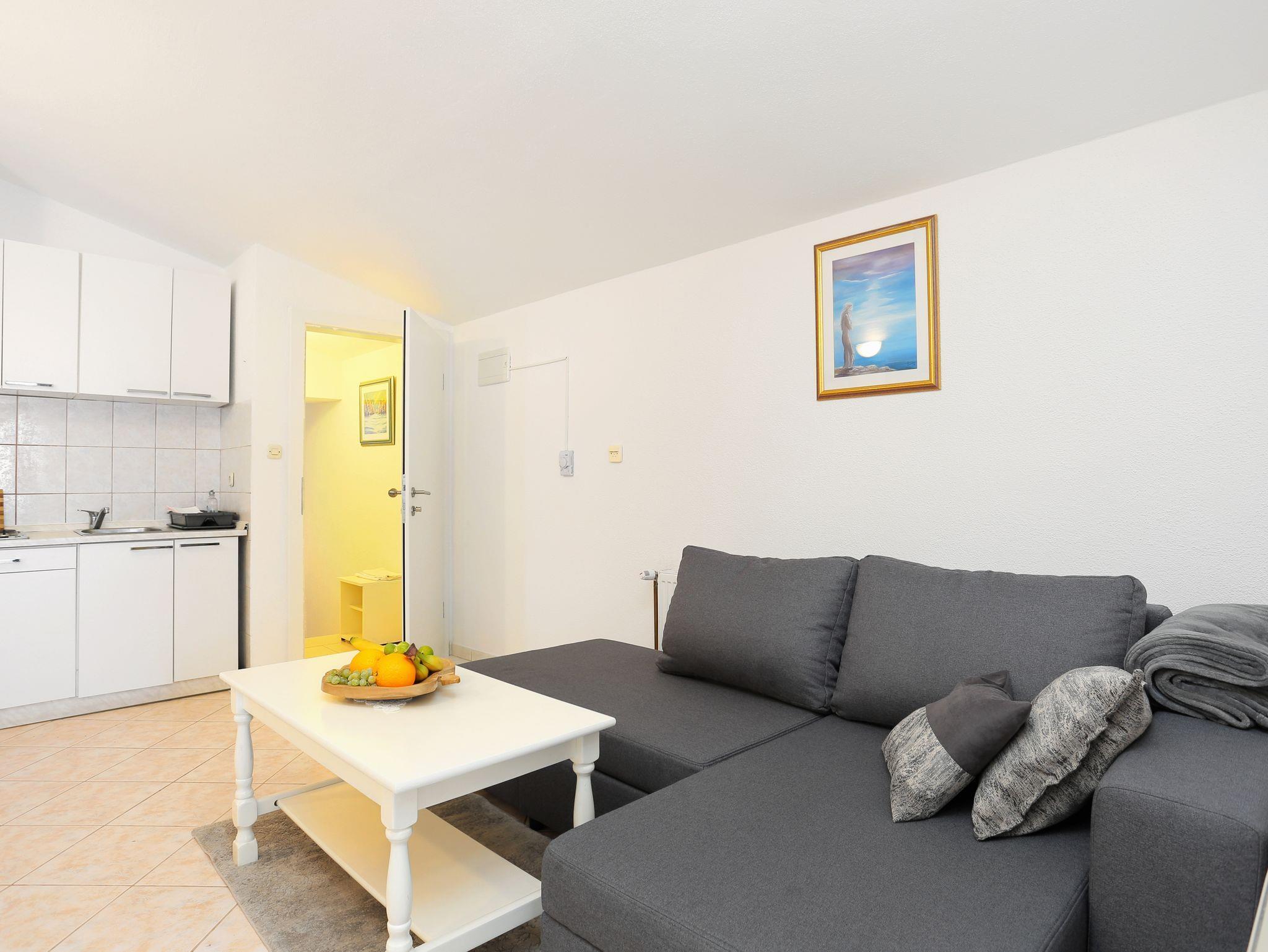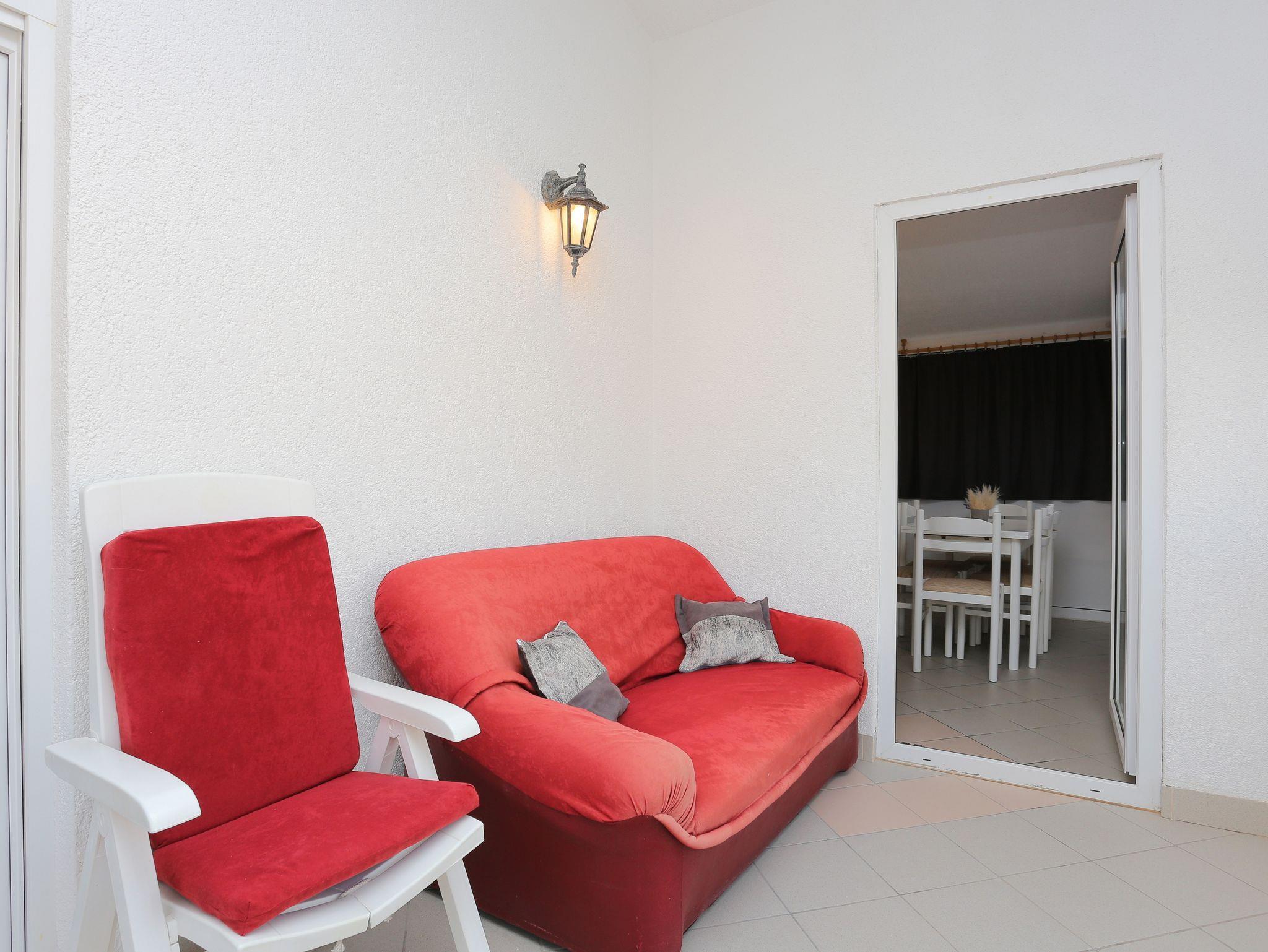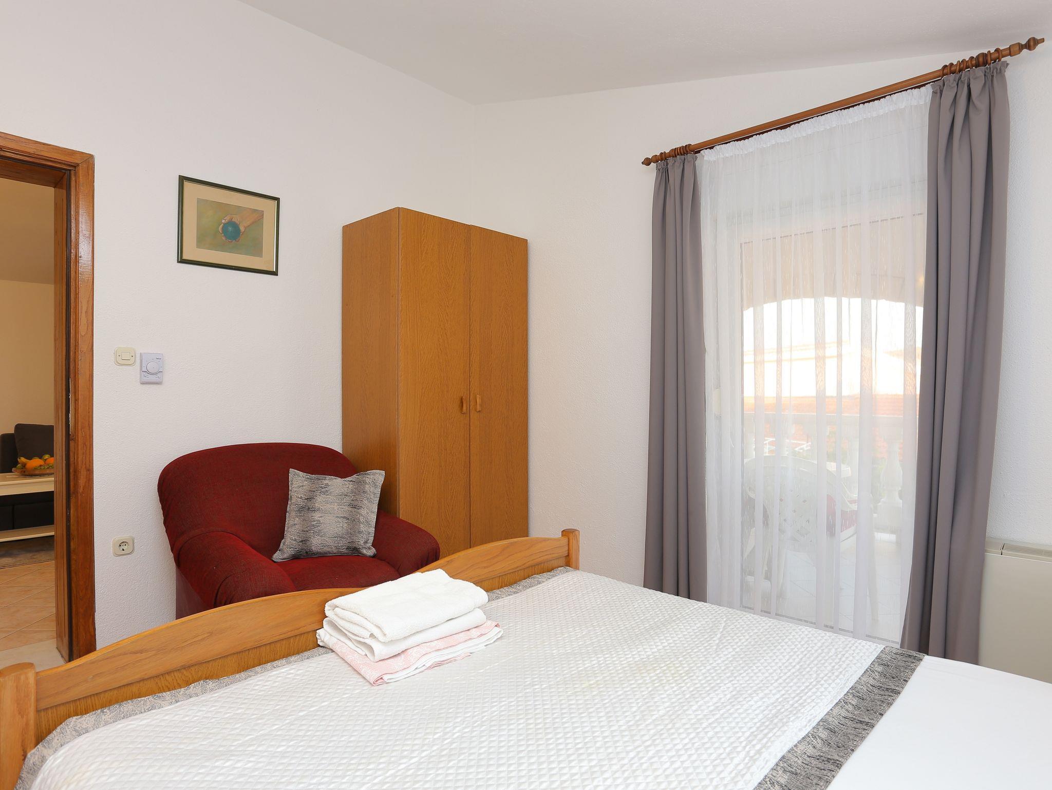 Ferienwohnung bietet Platz für 6 Gäste. Die Betten sind in Schlafzimmern, die es 2 gibt, und in Wohnzimmer, innerhalb einer Gesamtfläche von 45m2, angeordnet. Die Gäste haben eine eigene Terrasse zur Verfügung, auf der sie in warmen Sommernächten genießen können. Das Apartment bietet Meerblick. Es ist erlaubt, Speisen auf dem Gemeinschafts-Grill vorzubereiten. IM PREIS INBEGRIFFEN: Kurtaxe, Endreinigung, Klimatisierung, Parkplatz, Internet, Kinderbett, Bügeleisen, Bügelbrett. VERBINDLICHE ZUSÄTZLICHE KOSTEN: Aufzahlung für Kurzaufenthalte (prozentualer Zuschlag pro Nächtigungsanzahl: 30% - 1, 20% - 2, 10% - 3). UNVERBINDLICHE ZUSÄTZLICHE KOSTEN: Wäschewaschen (1,00 € Waschen). Die Verfügbarkeit zusätzlicher Dienstleistungen in Ihrem reservierten Termin und die Preise derselben (falls nicht aufgeführt) müssen im Voraus überprüft werden. Zusätzliche Dienstleistungen die in der Zahlungsaufforderung nicht aufgeführt sind werden direkt beim Vermieter bezahlt, angenommen der Gast nutzt auch diese.