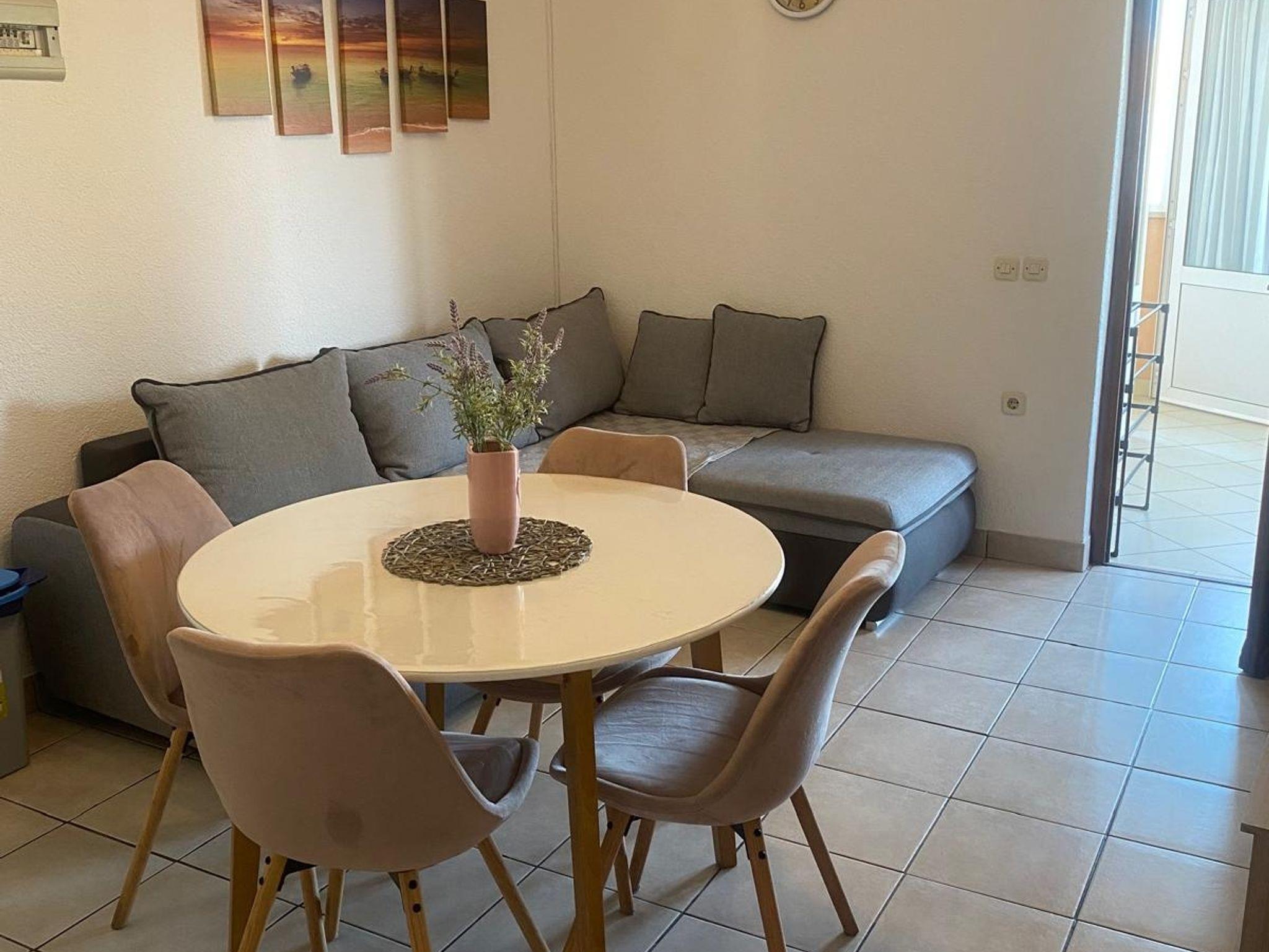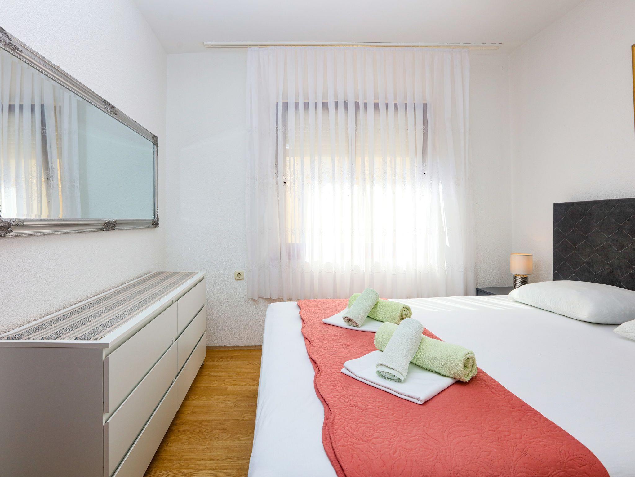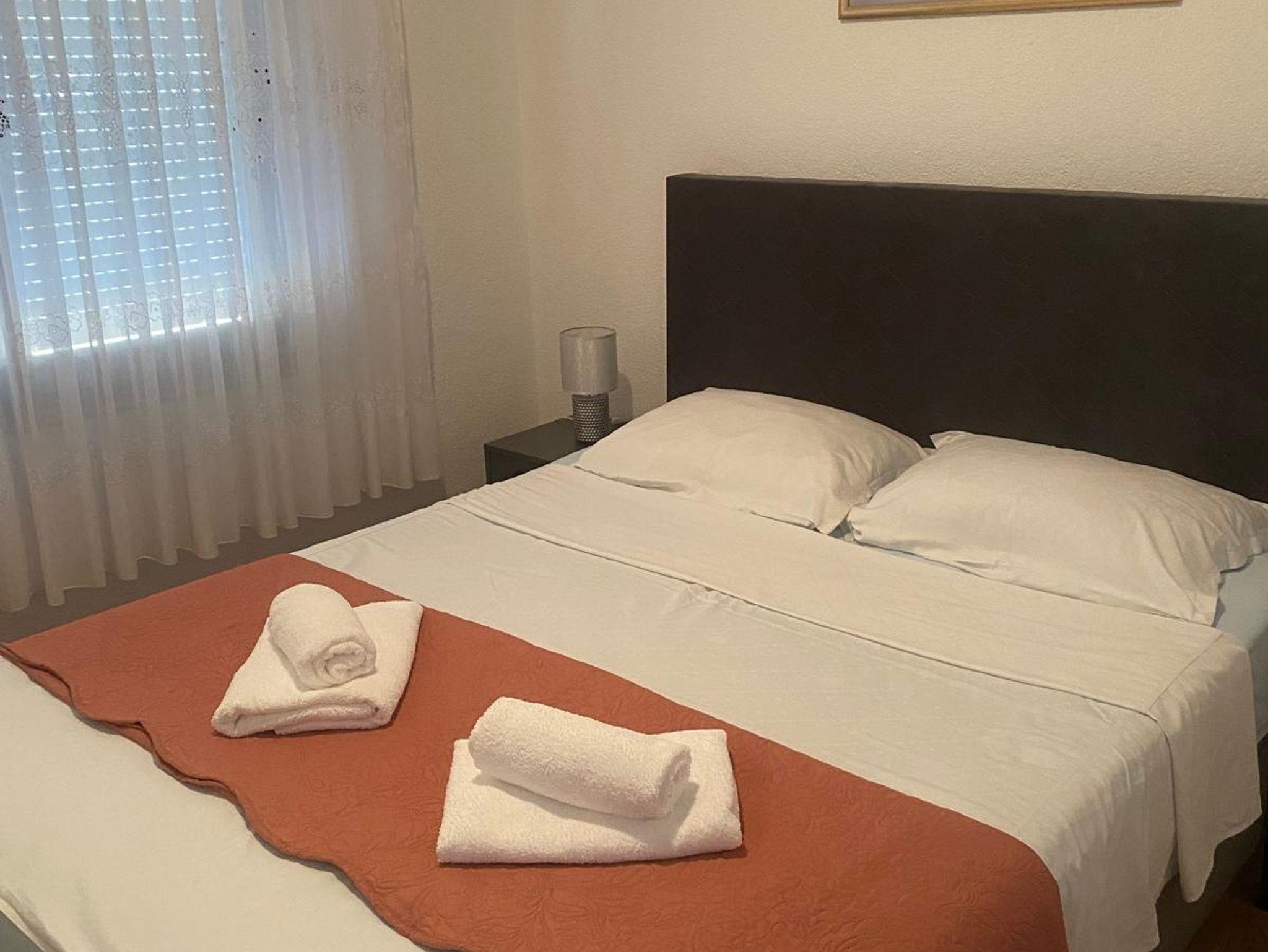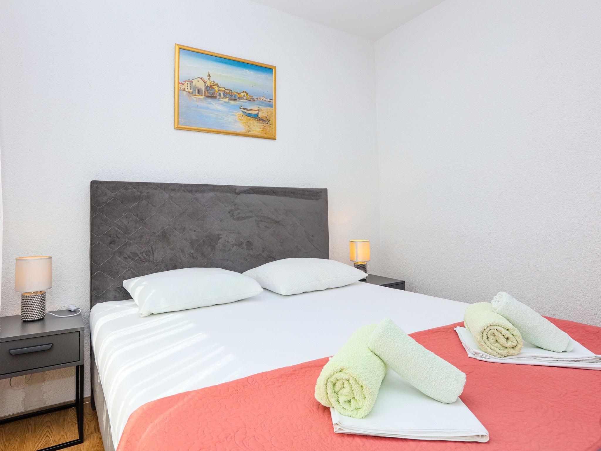 Ferienwohnung bietet Platz für 5 Gäste. Die Betten sind in Schlafzimmern, die es 2 gibt, und in Wohnzimmer, innerhalb einer Gesamtfläche von 44m2, angeordnet. Die Gäste haben eine eigene Terrasse zur Verfügung, auf der sie in warmen Sommernächten genießen können. Das Apartment bietet Meerblick. Es ist erlaubt, Speisen auf dem Gemeinschafts-Grill vorzubereiten. IM PREIS INBEGRIFFEN: Kurtaxe, Endreinigung, Klimatisierung, Parkplatz, Internet, Kinderbett, Bügeleisen, Bügelbrett, Föhn. VERBINDLICHE ZUSÄTZLICHE KOSTEN: Aufzahlung für Kurzaufenthalte (prozentualer Zuschlag pro Nächtigungsanzahl: 30% - 1, 20% - 2, 10% - 3). Die Verfügbarkeit zusätzlicher Dienstleistungen in Ihrem reservierten Termin und die Preise derselben (falls nicht aufgeführt) müssen im Voraus überprüft werden. Zusätzliche Dienstleistungen die in der Zahlungsaufforderung nicht aufgeführt sind werden direkt beim Vermieter bezahlt, angenommen der Gast nutzt auch diese. Ermäßigung auf den Grundpreis: Gratistag 14=13 (bei einem Aufenthalt von 14 Tagen oder mehr erhalten Sie einen Gratistag für den Aufenthalt bis 31.12.26).