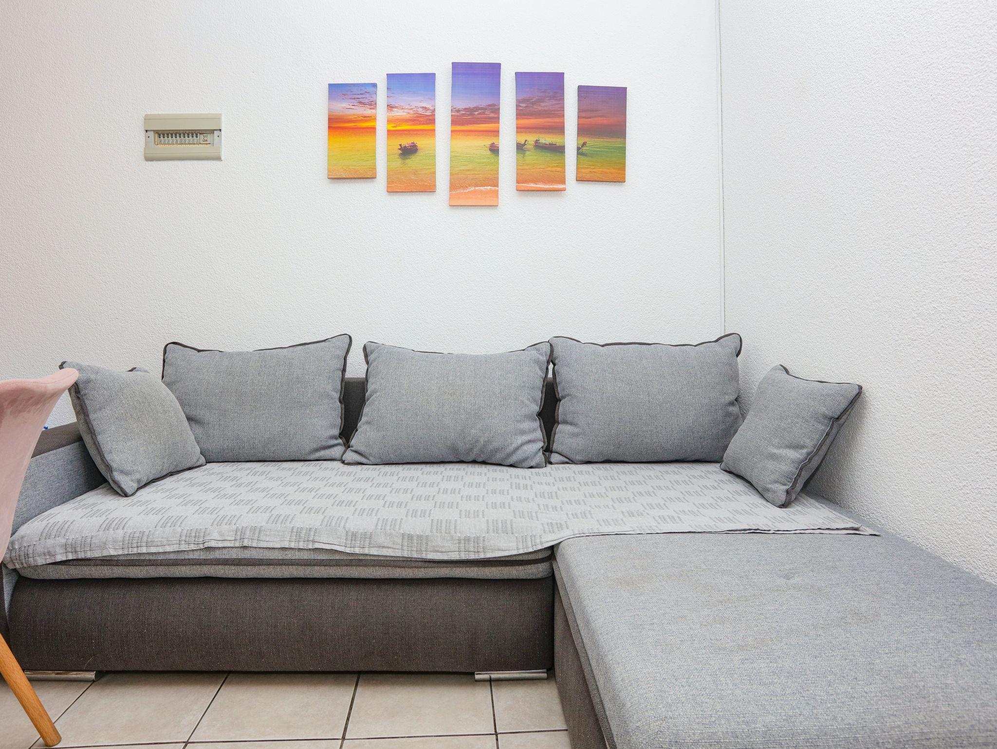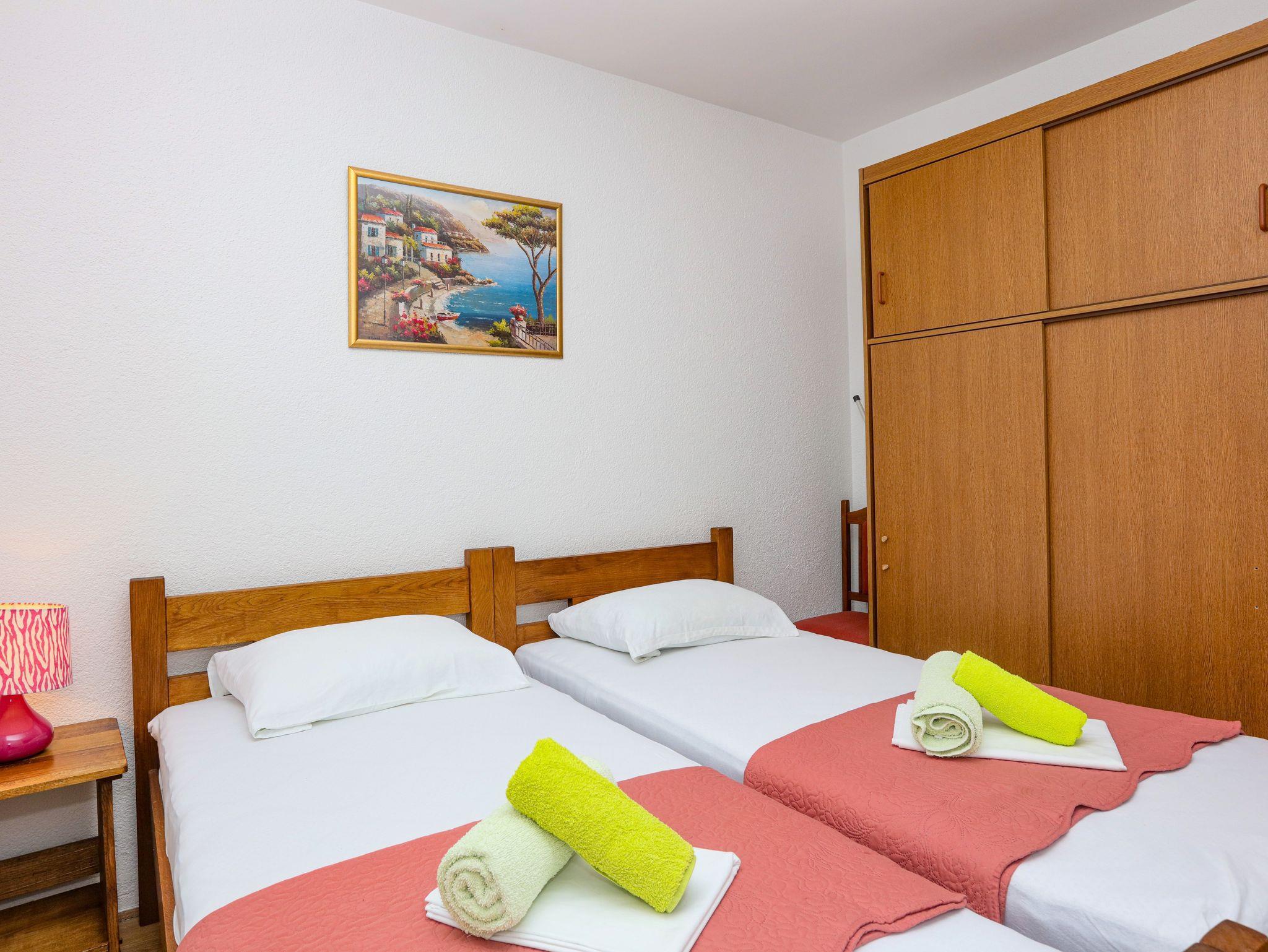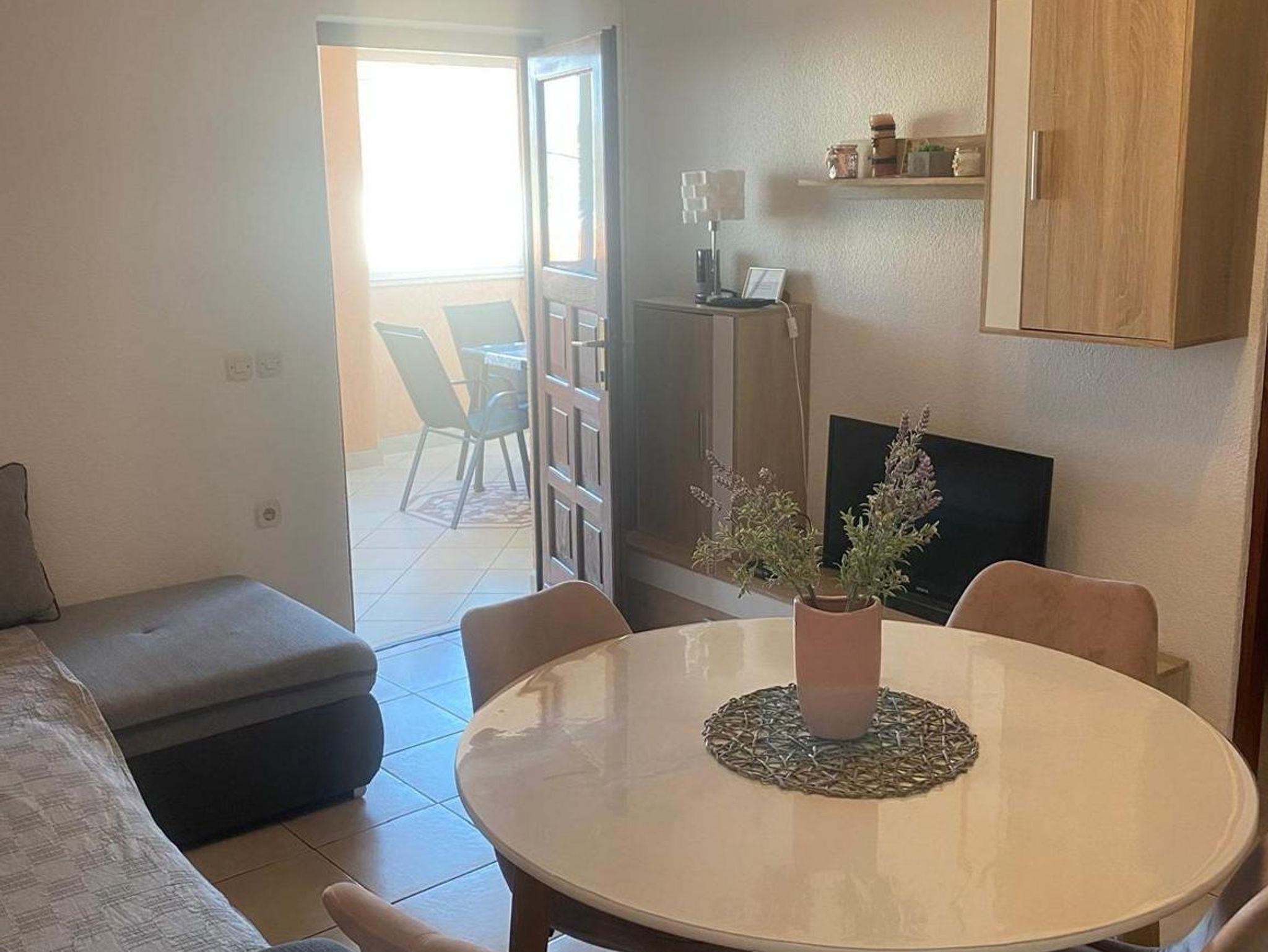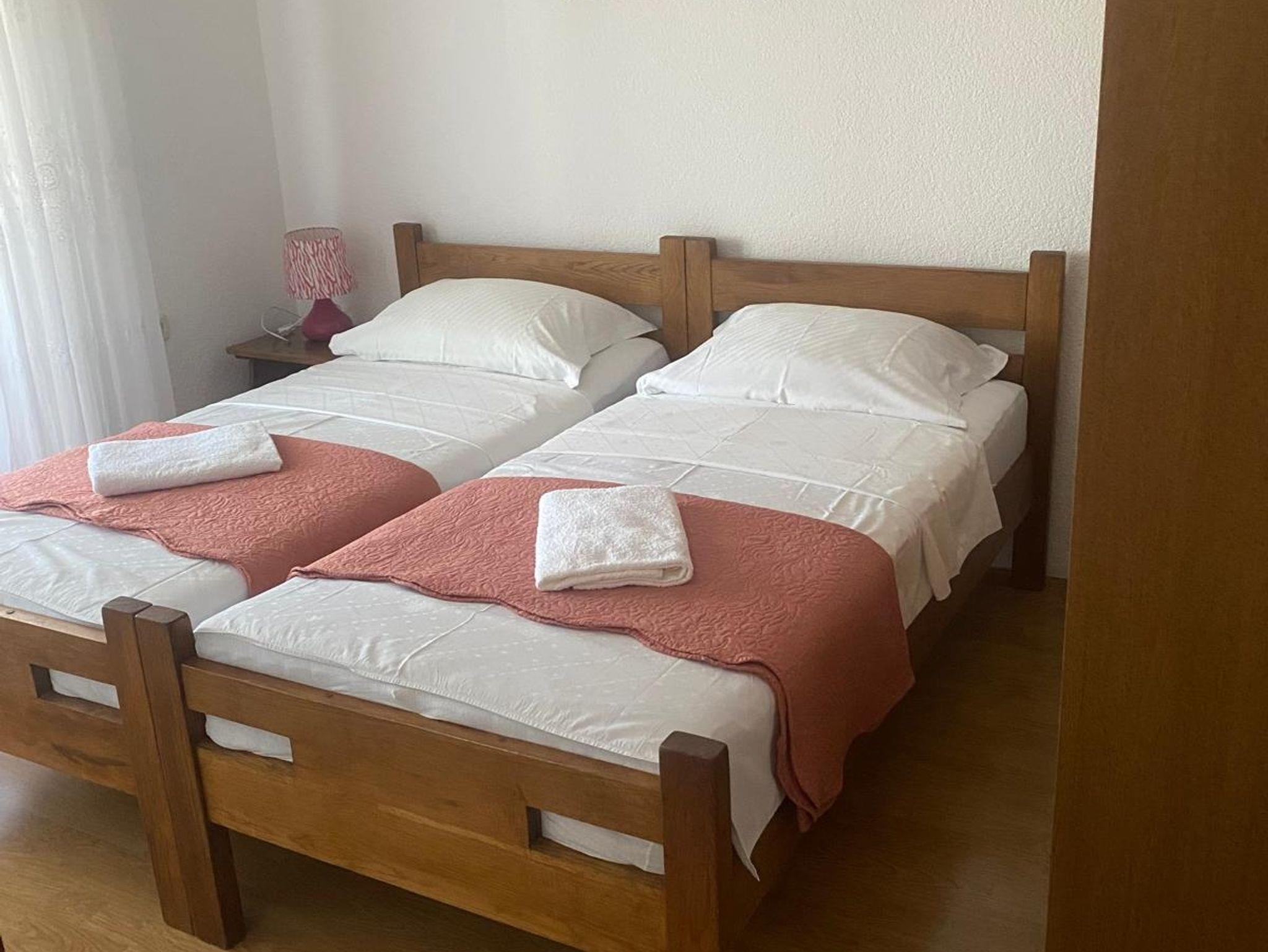 Ferienwohnung bietet Platz für 5 Gäste. Die Betten sind in Schlafzimmern, die es 2 gibt, und in Wohnzimmer, innerhalb einer Gesamtfläche von 44m2, angeordnet. Die Gäste haben eine eigene Terrasse zur Verfügung, auf der sie in warmen Sommernächten genießen können. Das Apartment bietet Meerblick. Es ist erlaubt, Speisen auf dem Gemeinschafts-Grill vorzubereiten. IM PREIS INBEGRIFFEN: Kurtaxe, Endreinigung, Klimatisierung, Parkplatz, Internet, Kinderbett, Bügeleisen, Bügelbrett, Föhn. VERBINDLICHE ZUSÄTZLICHE KOSTEN: Aufzahlung für Kurzaufenthalte (prozentualer Zuschlag pro Nächtigungsanzahl: 30% - 1, 20% - 2, 10% - 3). Die Verfügbarkeit zusätzlicher Dienstleistungen in Ihrem reservierten Termin und die Preise derselben (falls nicht aufgeführt) müssen im Voraus überprüft werden. Zusätzliche Dienstleistungen die in der Zahlungsaufforderung nicht aufgeführt sind werden direkt beim Vermieter bezahlt, angenommen der Gast nutzt auch diese. Ermäßigung auf den Grundpreis: Gratistag 14=13 (bei einem Aufenthalt von 14 Tagen oder mehr erhalten Sie einen Gratistag für den Aufenthalt bis 31.12.26).