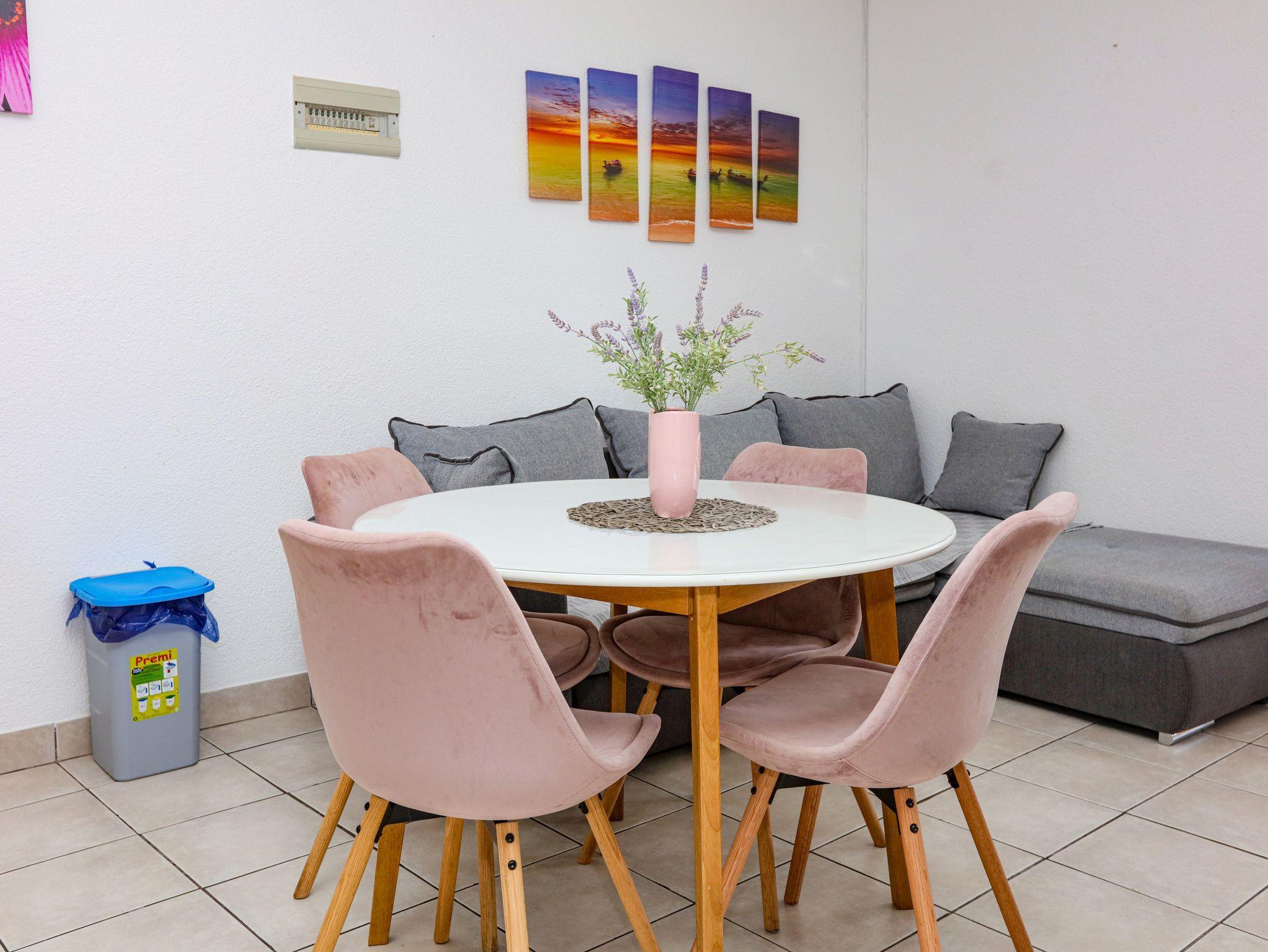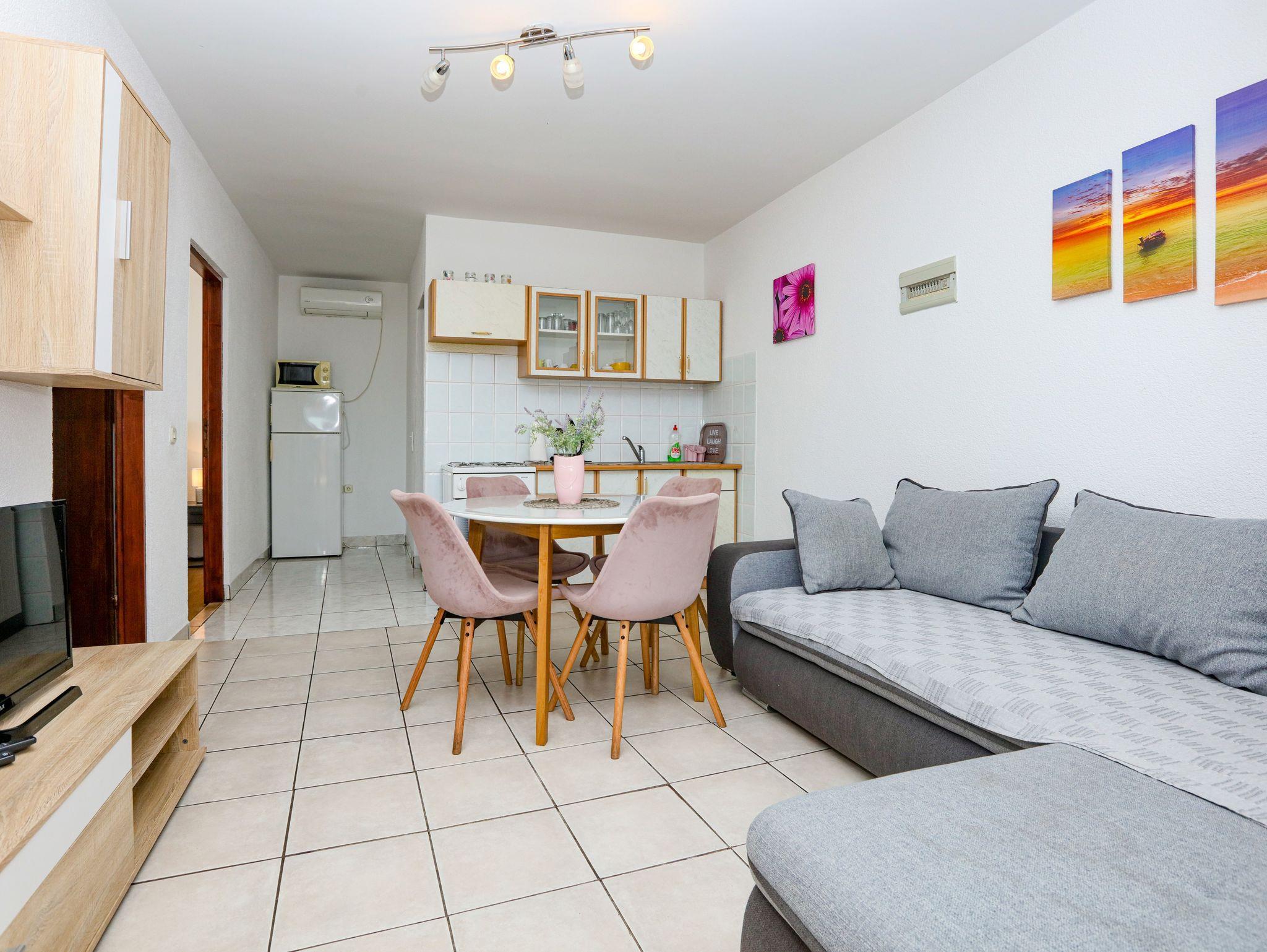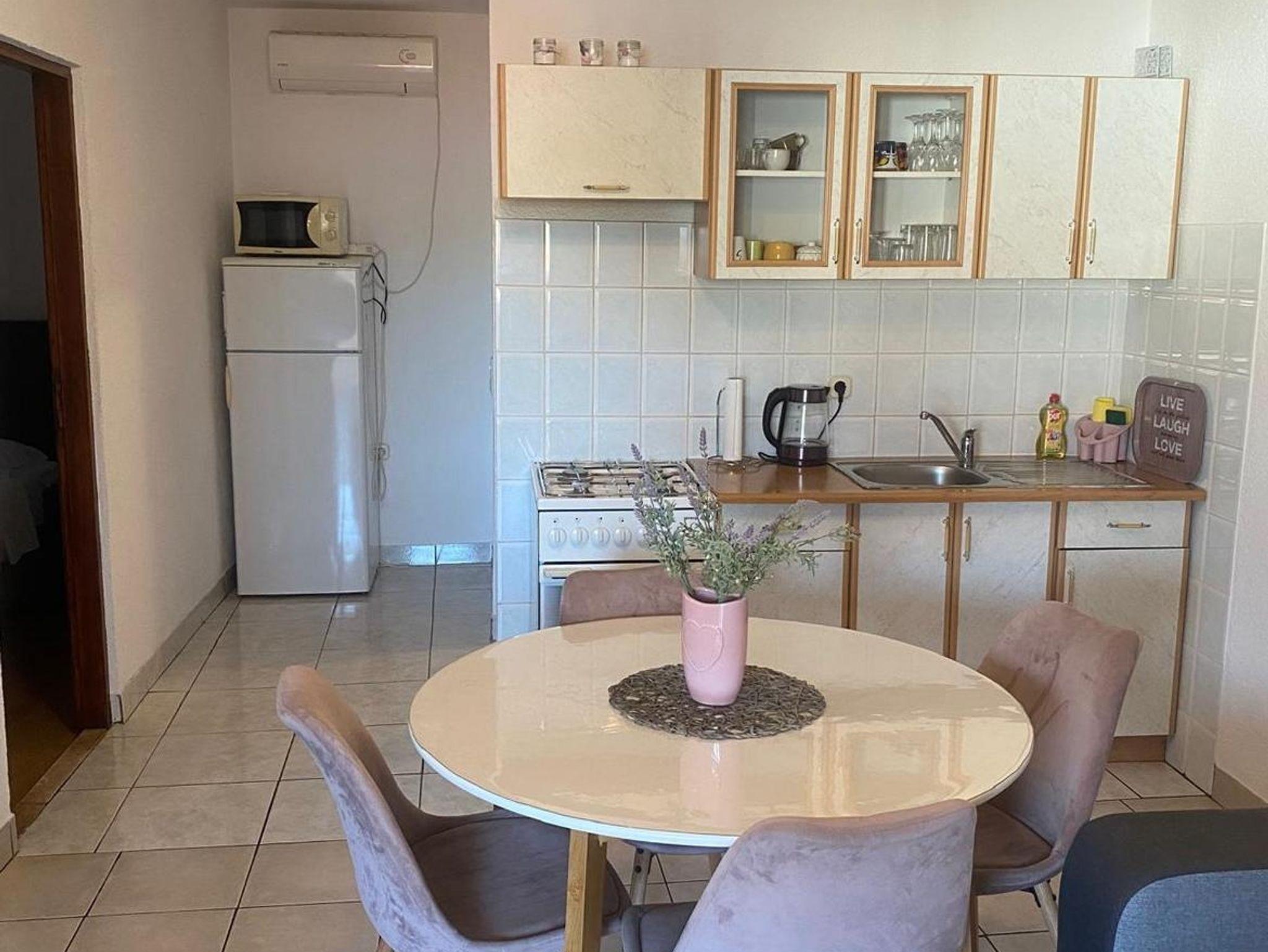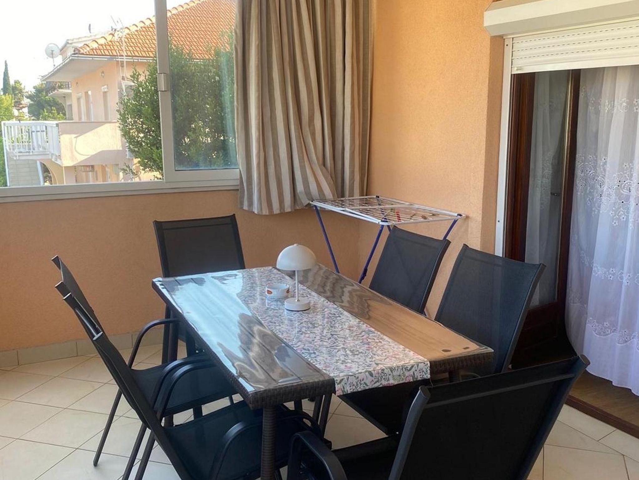 Ferienwohnung bietet Platz für 5 Gäste. Die Betten sind in Schlafzimmern, die es 2 gibt, und in Wohnzimmer, innerhalb einer Gesamtfläche von 44m2, angeordnet. Die Gäste haben eine eigene Terrasse zur Verfügung, auf der sie in warmen Sommernächten genießen können. Das Apartment bietet Meerblick. Es ist erlaubt, Speisen auf dem Gemeinschafts-Grill vorzubereiten. IM PREIS INBEGRIFFEN: Kurtaxe, Endreinigung, Klimatisierung, Parkplatz, Internet, Kinderbett, Bügeleisen, Bügelbrett, Föhn. VERBINDLICHE ZUSÄTZLICHE KOSTEN: Aufzahlung für Kurzaufenthalte (prozentualer Zuschlag pro Nächtigungsanzahl: 30% - 1, 20% - 2, 10% - 3). Die Verfügbarkeit zusätzlicher Dienstleistungen in Ihrem reservierten Termin und die Preise derselben (falls nicht aufgeführt) müssen im Voraus überprüft werden. Zusätzliche Dienstleistungen die in der Zahlungsaufforderung nicht aufgeführt sind werden direkt beim Vermieter bezahlt, angenommen der Gast nutzt auch diese. Ermäßigung auf den Grundpreis: Gratistag 14=13 (bei einem Aufenthalt von 14 Tagen oder mehr erhalten Sie einen Gratistag für den Aufenthalt bis 31.12.26).