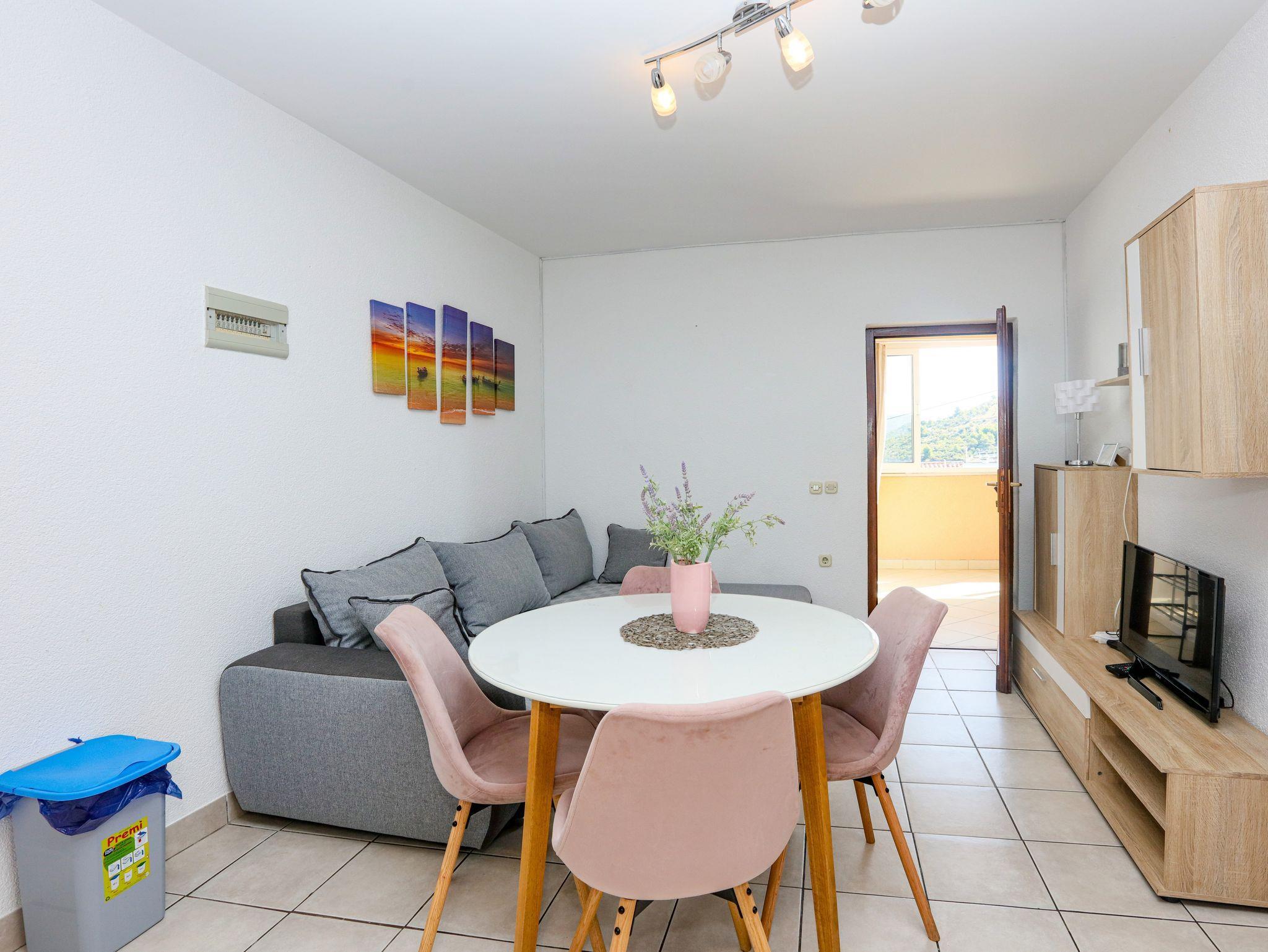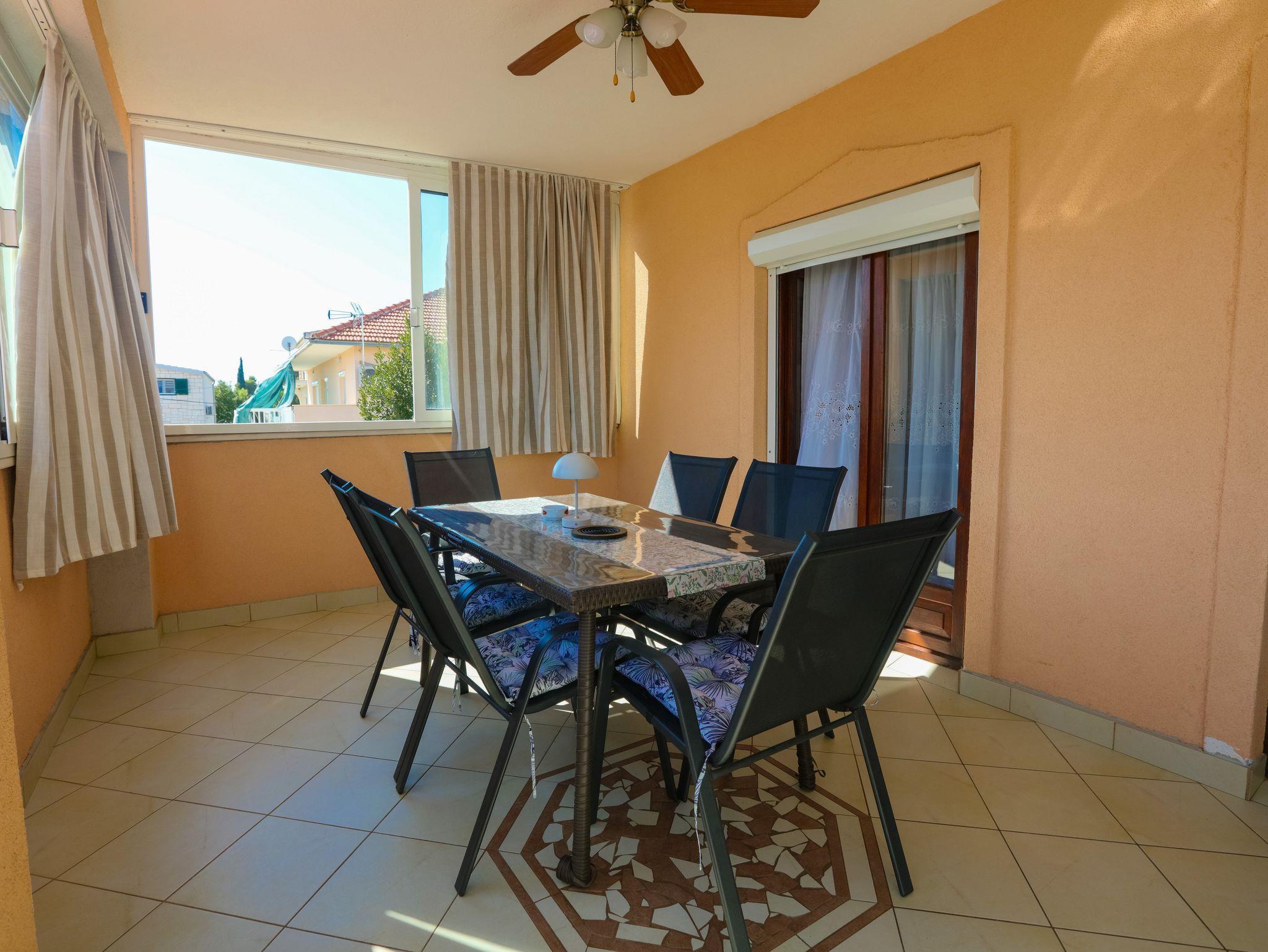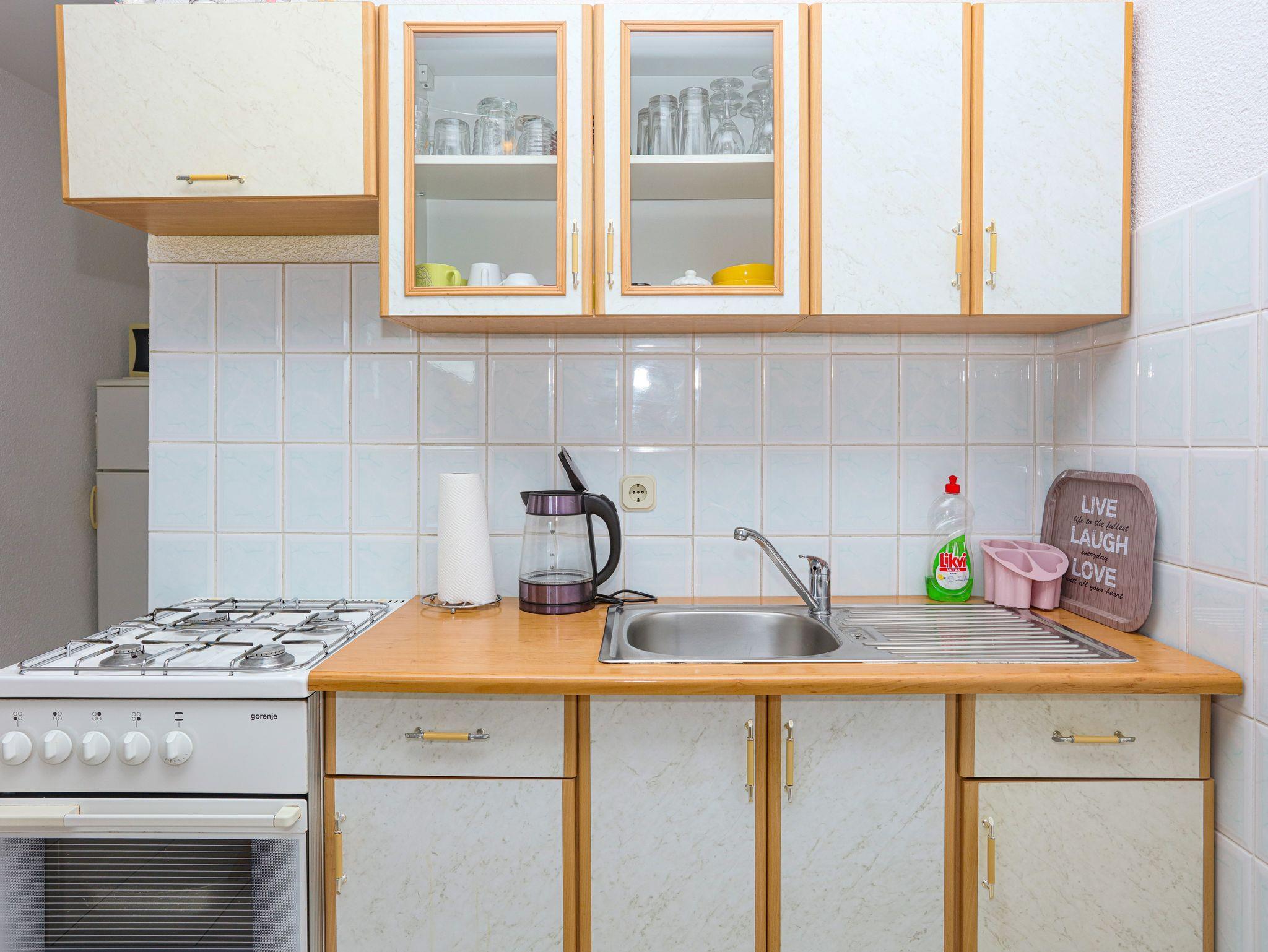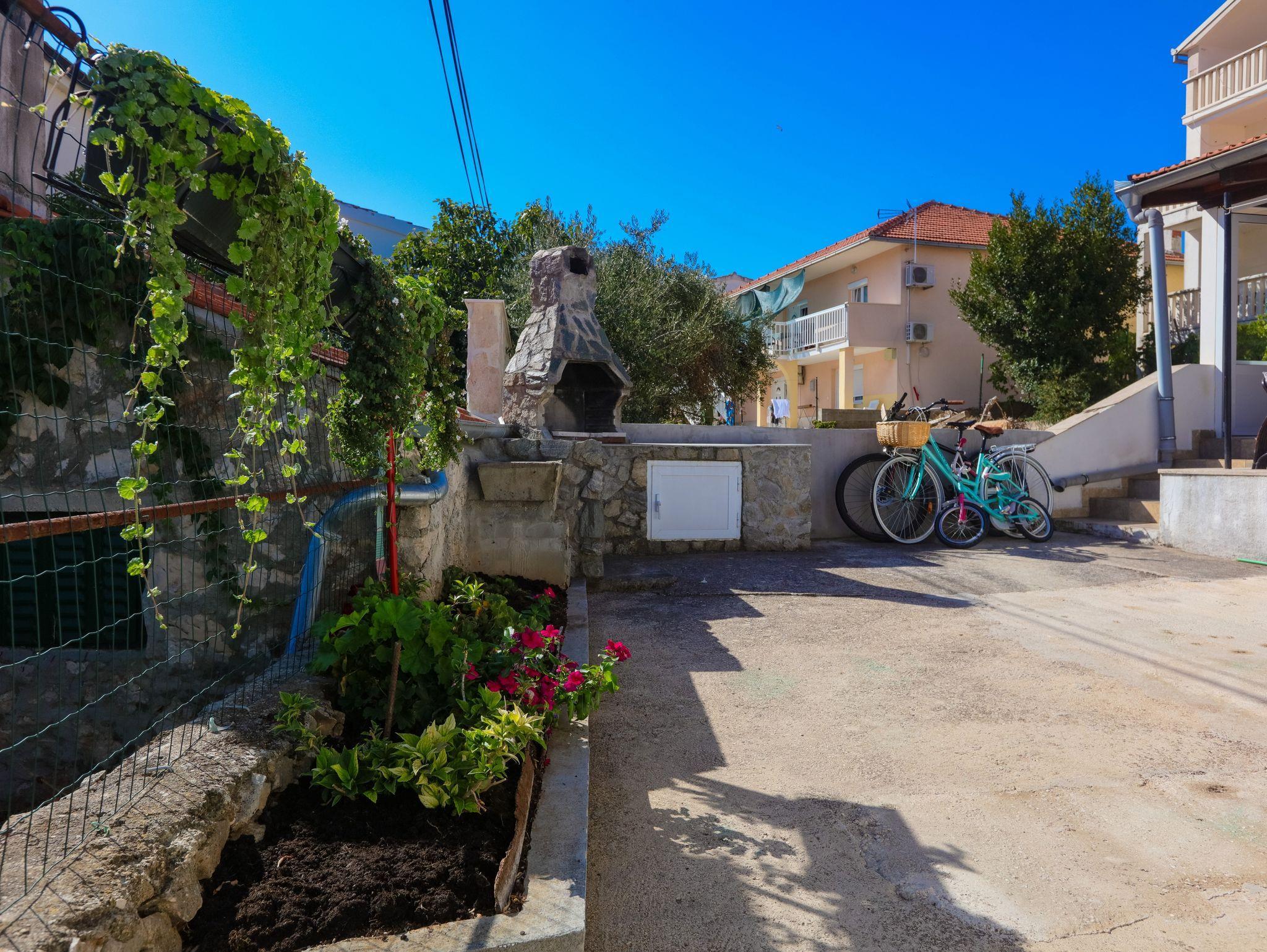 Ferienwohnung bietet Platz für 5 Gäste. Die Betten sind in Schlafzimmern, die es 2 gibt, und in Wohnzimmer, innerhalb einer Gesamtfläche von 44m2, angeordnet. Die Gäste haben eine eigene Terrasse zur Verfügung, auf der sie in warmen Sommernächten genießen können. Das Apartment bietet Meerblick. Es ist erlaubt, Speisen auf dem Gemeinschafts-Grill vorzubereiten. IM PREIS INBEGRIFFEN: Kurtaxe, Endreinigung, Klimatisierung, Parkplatz, Internet, Kinderbett, Bügeleisen, Bügelbrett, Föhn. VERBINDLICHE ZUSÄTZLICHE KOSTEN: Aufzahlung für Kurzaufenthalte (prozentualer Zuschlag pro Nächtigungsanzahl: 30% - 1, 20% - 2, 10% - 3). Die Verfügbarkeit zusätzlicher Dienstleistungen in Ihrem reservierten Termin und die Preise derselben (falls nicht aufgeführt) müssen im Voraus überprüft werden. Zusätzliche Dienstleistungen die in der Zahlungsaufforderung nicht aufgeführt sind werden direkt beim Vermieter bezahlt, angenommen der Gast nutzt auch diese. Ermäßigung auf den Grundpreis: Gratistag 14=13 (bei einem Aufenthalt von 14 Tagen oder mehr erhalten Sie einen Gratistag für den Aufenthalt bis 31.12.26).