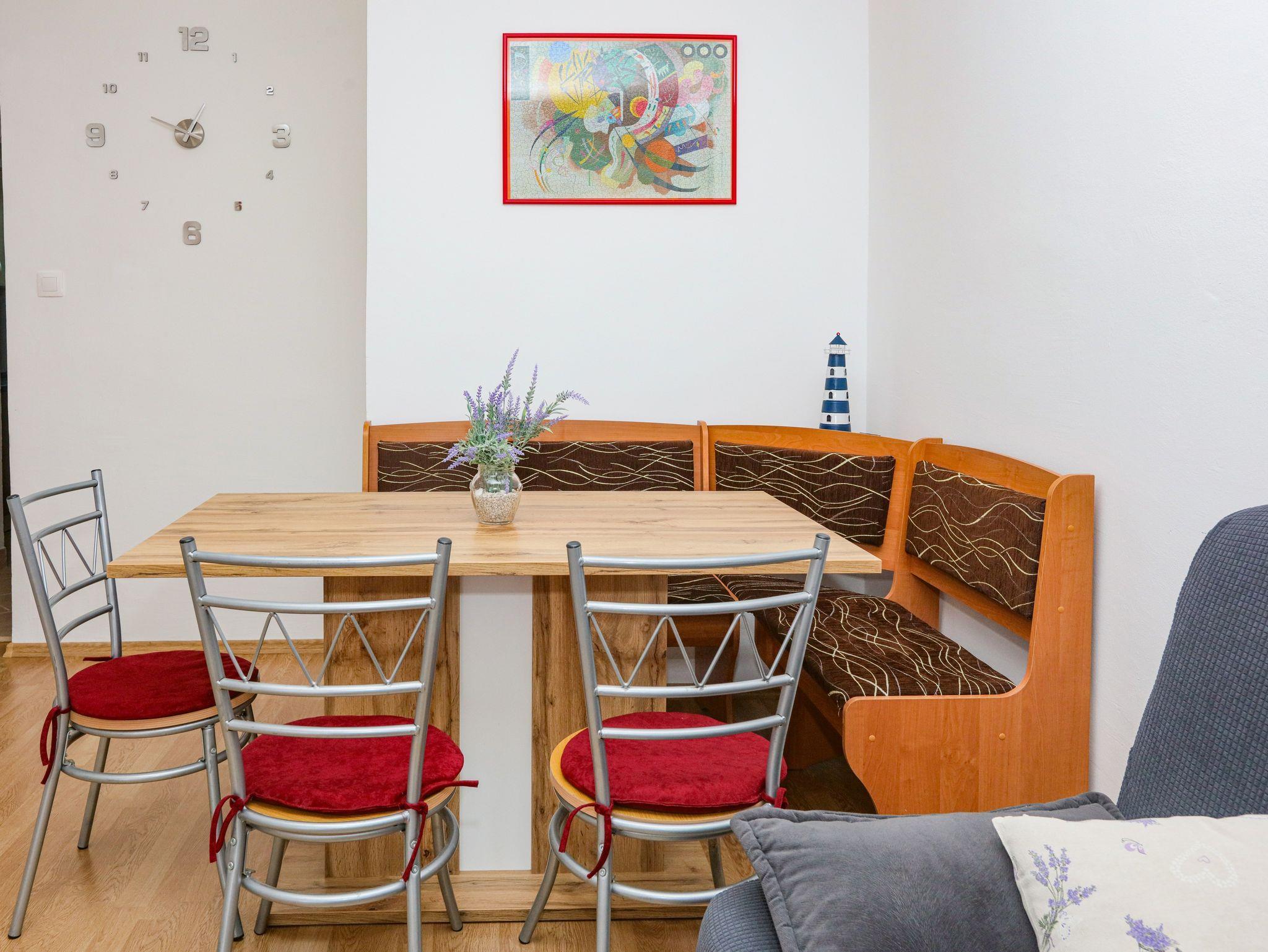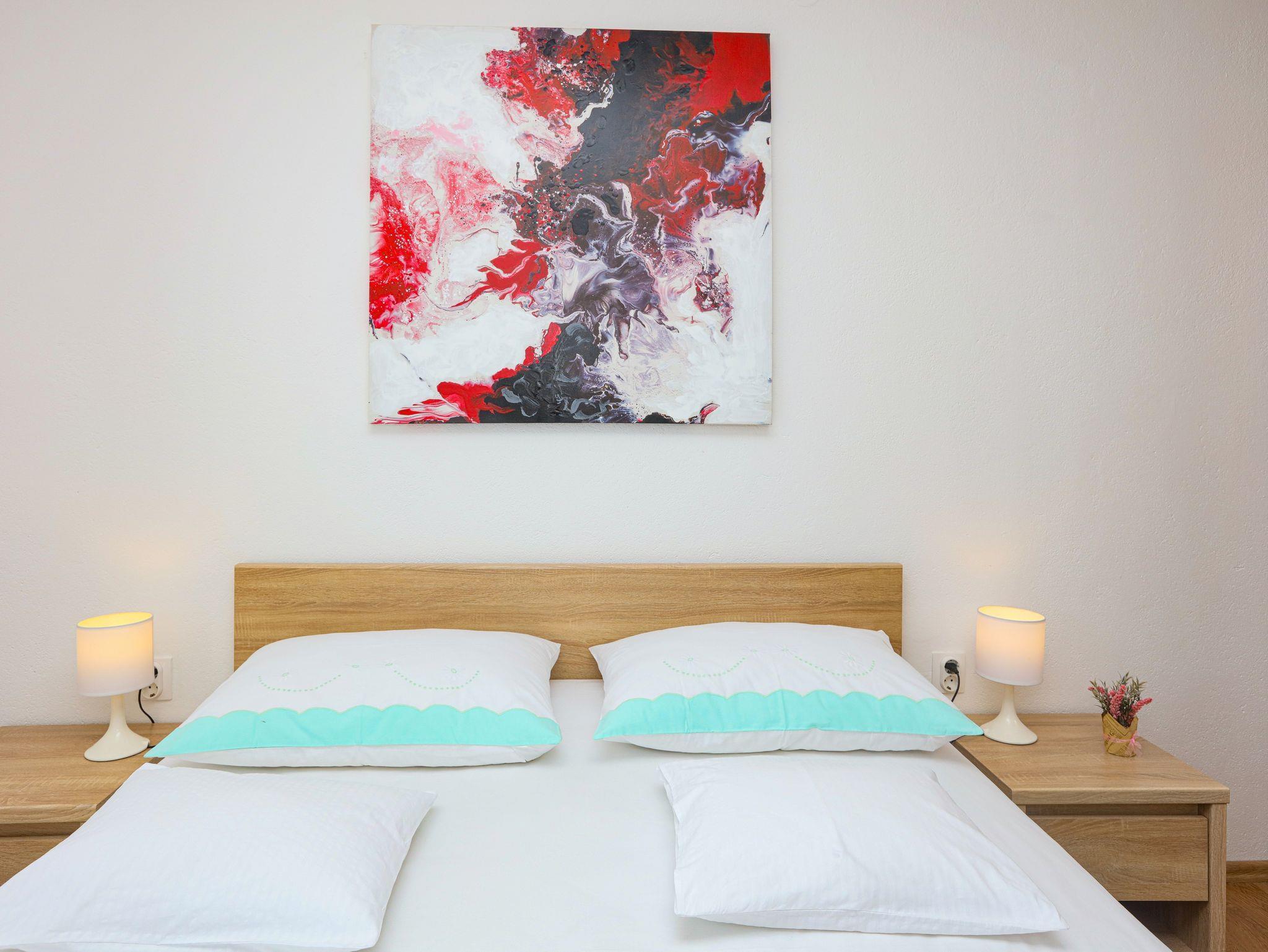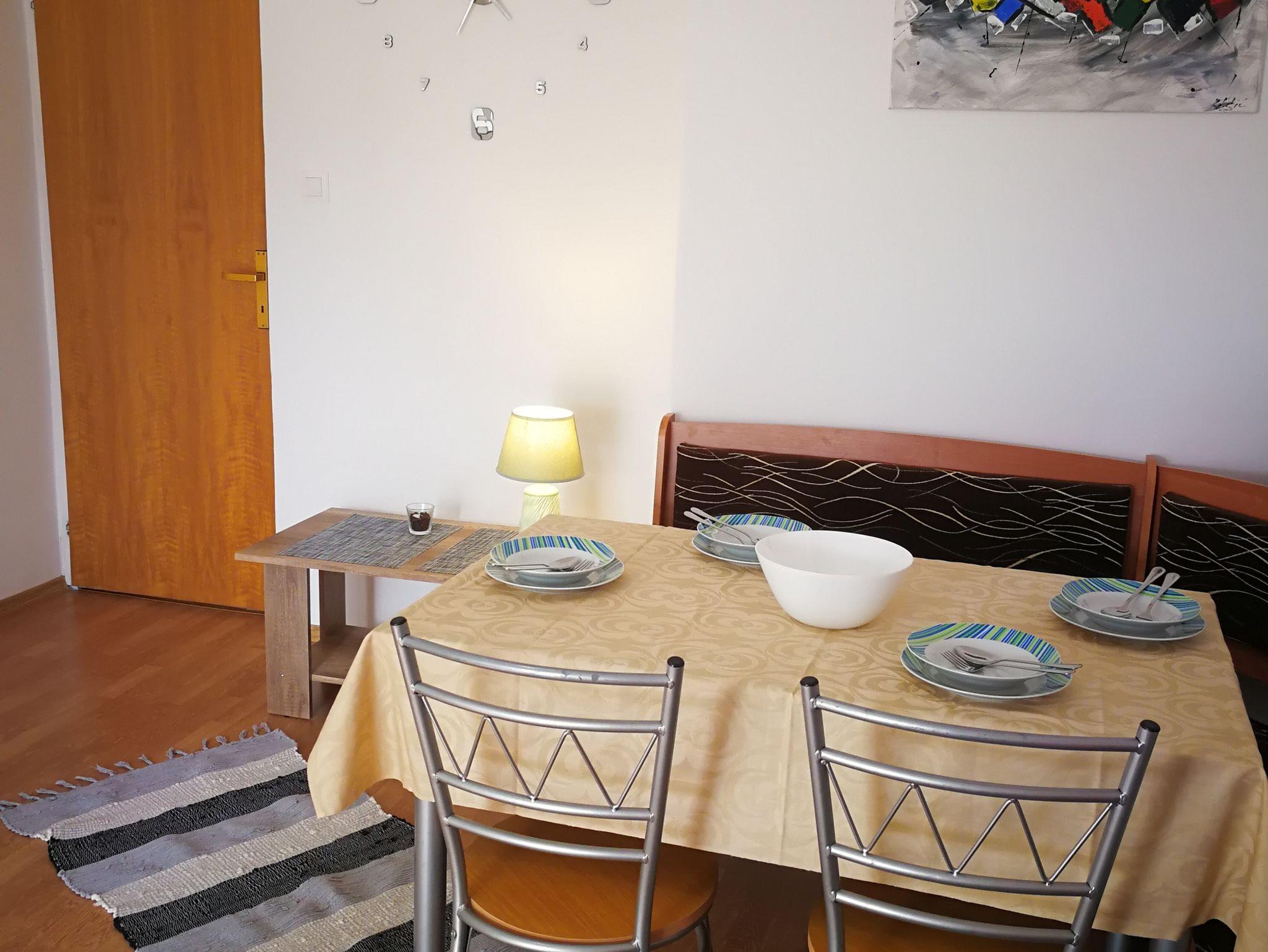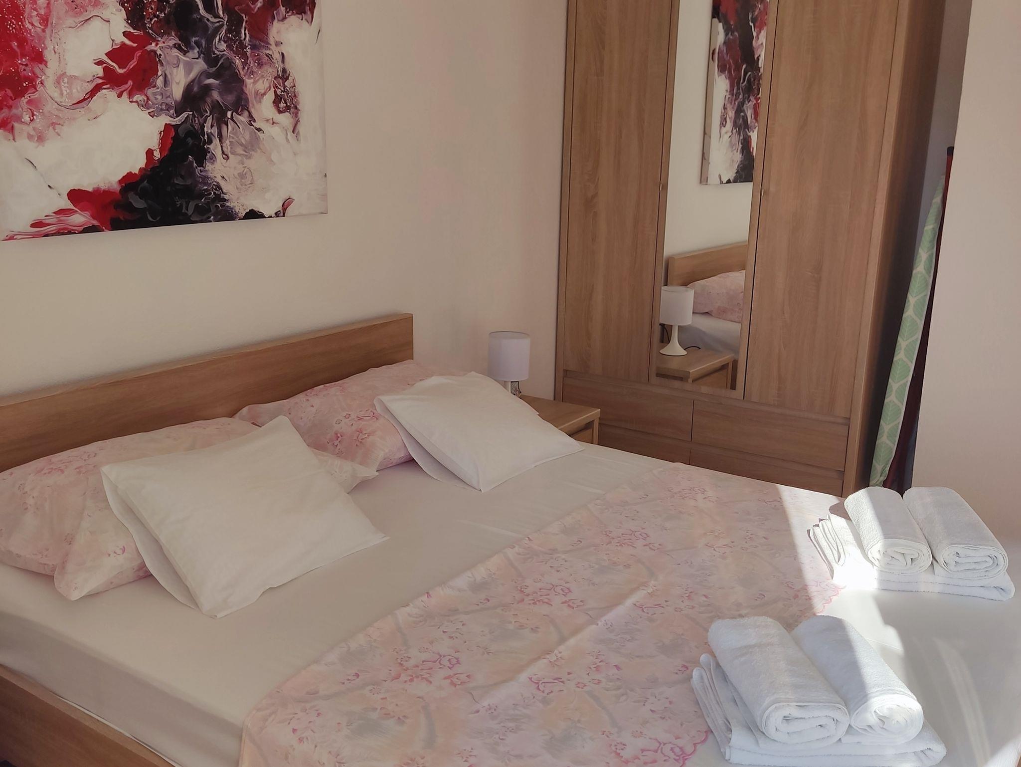 Ferienwohnung bietet Platz für 5 Gäste. Die Betten sind in Schlafzimmern, die es 2 gibt, und in Wohnzimmer, innerhalb einer Gesamtfläche von 50m2, angeordnet. Die Gäste haben eine eigene Terrasse zur Verfügung, auf der sie in warmen Sommernächten genießen können. Das Apartment bietet Meerblick. Es ist erlaubt, Speisen auf dem Gemeinschafts-Grill vorzubereiten. IM PREIS INBEGRIFFEN: Kurtaxe, Endreinigung, Klimatisierung, Parkplatz, Internet, Kinderbett, Bügeleisen, Bügelbrett, Föhn. VERBINDLICHE ZUSÄTZLICHE KOSTEN: Aufzahlung für Kurzaufenthalte (prozentualer Zuschlag pro Nächtigungsanzahl: 30% - 1, 20% - 2, 10% - 3). Die Verfügbarkeit zusätzlicher Dienstleistungen in Ihrem reservierten Termin und die Preise derselben (falls nicht aufgeführt) müssen im Voraus überprüft werden. Zusätzliche Dienstleistungen die in der Zahlungsaufforderung nicht aufgeführt sind werden direkt beim Vermieter bezahlt, angenommen der Gast nutzt auch diese. Ermäßigung auf den Grundpreis: Gratistag 14=13 (bei einem Aufenthalt von 14 Tagen oder mehr erhalten Sie einen Gratistag für den Aufenthalt bis 31.12.26).
