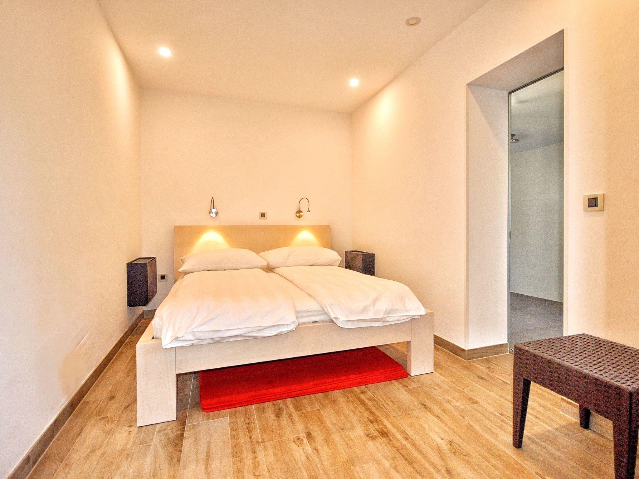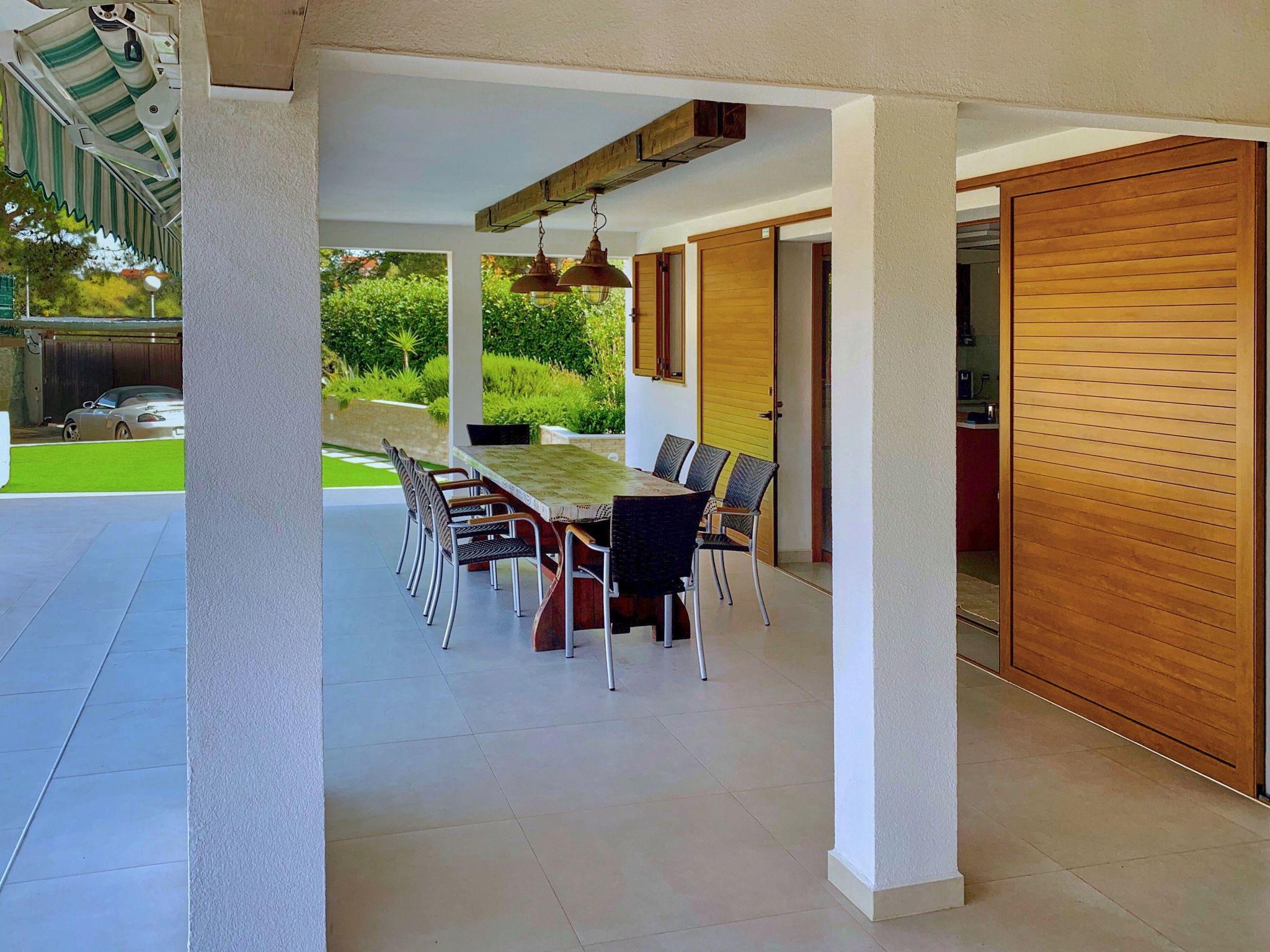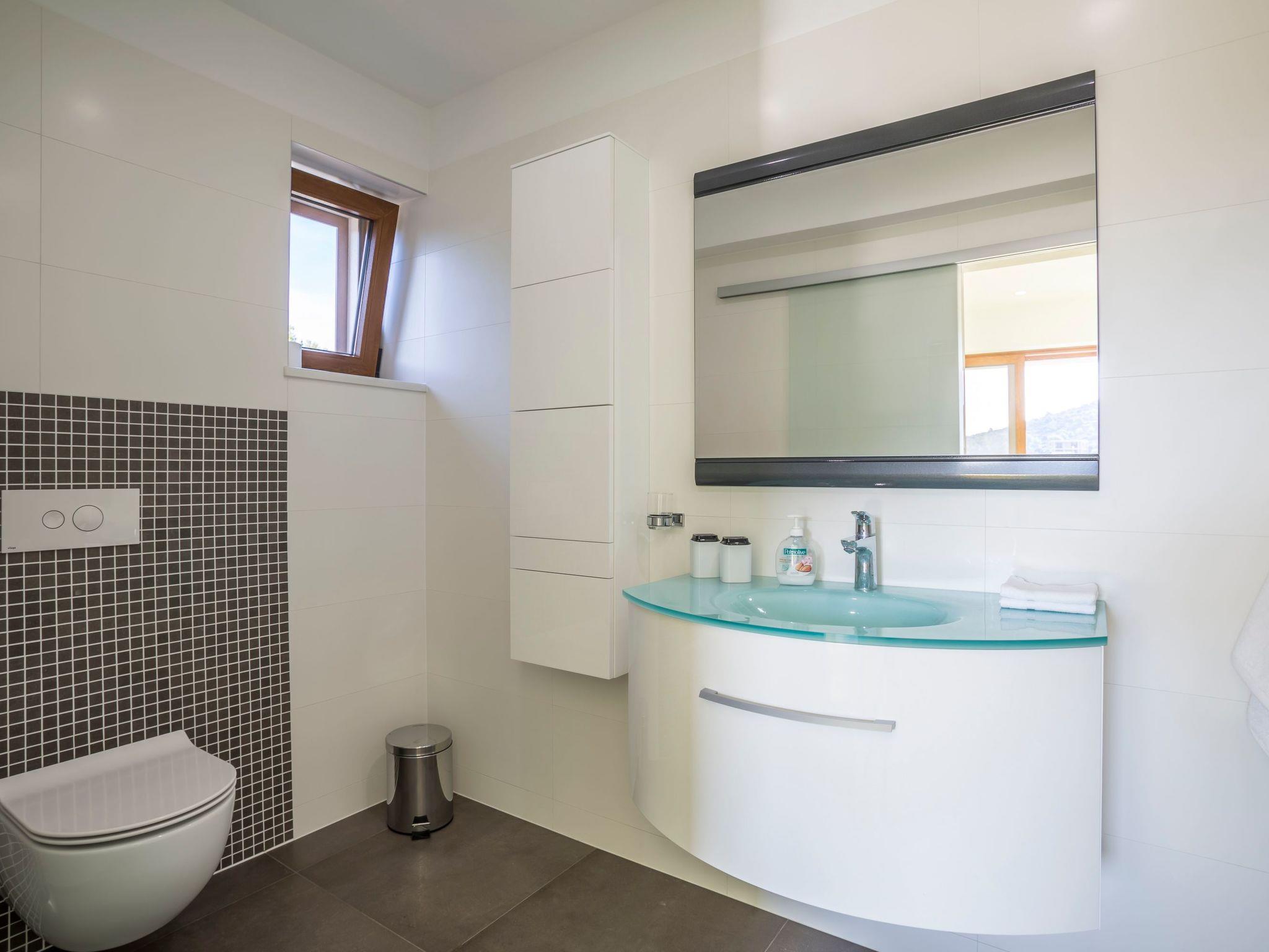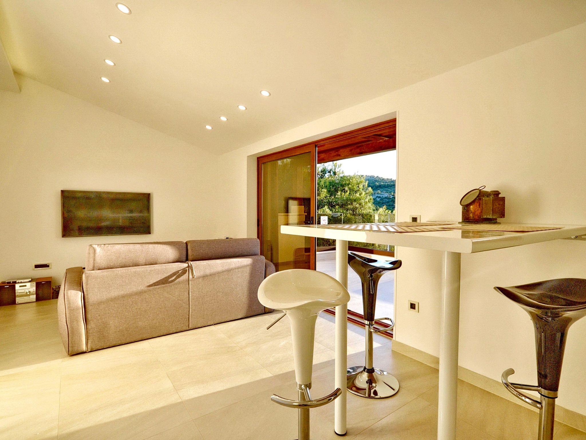 Each floor boasts a large terrace, so every guest can find their favourite place to relax and retreat. The views from the terraces are impressive. The site is enclosed by a stone wall. Children can play and run around on the lawn in the garden, while the infinity pool next to it provides fun and enjoyable moments for all ages. In front of the pool at ground level there is a 40m² terrace for relaxing outdoors. It has a large table where you can enjoy meals. An awning provides shelter from too much sun. The outdoor area by the pool can be illuminated at night. There are two car parking spaces on site.