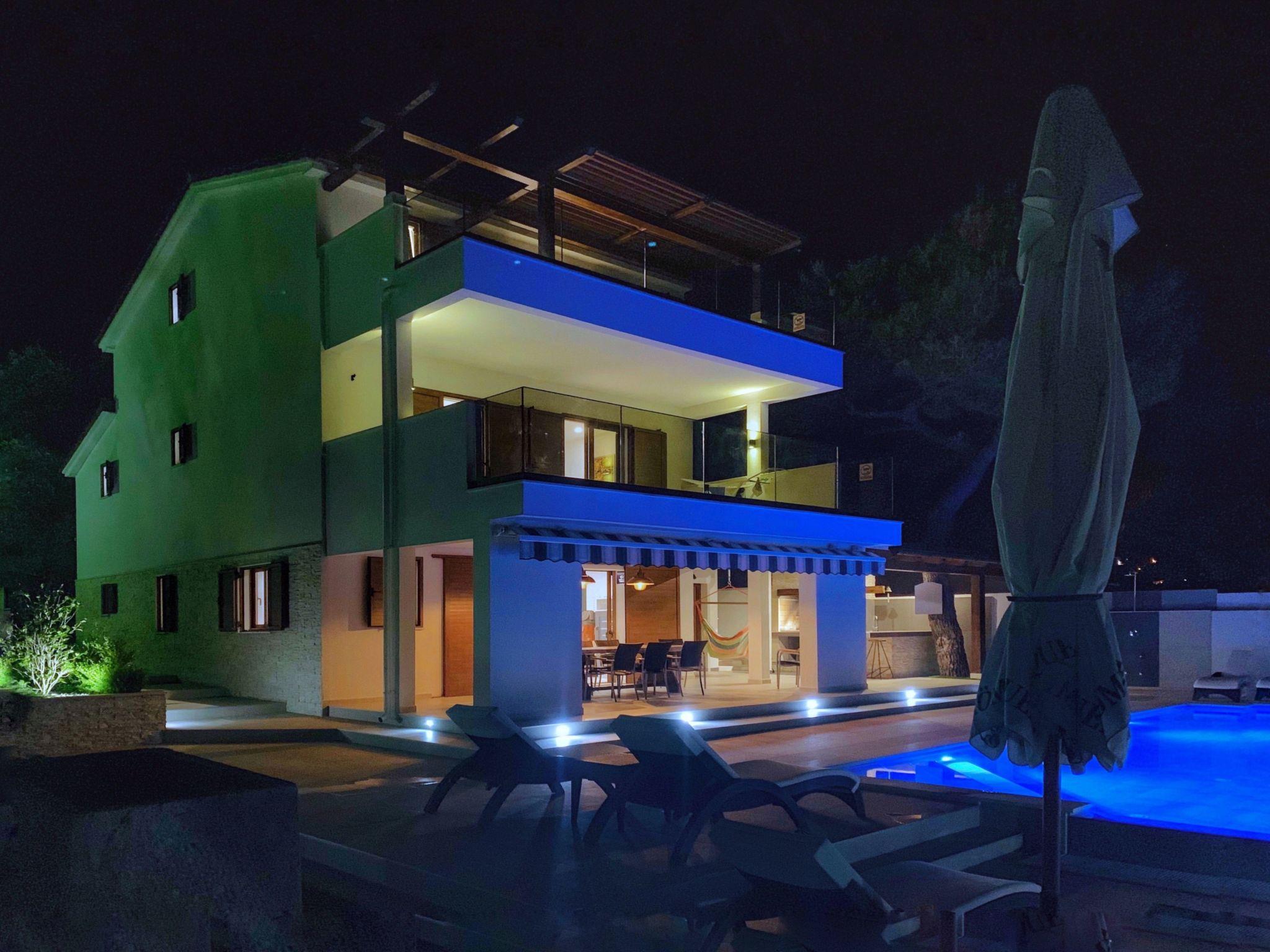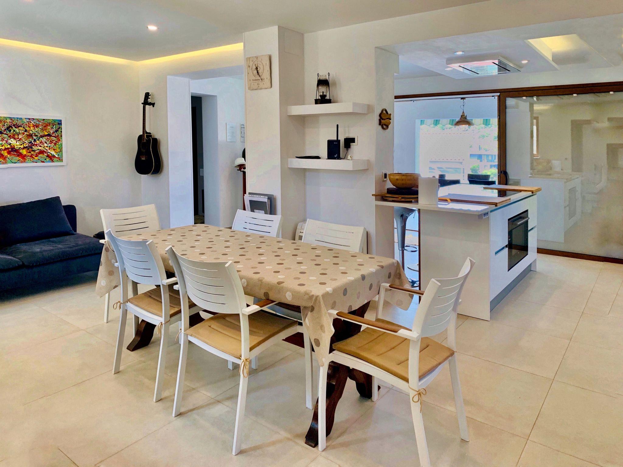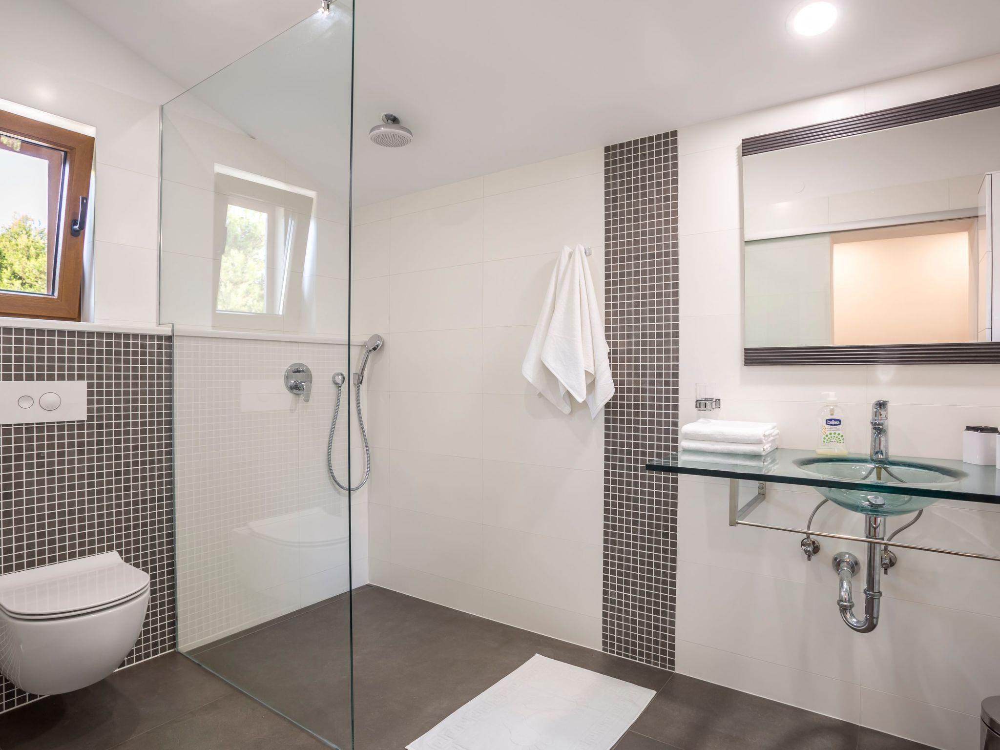 Each floor boasts a large terrace, so every guest can find their favourite place to relax and retreat. The views from the terraces are impressive. The site is enclosed by a stone wall. Children can play and run around on the lawn in the garden, while the infinity pool next to it provides fun and enjoyable moments for all ages. In front of the pool at ground level there is a 40m² terrace for relaxing outdoors. It has a large table where you can enjoy meals. An awning provides shelter from too much sun. The outdoor area by the pool can be illuminated at night. There are two car parking spaces on site.