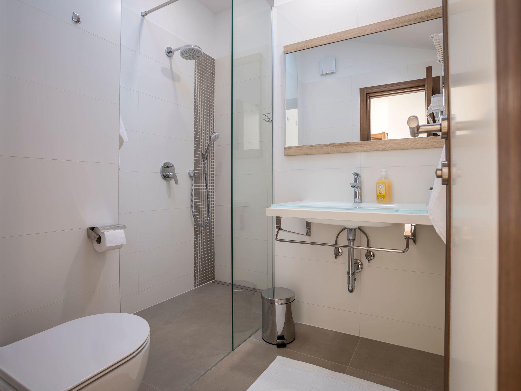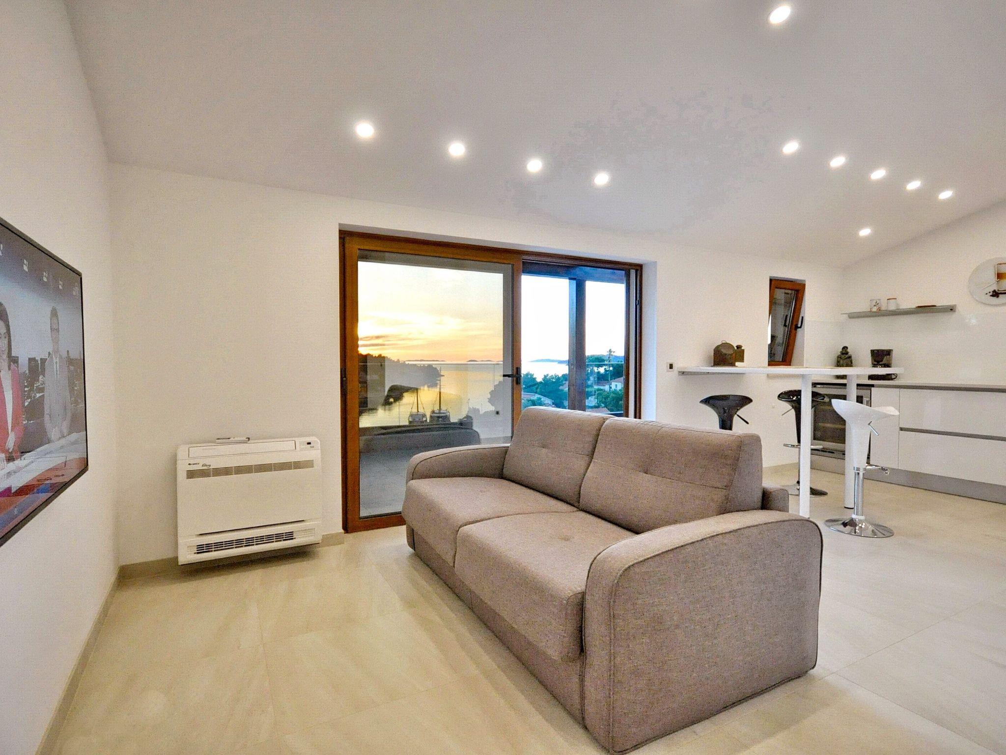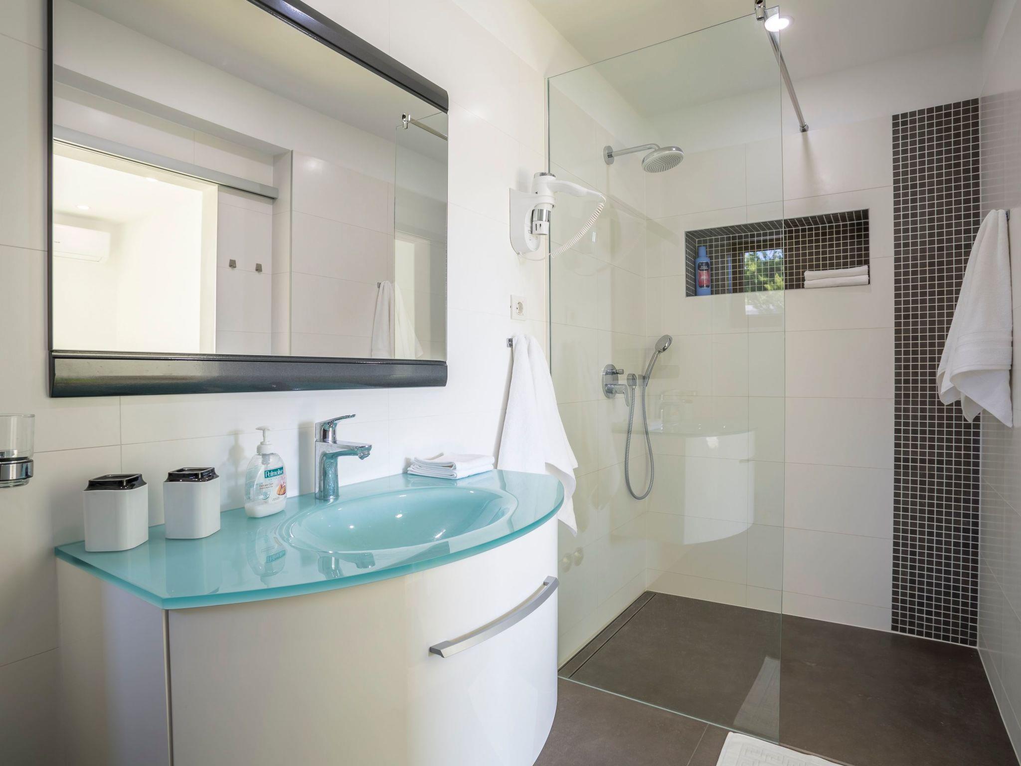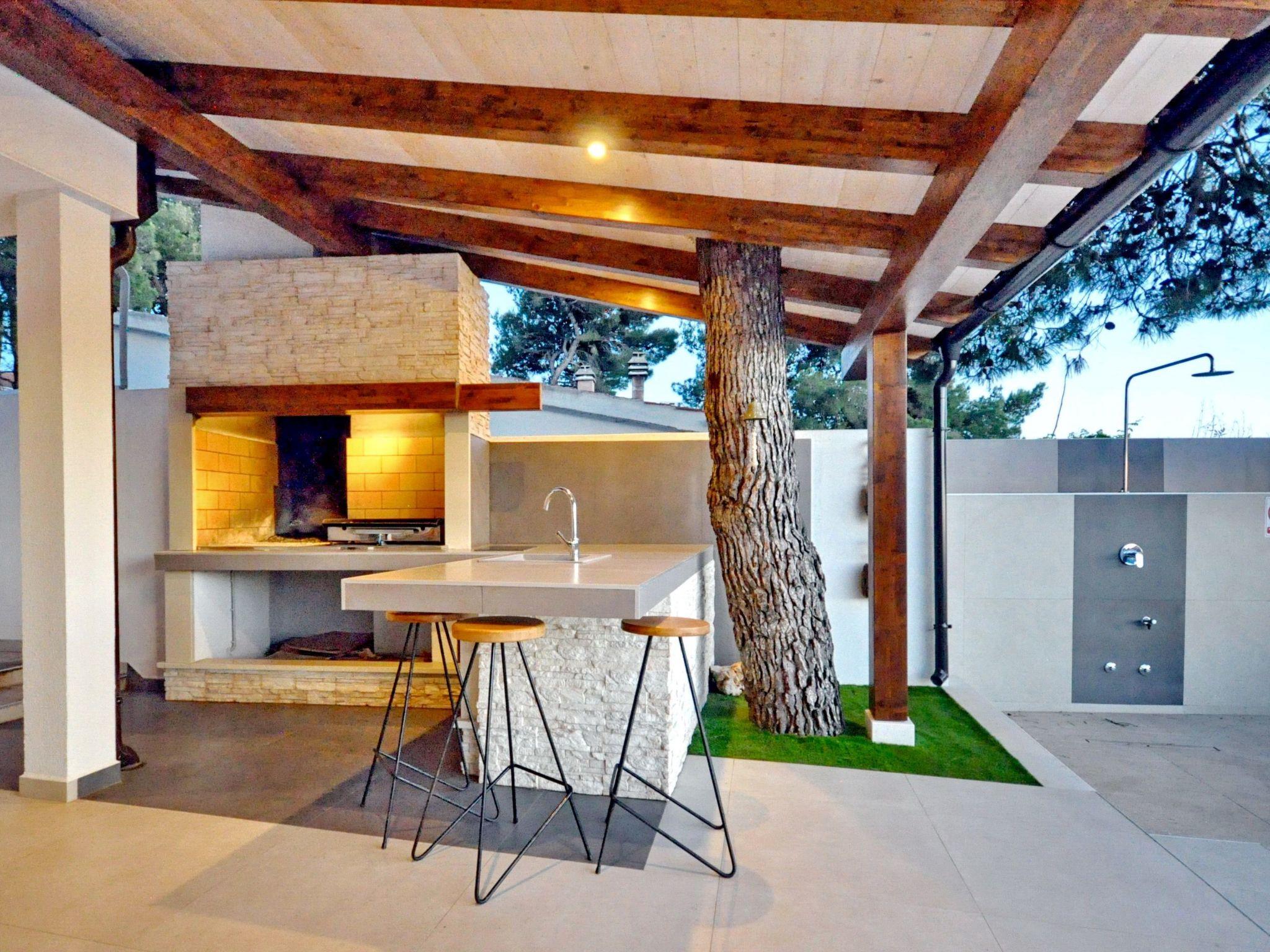 Each floor boasts a large terrace, so every guest can find their favourite place to relax and retreat. The views from the terraces are impressive. The site is enclosed by a stone wall. Children can play and run around on the lawn in the garden, while the infinity pool next to it provides fun and enjoyable moments for all ages. In front of the pool at ground level there is a 40m² terrace for relaxing outdoors. It has a large table where you can enjoy meals. An awning provides shelter from too much sun. The outdoor area by the pool can be illuminated at night. There are two car parking spaces on site.
