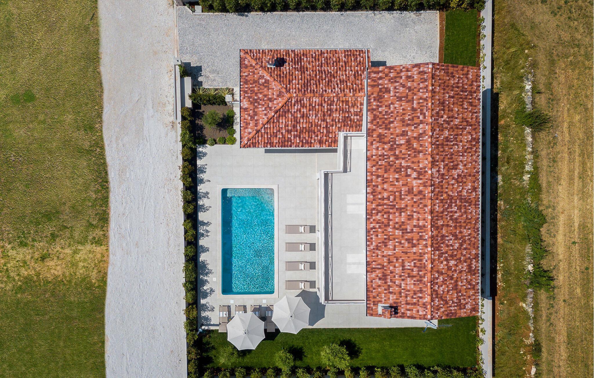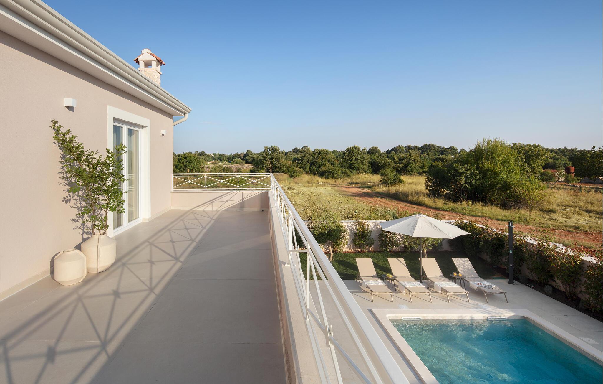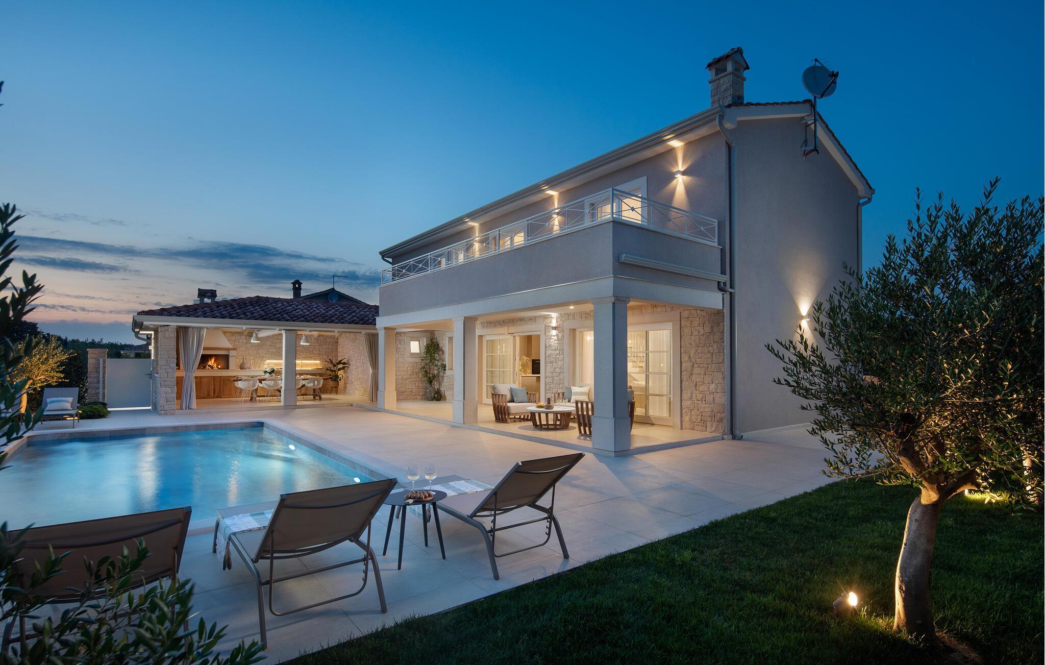 Jeres feriehus ligger ikke langt fra Rovinj og byder på nogle gode muligheder for en afslappende ferie. Husets absolutte højdepunkt er den store, private pool med liggestole, hvor I kan slappe af i den skyggefulde del af terrassen. Lige ved siden af jeres feriehus finder I et overdækket spiseområde med spisebord og et udendørskøkken. Indretningen har et strejf af luksus og byder på en behagelig ferie sammen med familien eller vennerne. Derudover byder huset på en smuk udsigt over det omkringliggende landskab.