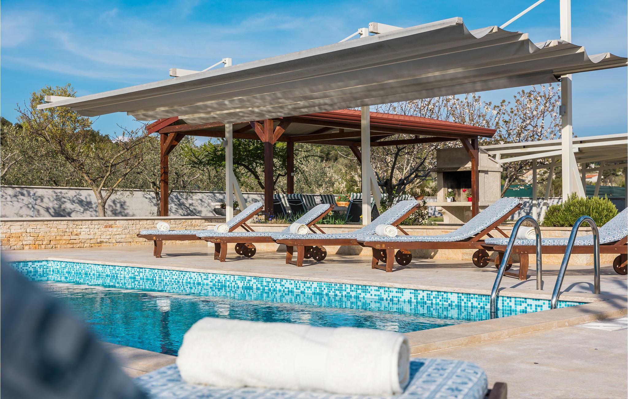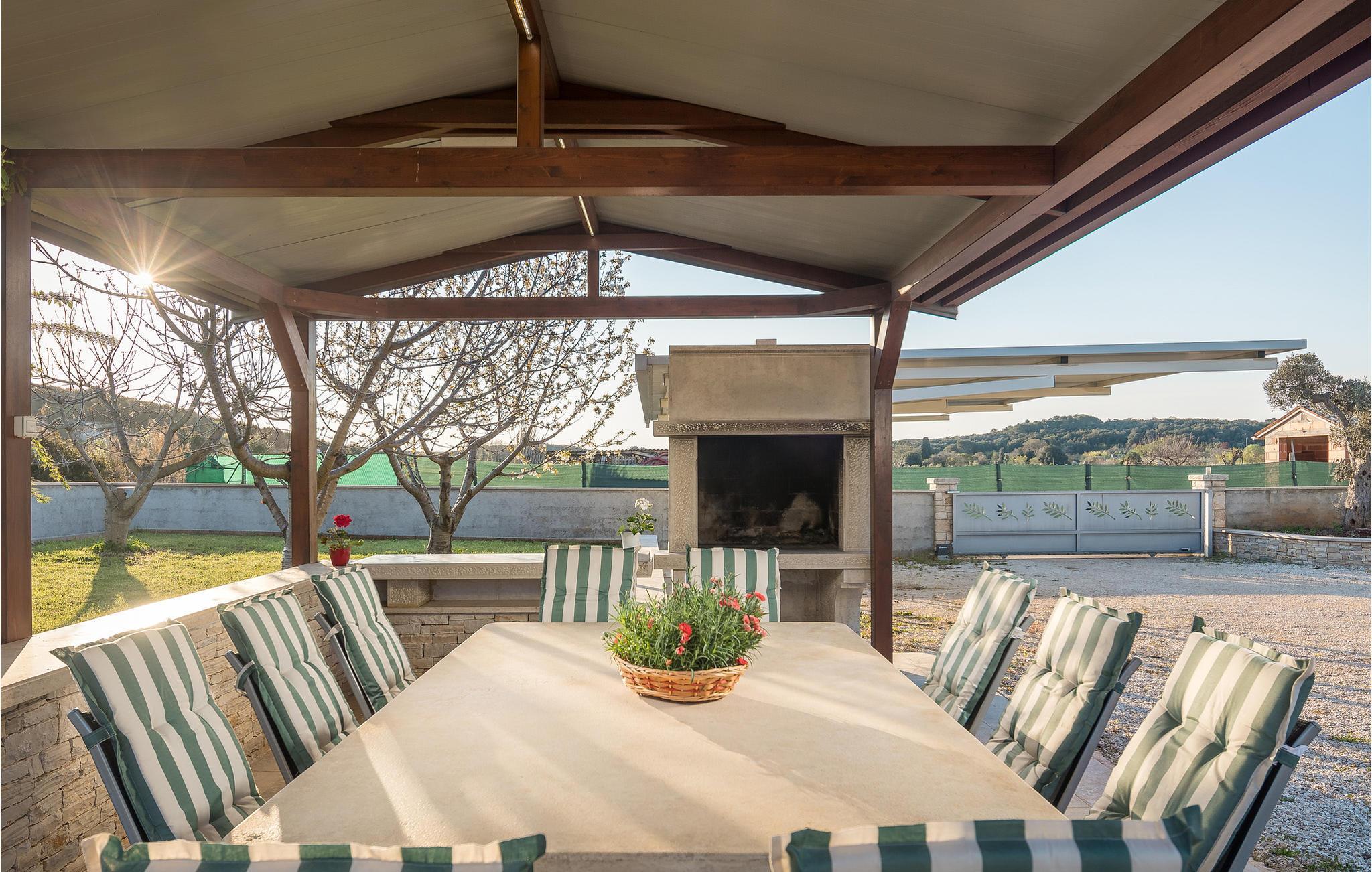 I den indhegnede gård ligger der ved siden af poolen en overdækket terrasse. Her er udekøkkenet, et bord og stole anbragt. En skønt, skyggefuldt miljø til at spise grillmad sammen. Nyd jeres fritid med billard, dart og bordfodbold. Fem minutters gang væk ligger de skønne stenstrande og de naturlige sandstrande ved Rovinj.