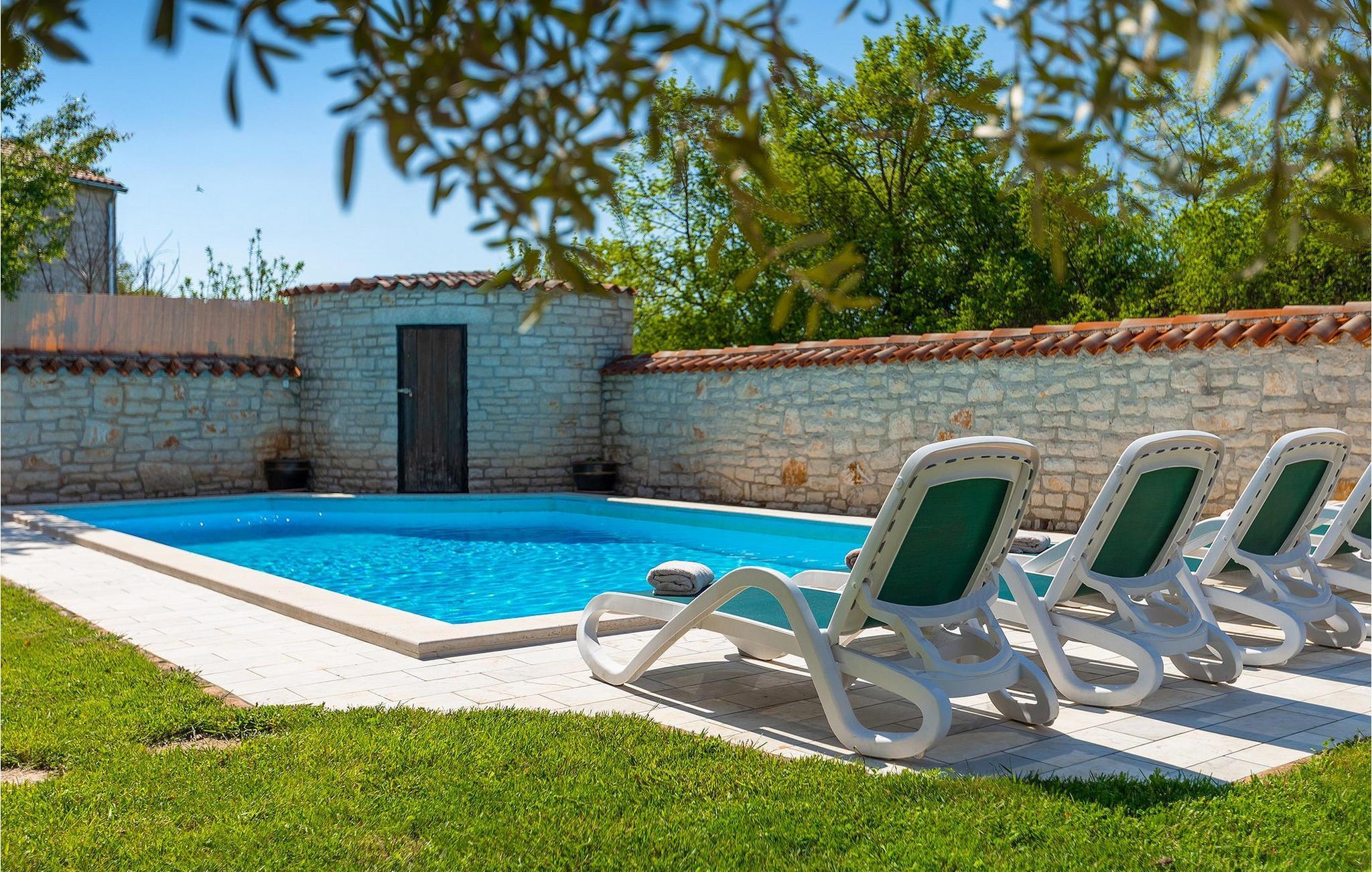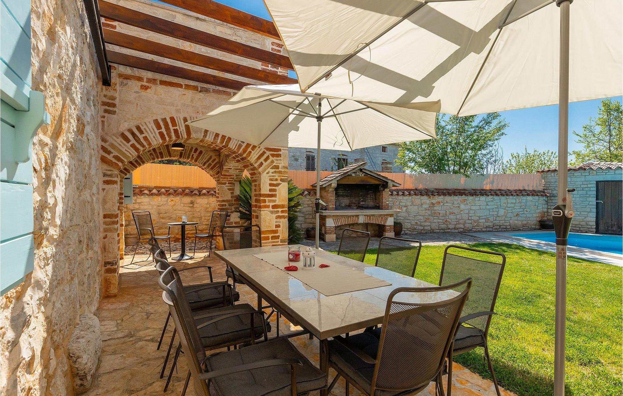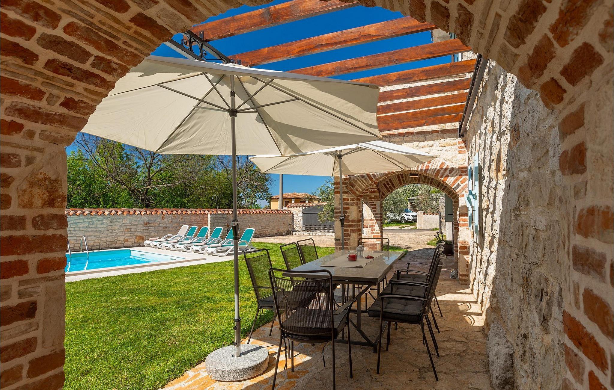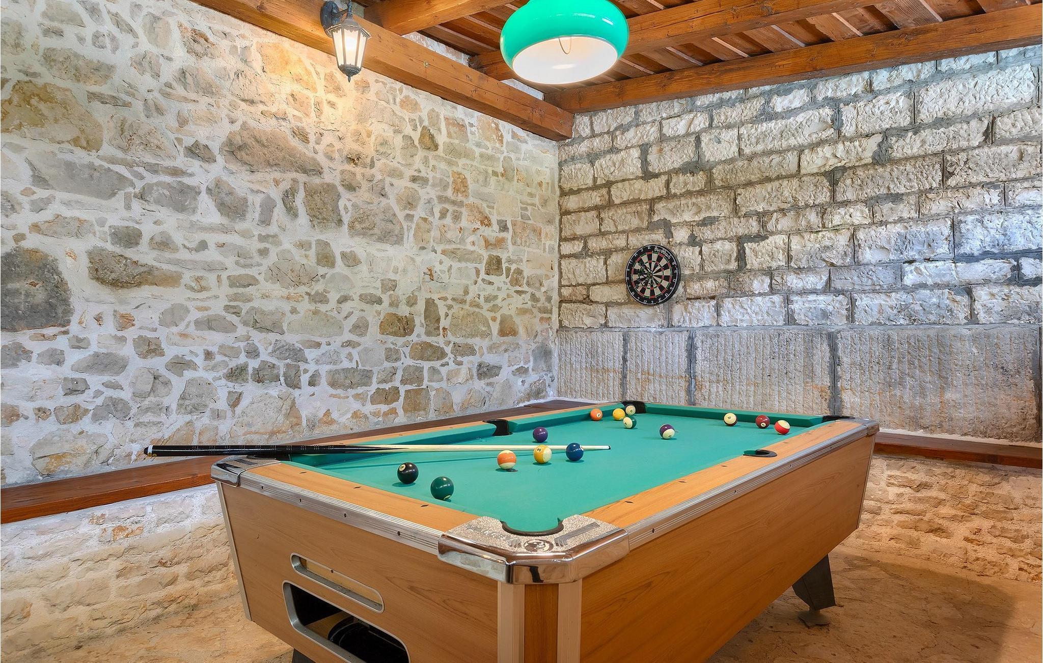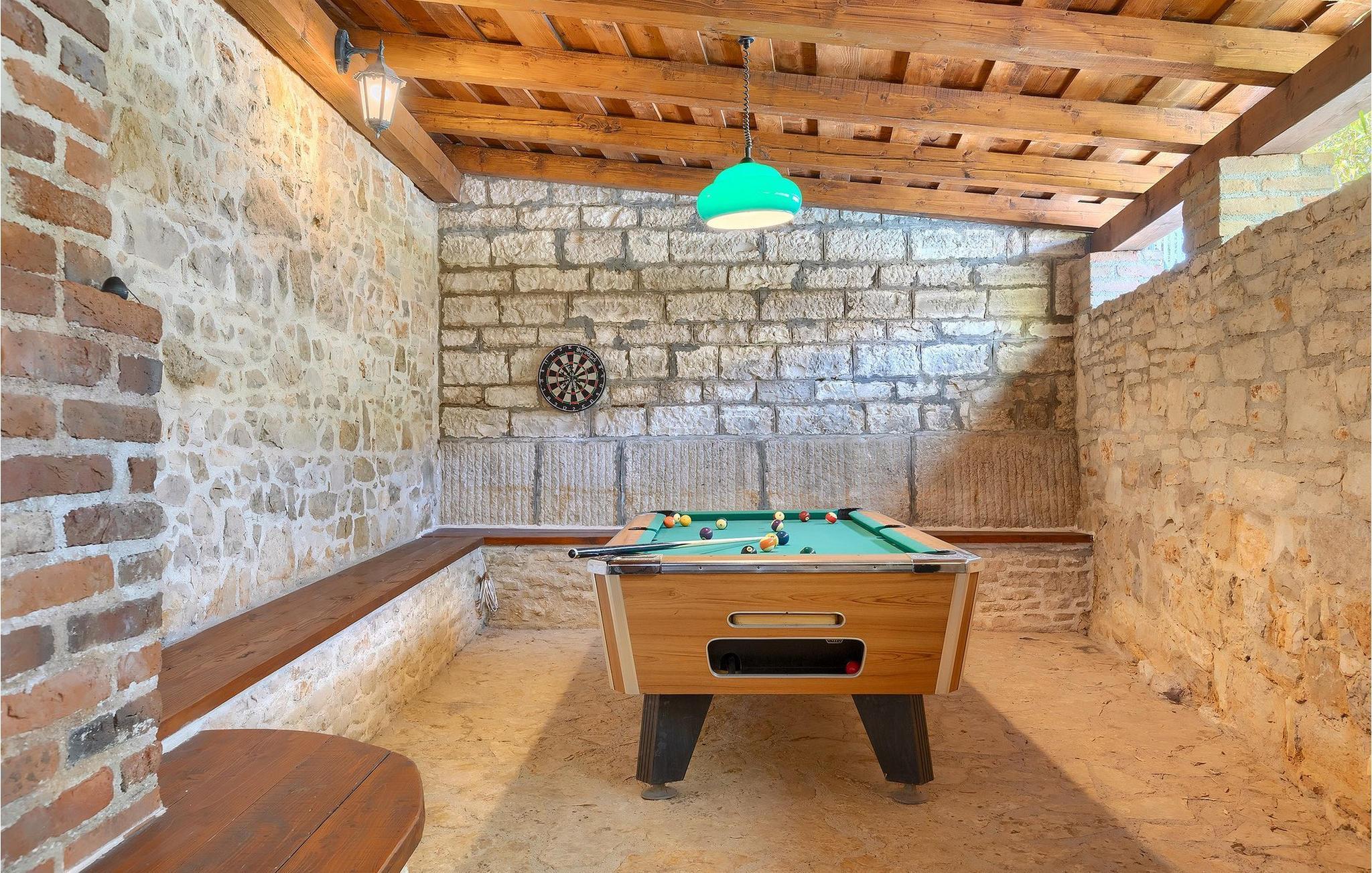 Von Sonnenaufgang bis zum -untergang übers Meer haben Sie den ganzen Tag die istrische Sonne zu Gast. Erfrischen Sie sich im attraktiven privaten Pool und lassen Sie sich auf den bequemen Liegestühlen von der Sonne trocknen. Auf der erstaunlichen Terrasse finden Sie auch einen überdachen Essbereich, wo sich ein leckeres Gericht mit den Liebsten genießen lässt. Auf der Rückseite des Hauses finden Sie zudem einen überdachten Bereich mit Tischfußball und Billardtisch.