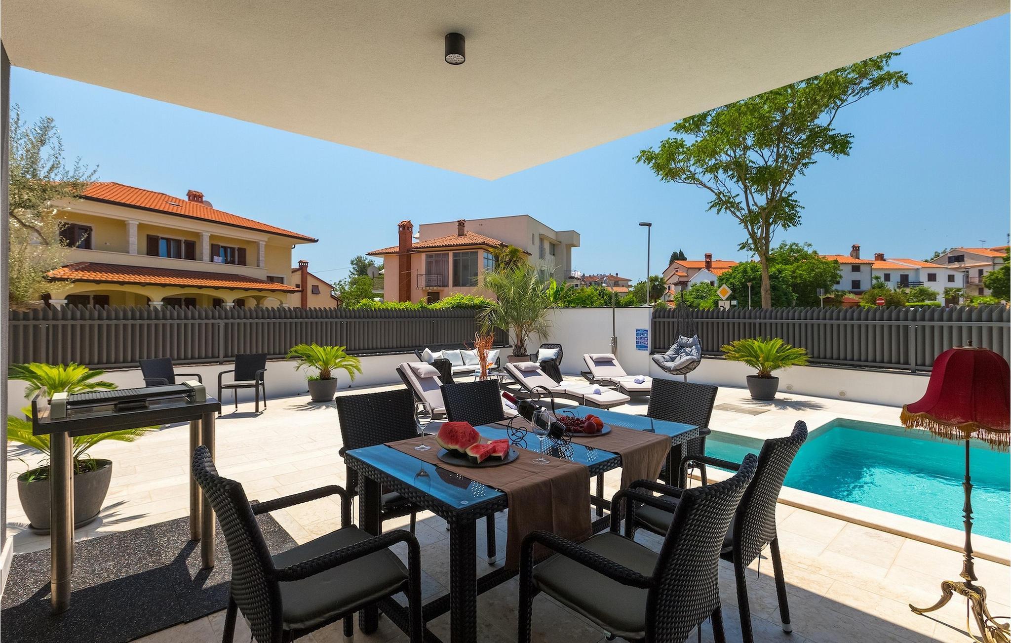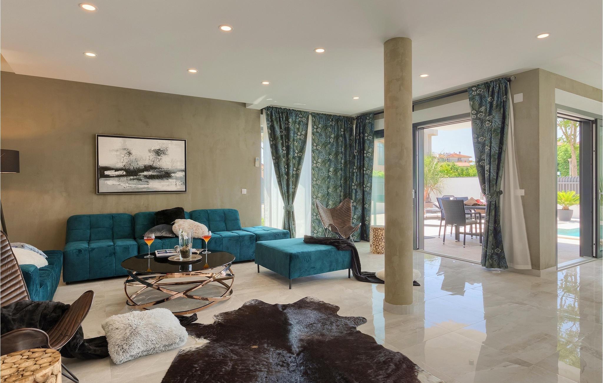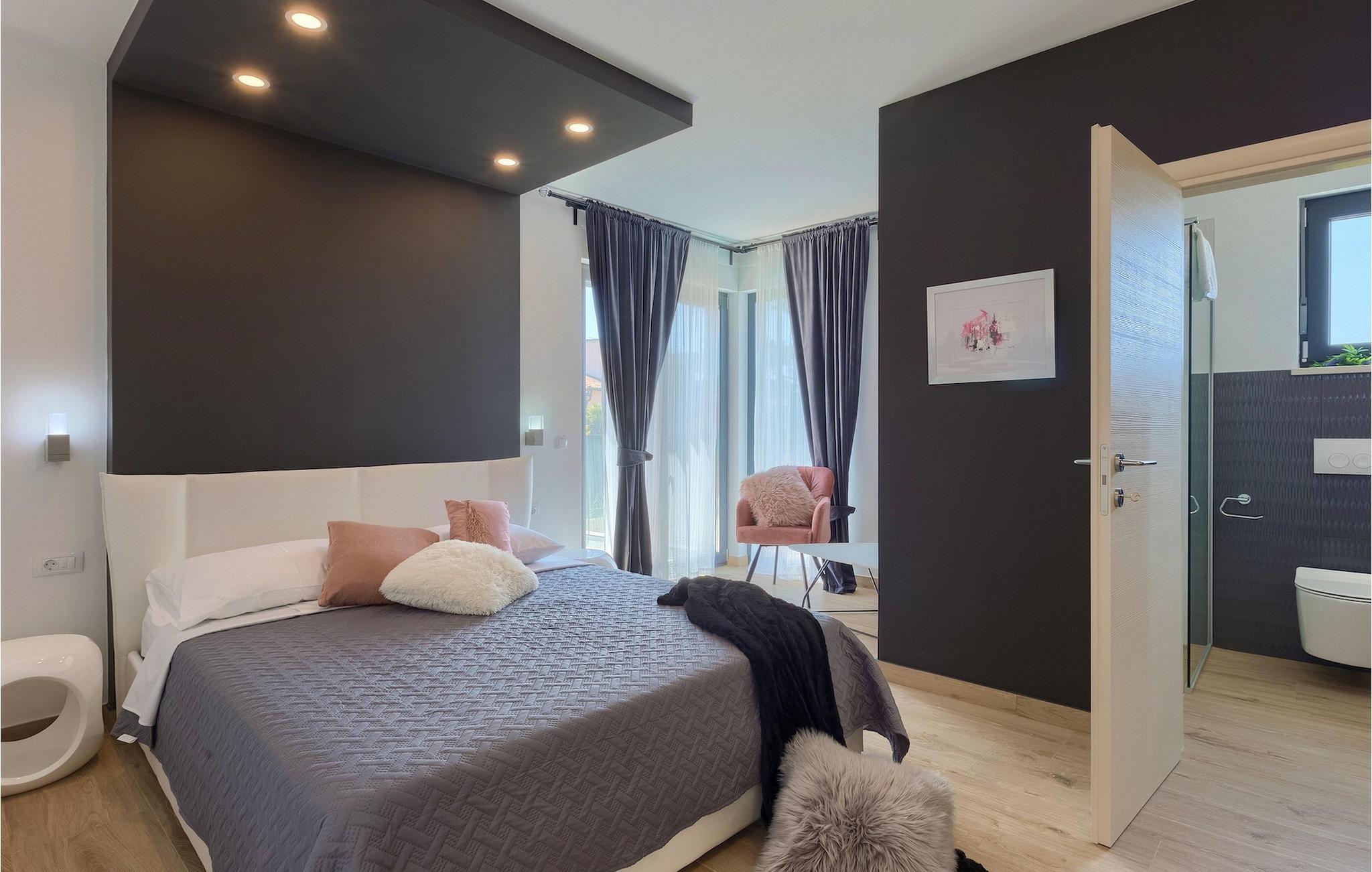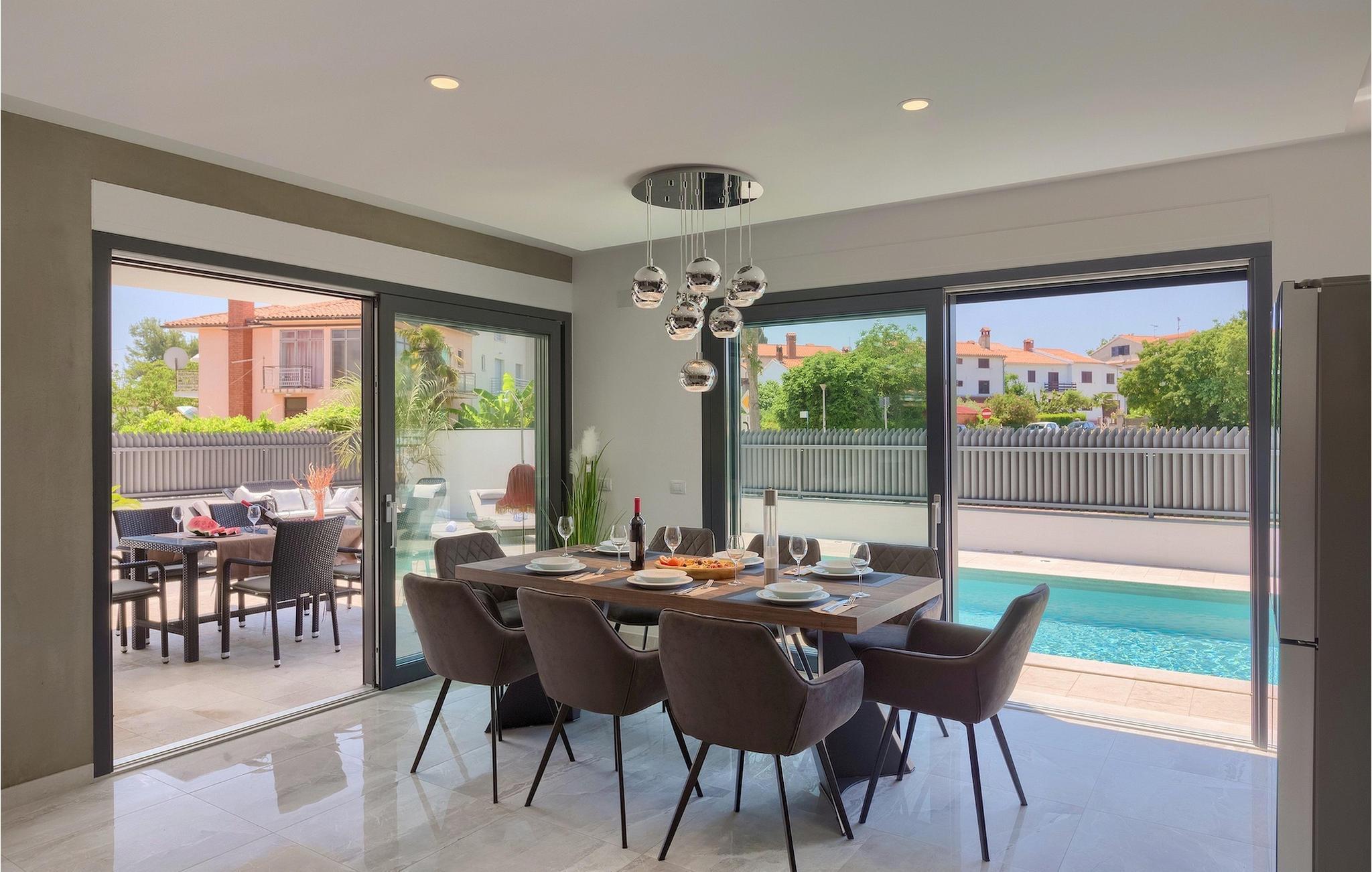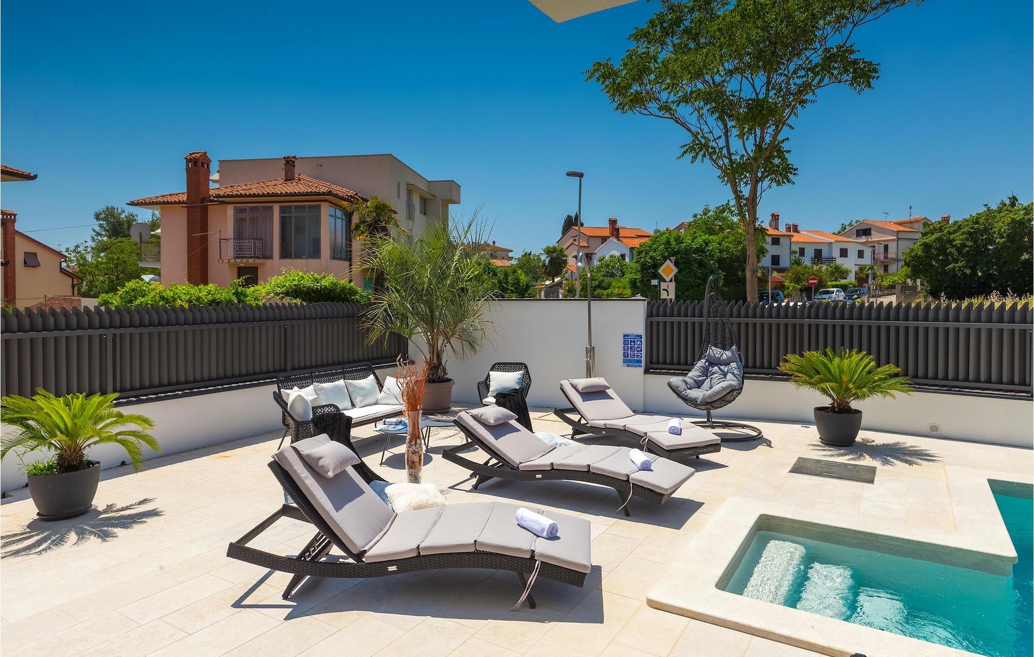 Drømmer du om en afslappet ferie i en designervilla tæt på en turistby og vidunderlige strande? Så er Villa Orion lige perfekt for dig! Denne smukke, moderne villa tilbyder ikke kun et eksklusivt interiør, men også adskillige ekstra aktiviteter til afslapning som den finske sauna eller jacuzzien placeret i wellness-området i villaens stueetage. Her finder du også en åbent konceptstue i blå stil forbundet med spisestuen og et moderne, fuldt udstyret køkken. Mens I spiser sammen, kan I overse den indbydende swimmingpool kun få skridt fra jer. Du kan også spise udendørs og bruge grillen. Udendørsområdet byder på en masse havemøbler og liggestole til at slappe af ved siden af den private pool. På 1. salen kan du finde dejlige møblerede soveværelser med elegante detaljer og nutidige malerier i skønne farvekombinationer. Hvert soveværelse har eget badeværelse, og fra to soveværelser kan du komme ind på balkonen, ideel til din første morgenkaffe. Villa Orion vil forkæle dig med dets utrolige interiør og gode afslapningsmuligheder, alt dette mens du nyder din ferie tæt på havet og byen Rovinj!