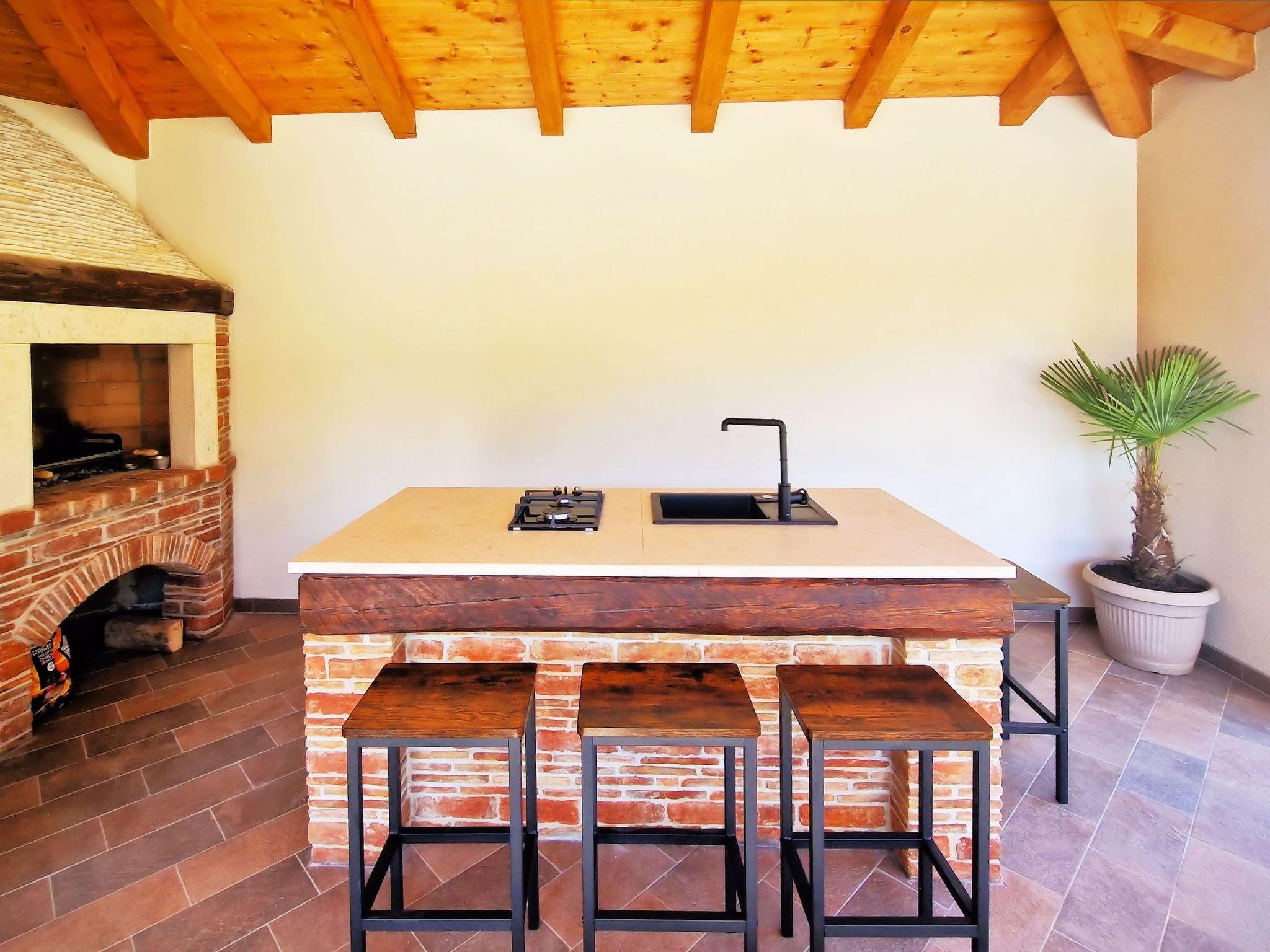 Step outside to discover your personal oasis. The villa features an 8.5-meter long swimming pool for your exclusive enjoyment, complemented by a charming outdoor kitchen with a fireplace, perfect for al fresco dining and entertainment. The garden, reserved solely for your use, spreads around the house offering a generous space for relaxation and outdoor activities. A private parking area ensures ease and security for your vehicle during your stay.